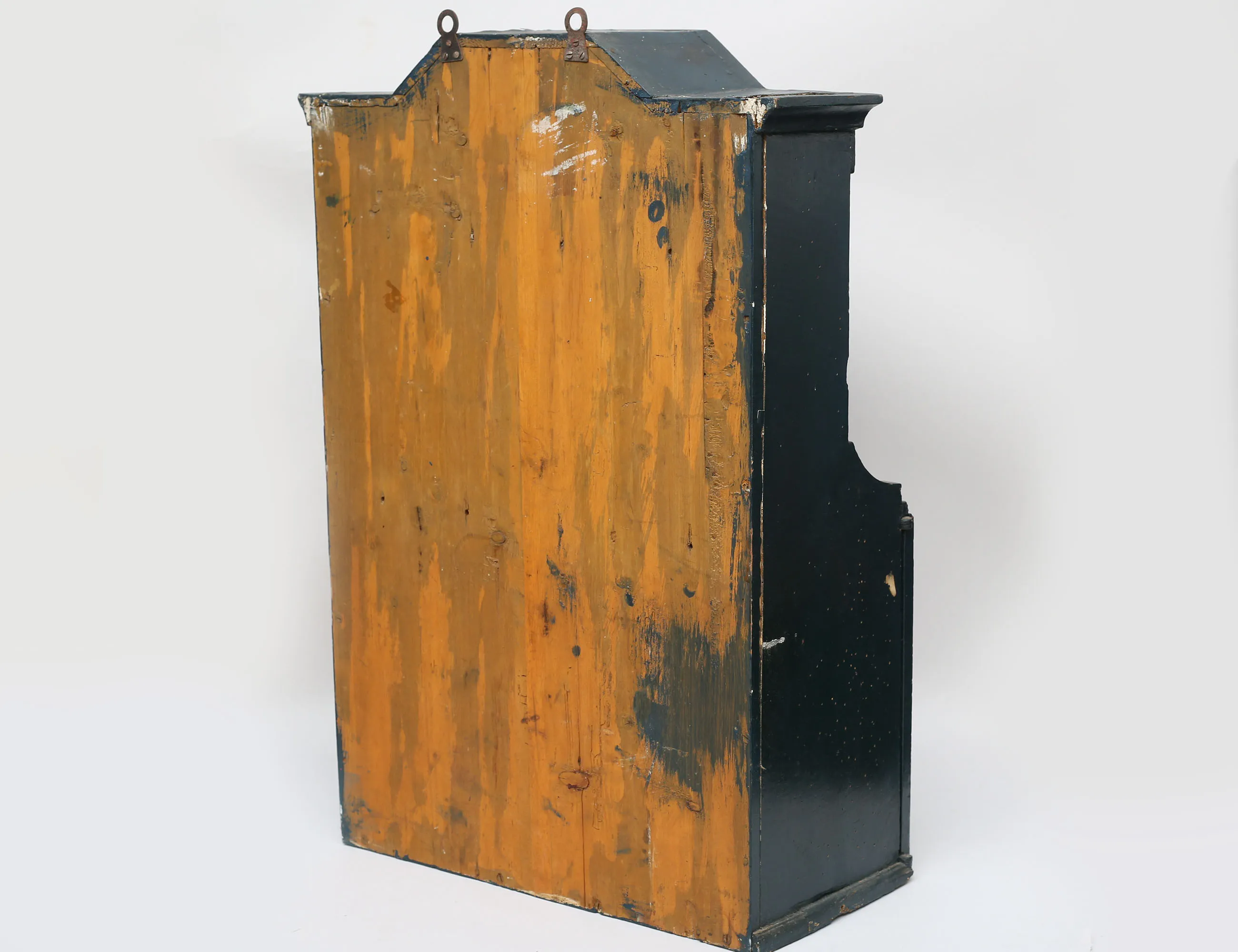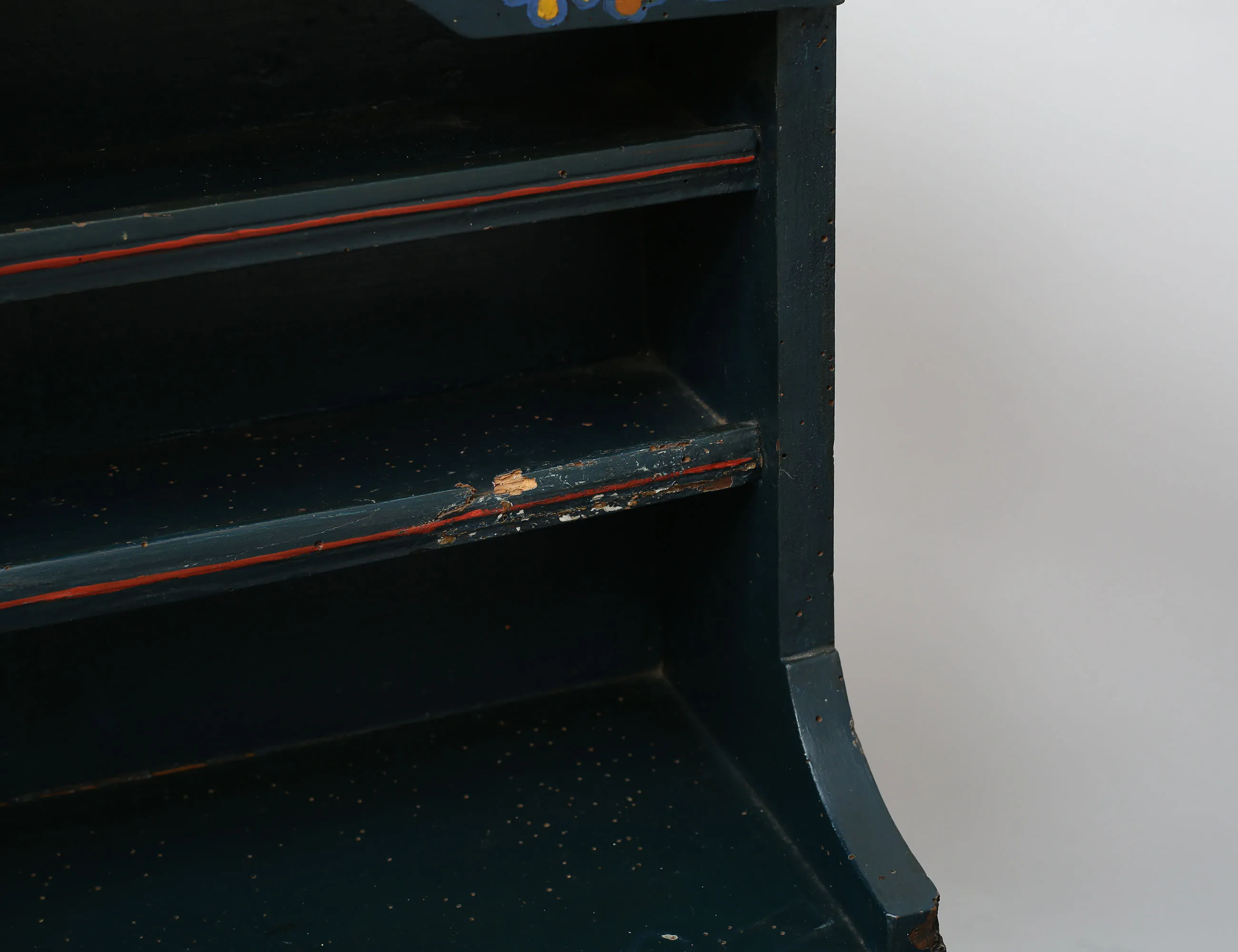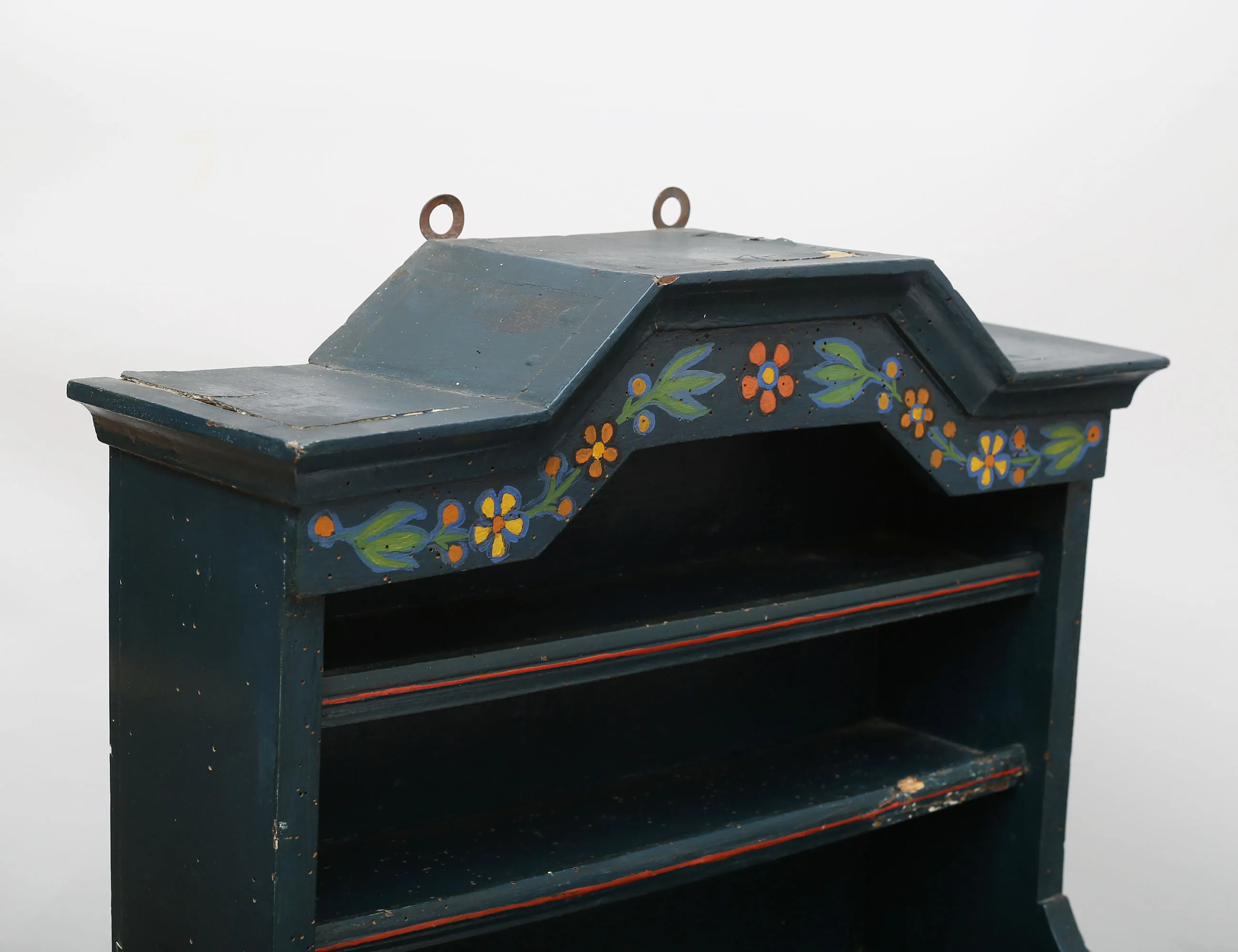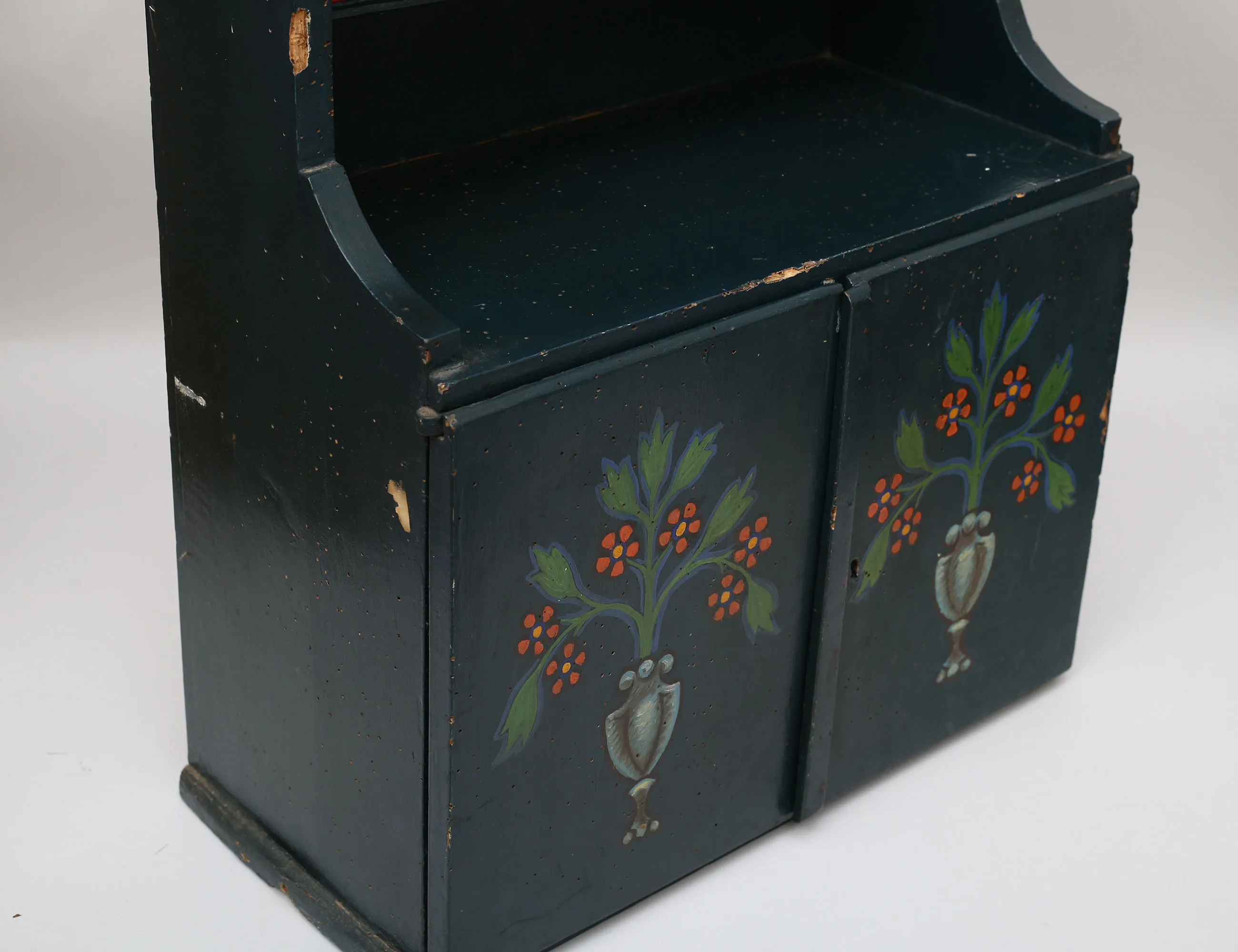 uppsvängt krön, två hyllplan, ett dörrpar, bemålat med blomdekor, höjd 70, bredd 49, djup 23 (orangrepp, skador, nyckel saknas)