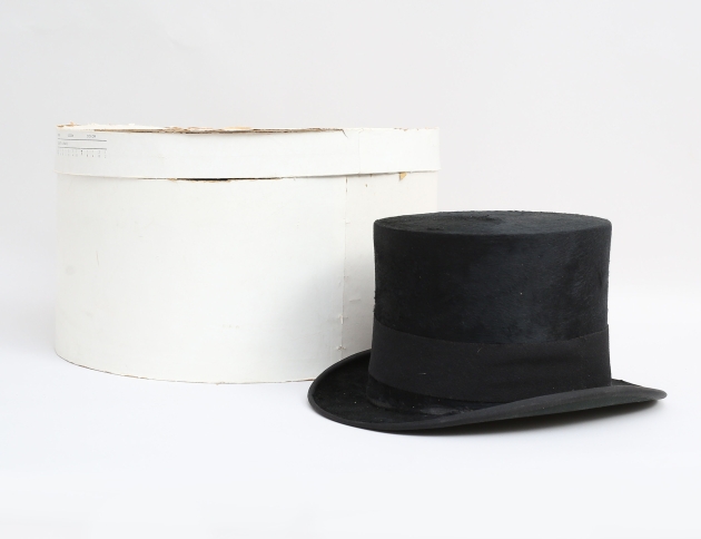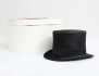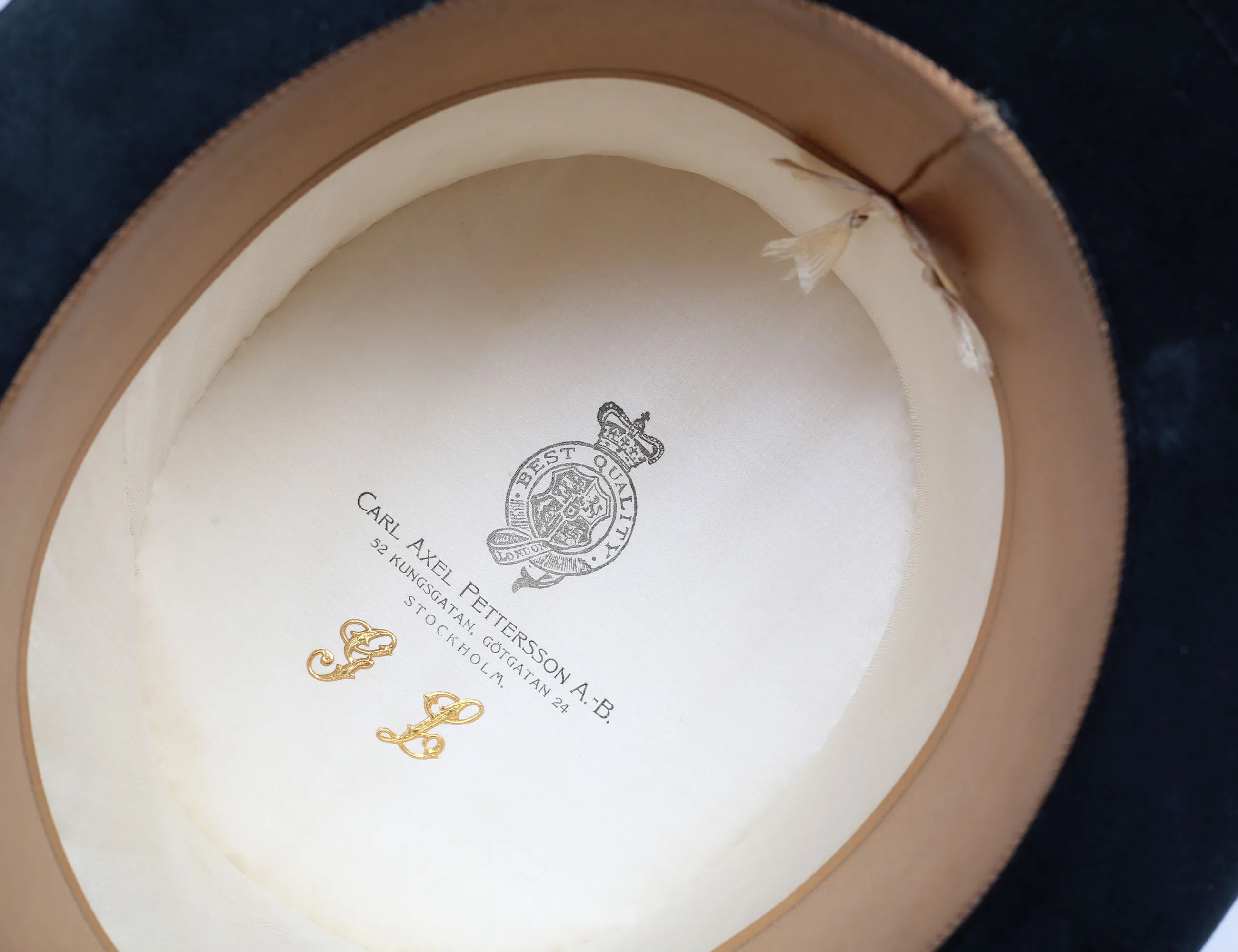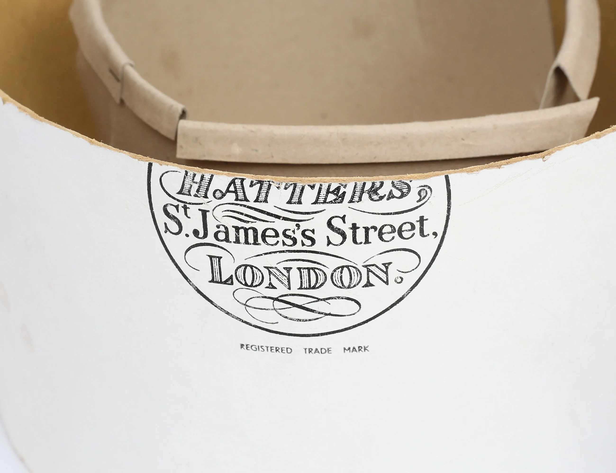 såld genom Carl Axel Pettersson AB Stockholm, samt monogram i guldtext, hattask från Hatters St James Street London, storlek ca. 58 (hattask med slitage)