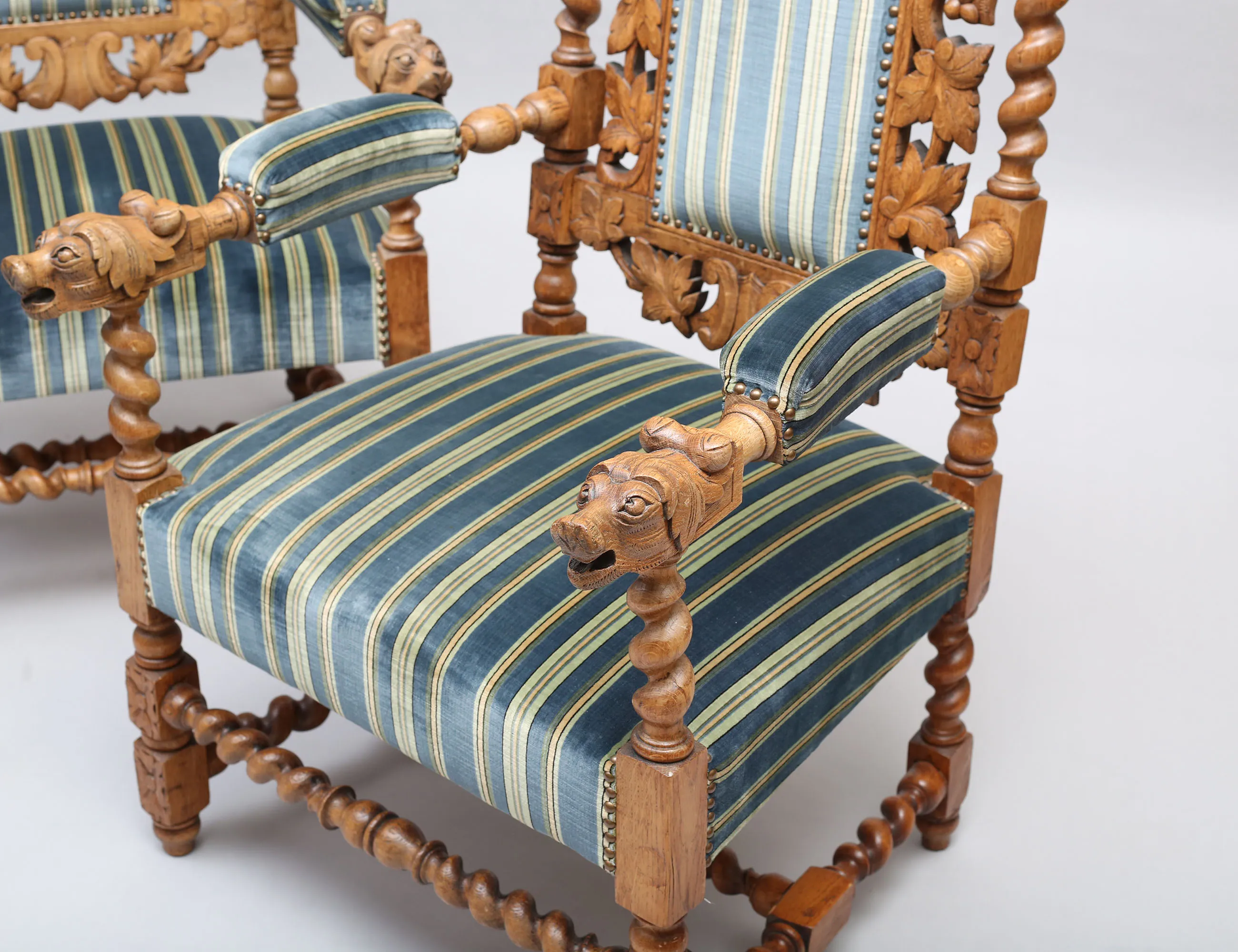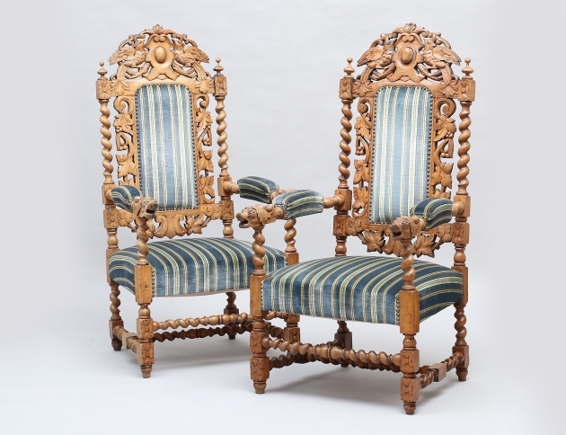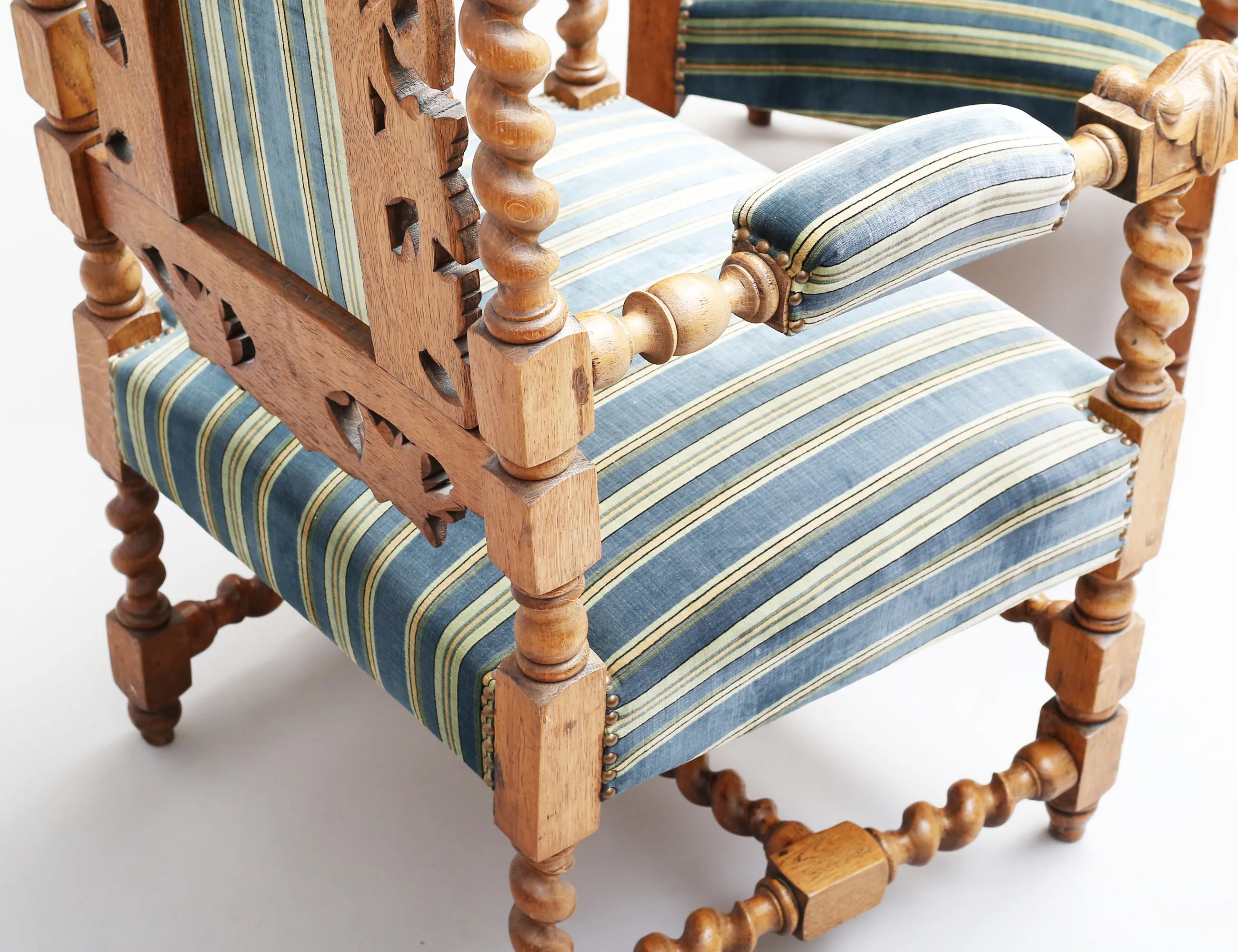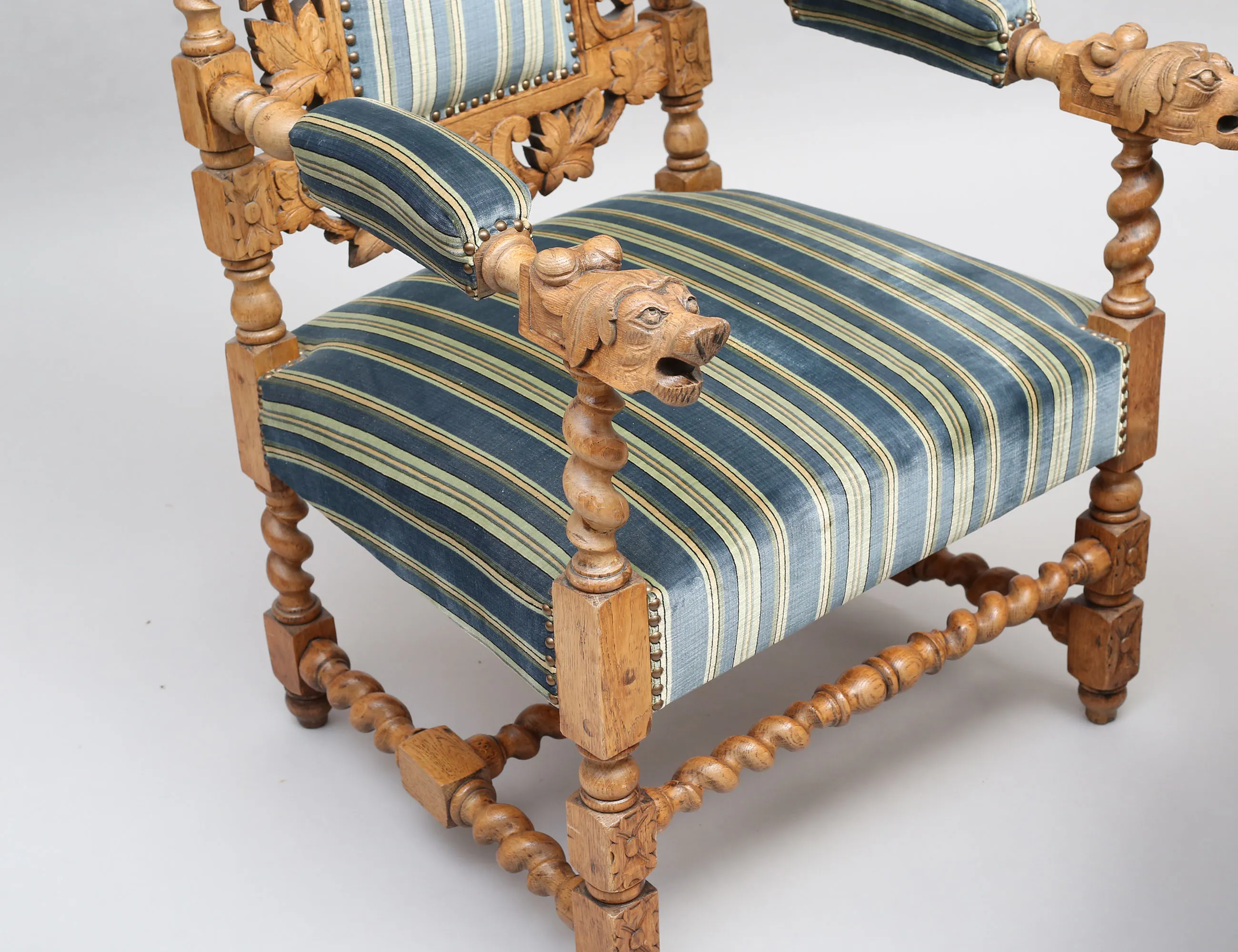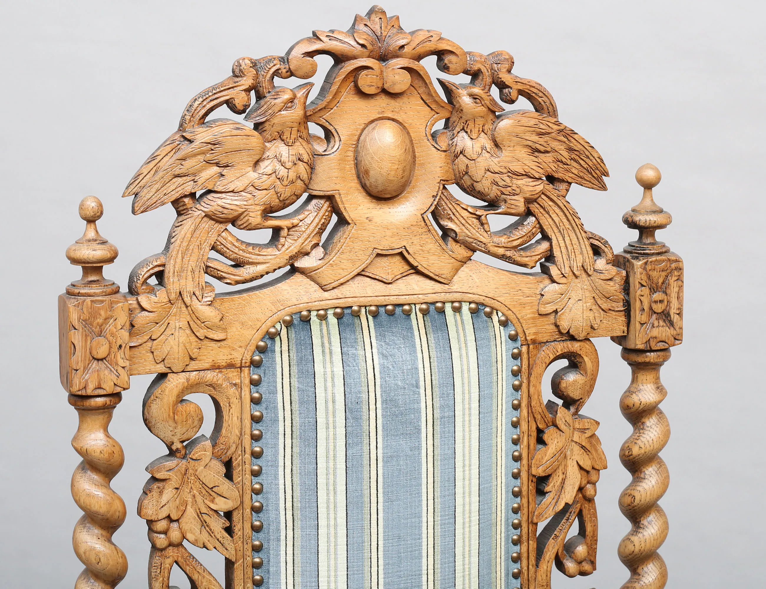 tidigt 1900-tal, ek, rikt träskuren delvis genombruten dekor, fast stoppad sits , rygg och armlän, höjd 130, bredd 65