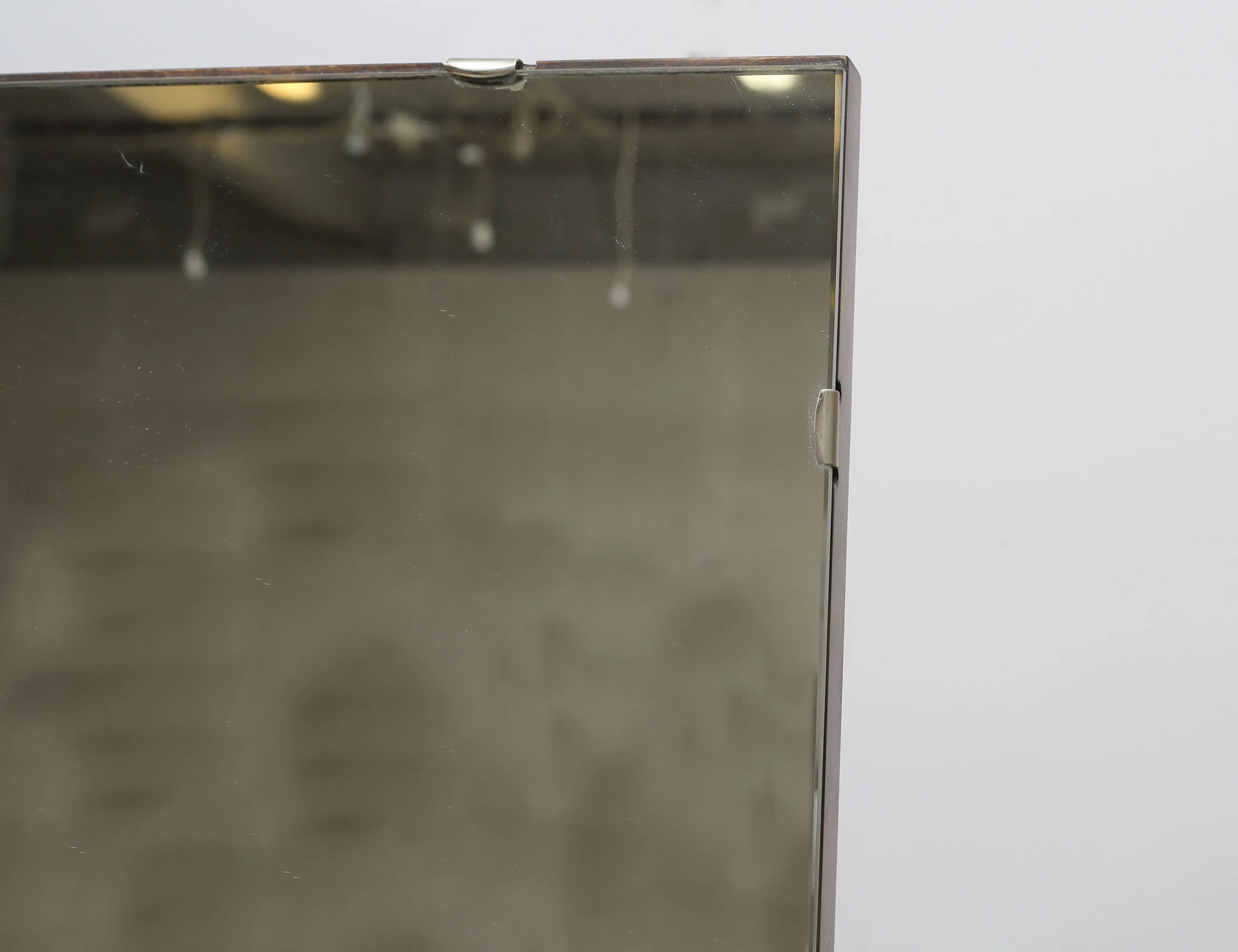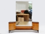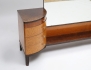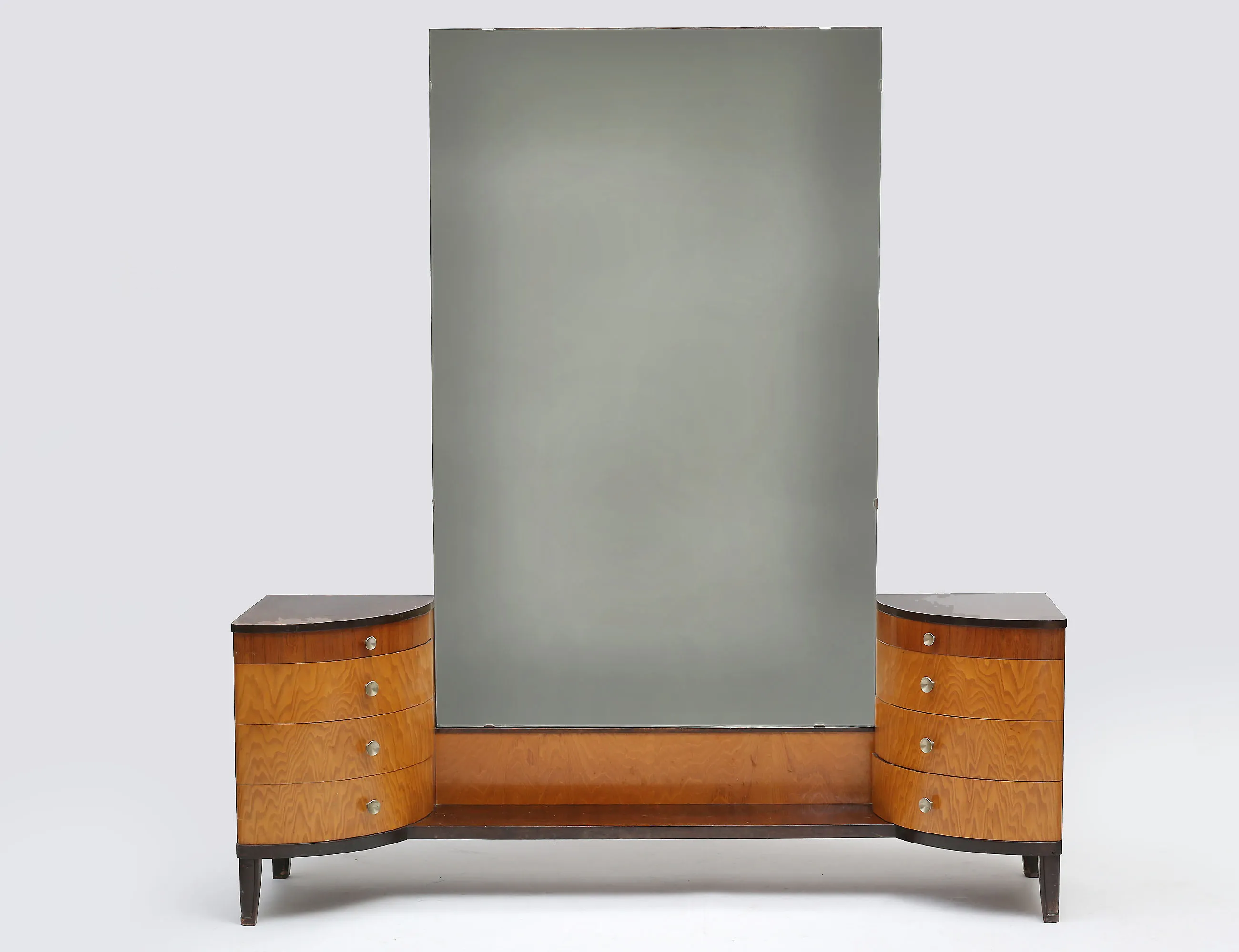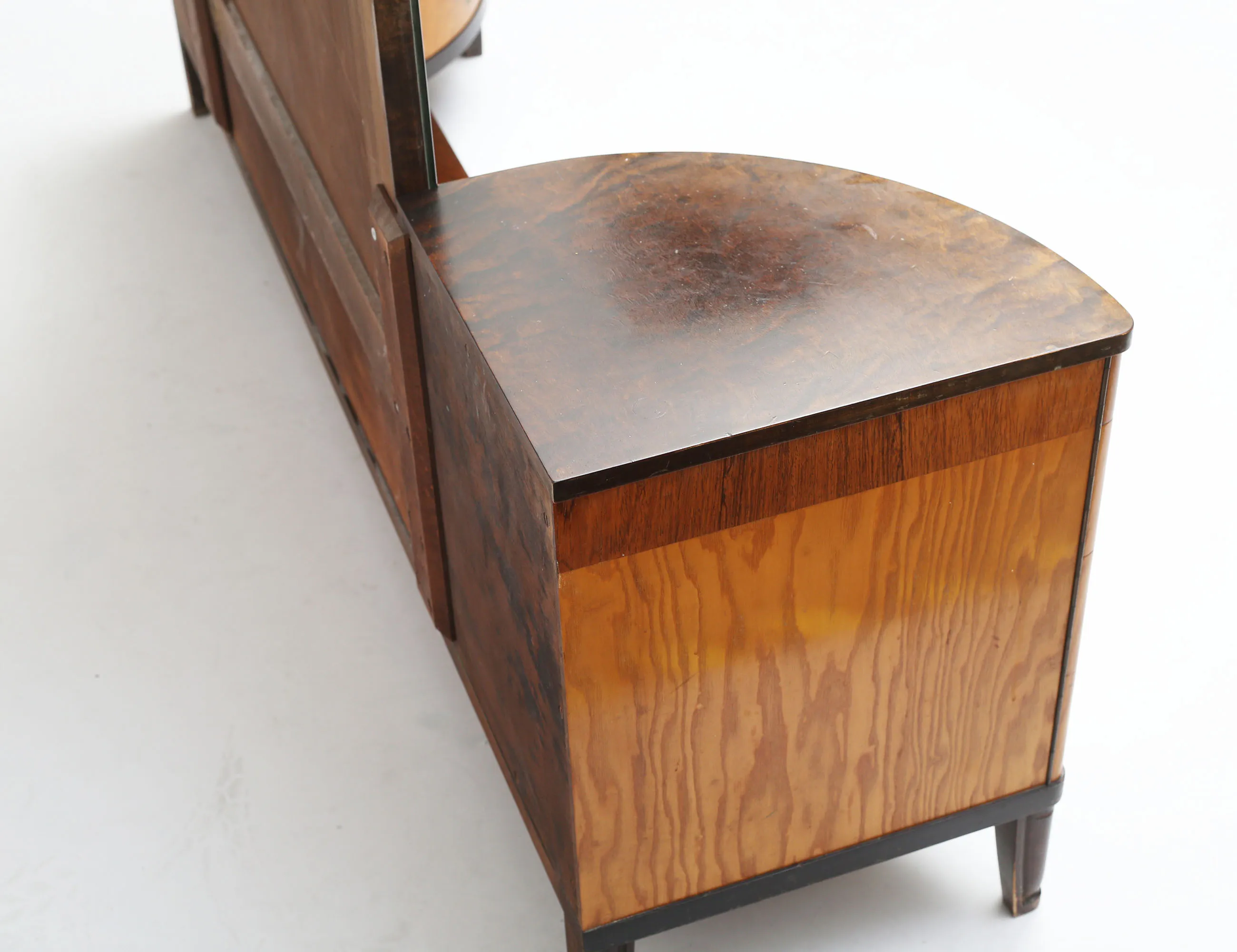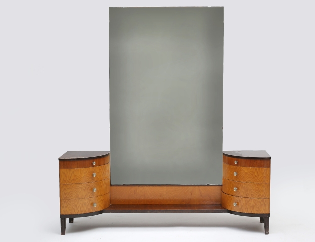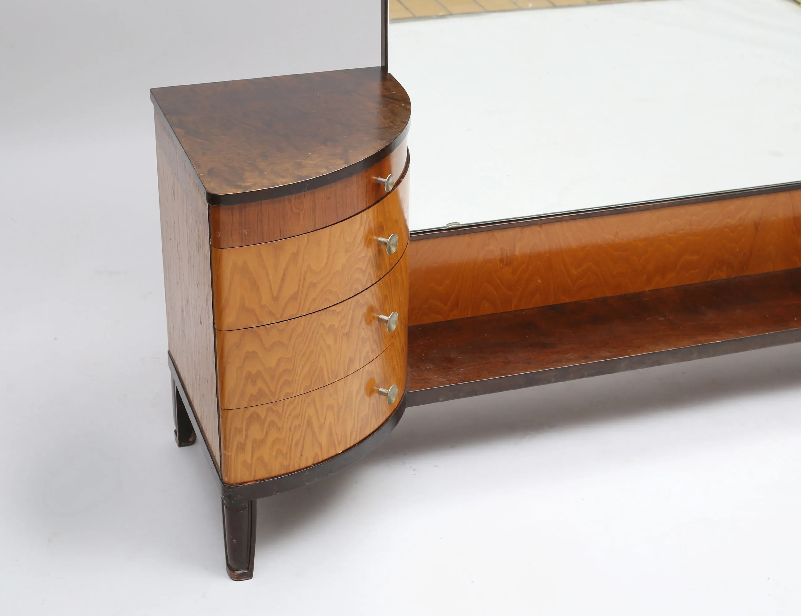 fanerad i brunbetsad flambjörk och valnöt, dragknoppar i mässing, vardera sida med utsvängbara lådor, mittdel med spegel och hylla, höjd 172, bredd 160, djup 40 (smärre bruksslitage)