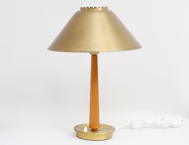 modellnummer 1240, ASEA, stomme i mässing samt räfflad teak, innerkupa i opalinglas, skärm i mässing, höjd 52 (fläckar)