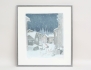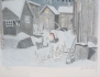 färglitografi 292/320, tomte och katt i vinterlandskap, signerad med blyerts, bildmått 35x30, rammått 49x45