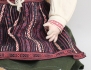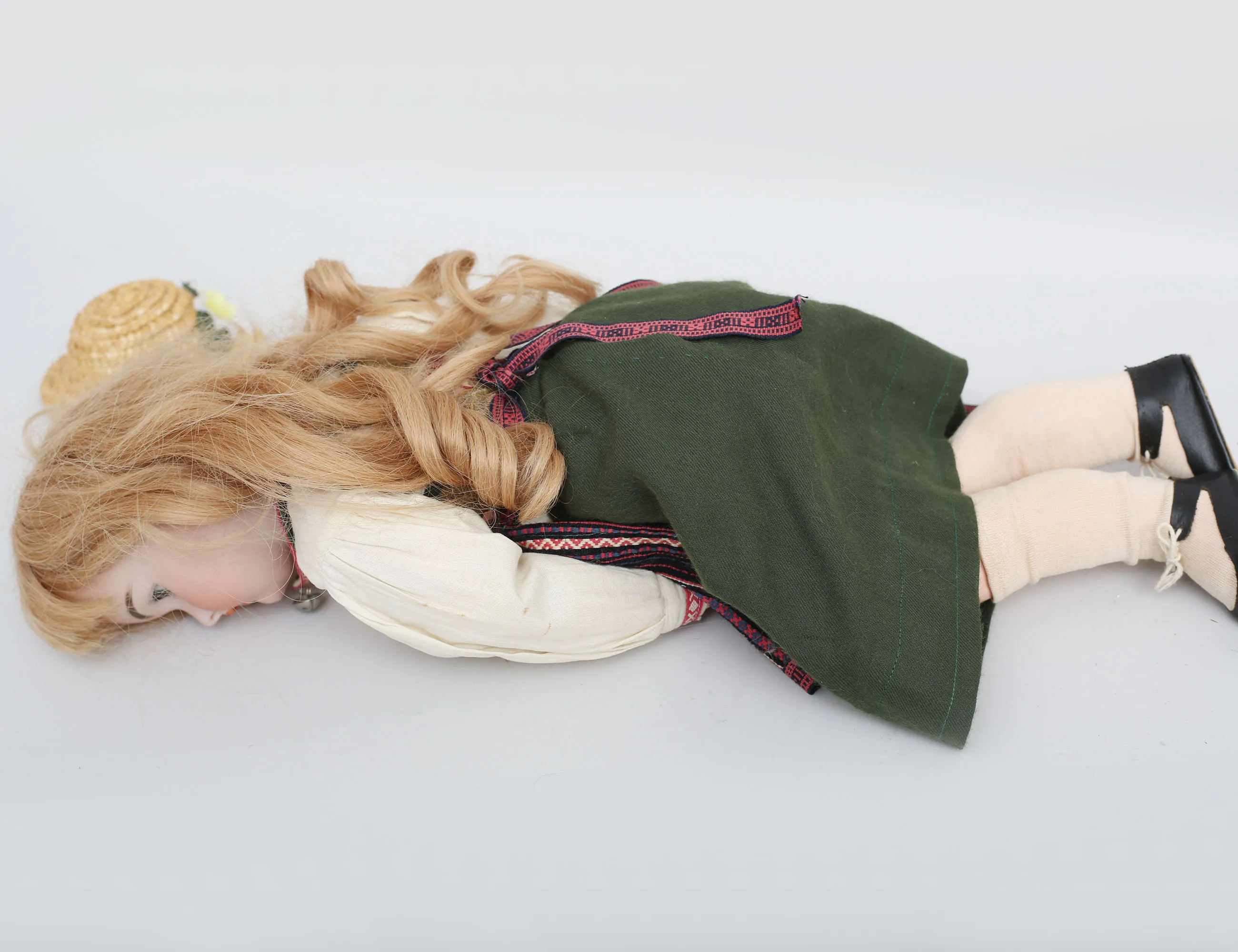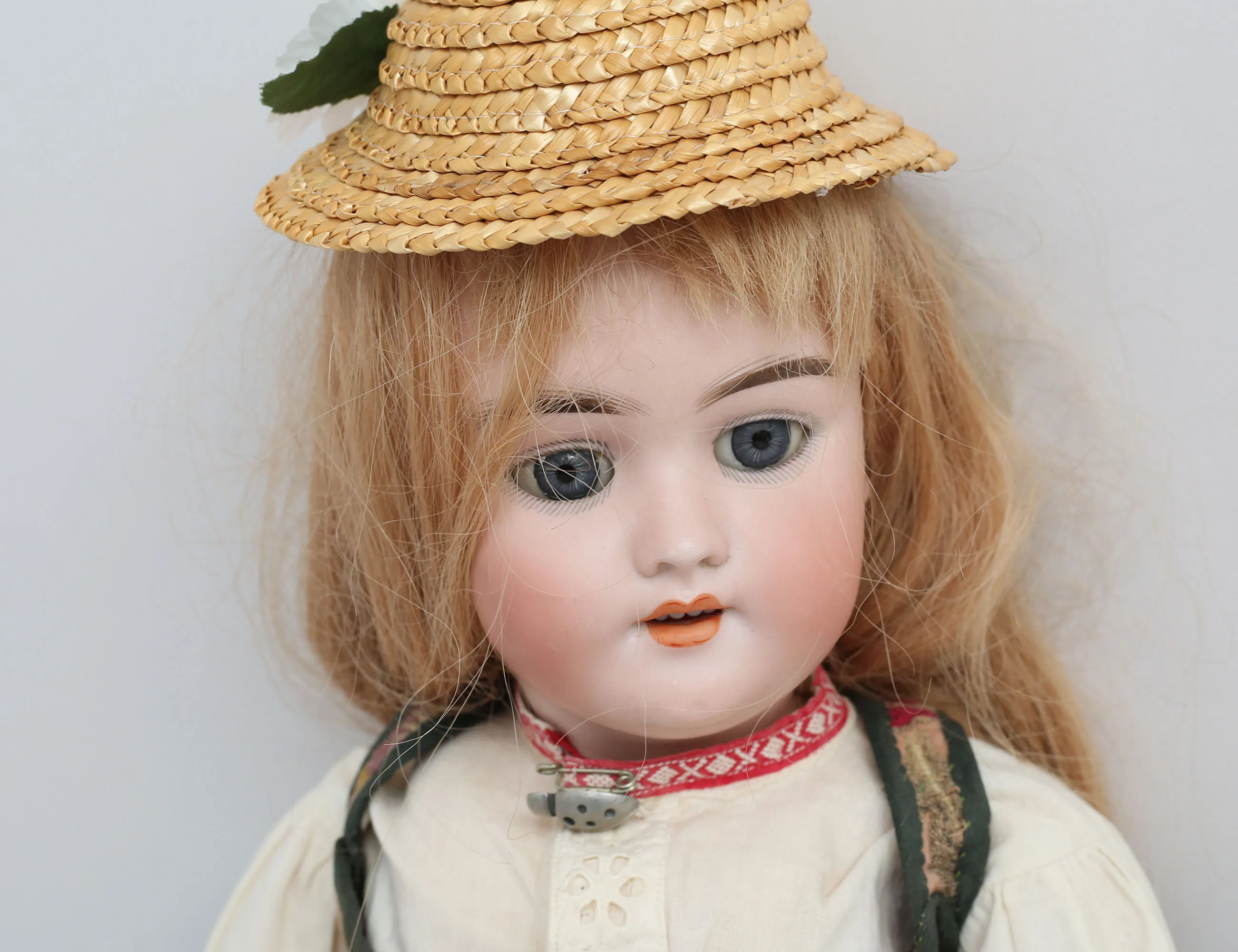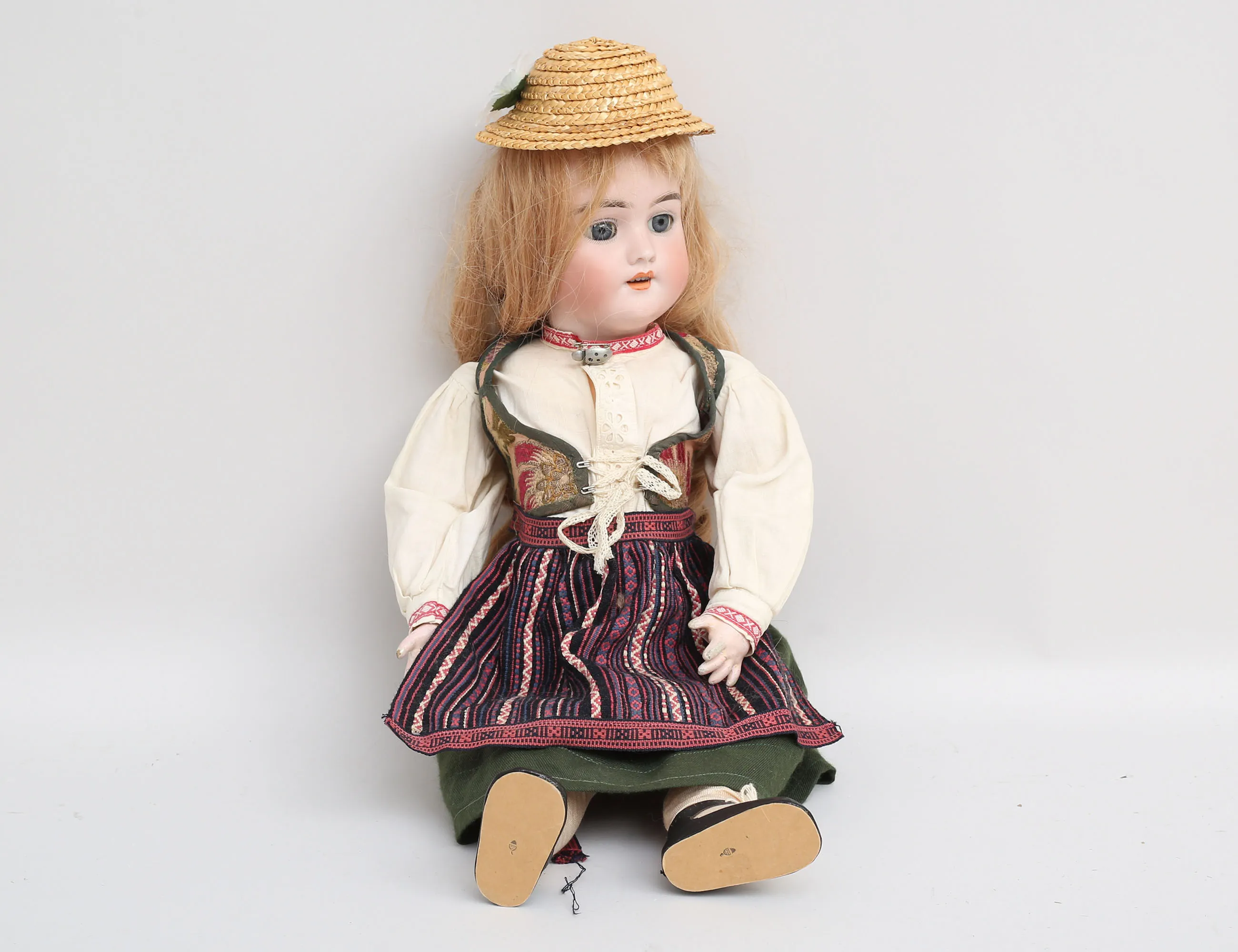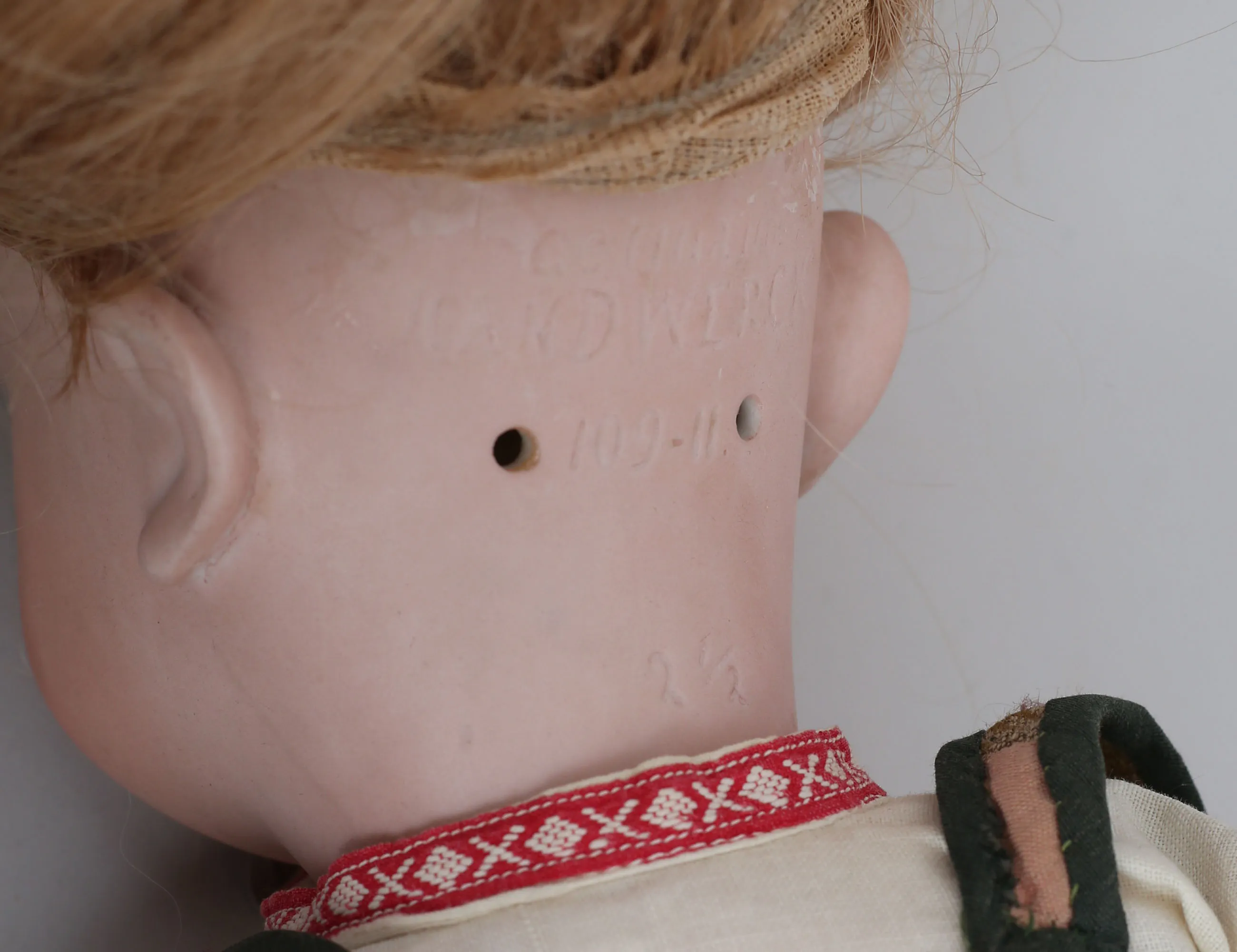 flickdocka c.1900, huvud i biskvi, ledad kropp av massa, blå ögon i glas, öppen mun med tänder, hål i öronen, äkta hår, märkt 109-11 2½, längd 52 (smärre bruksslitage, ett långfinger lagat)