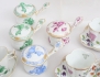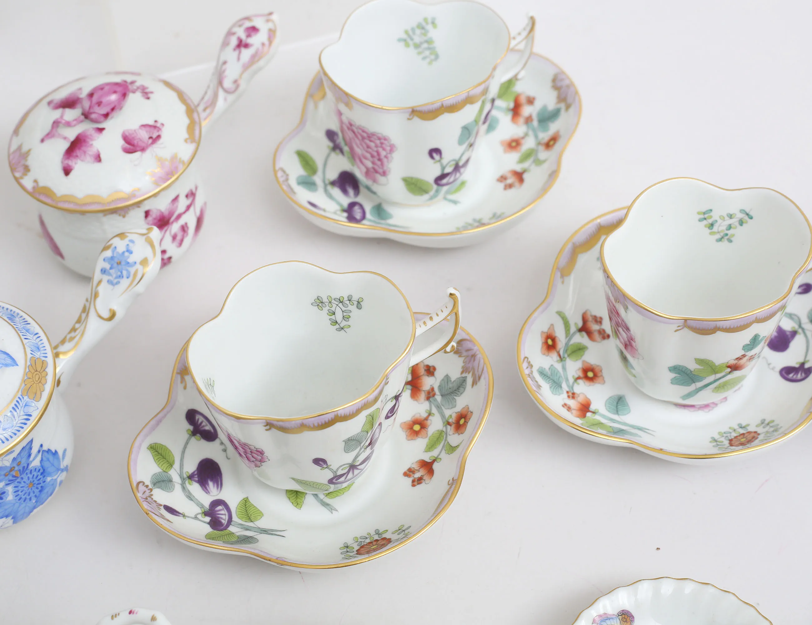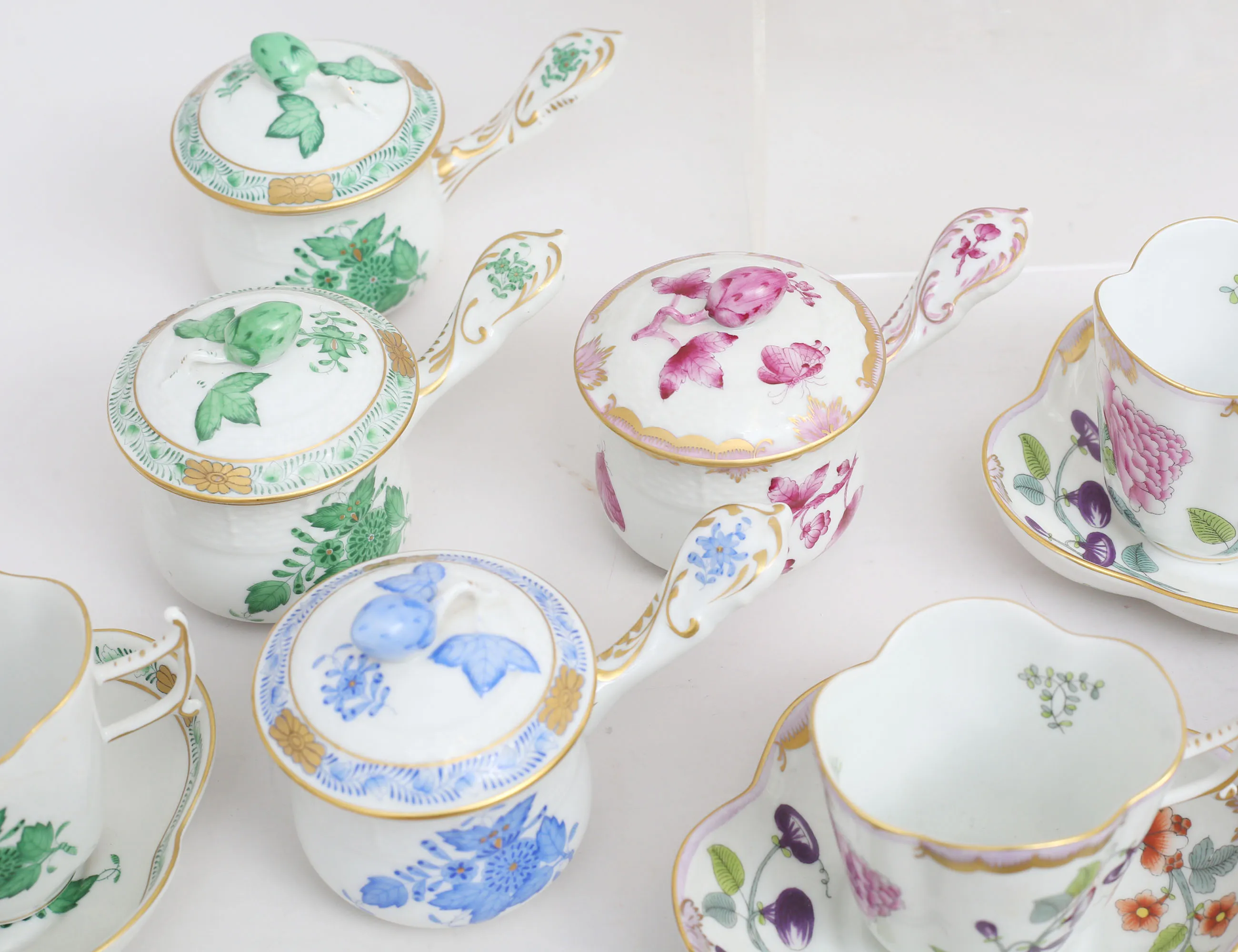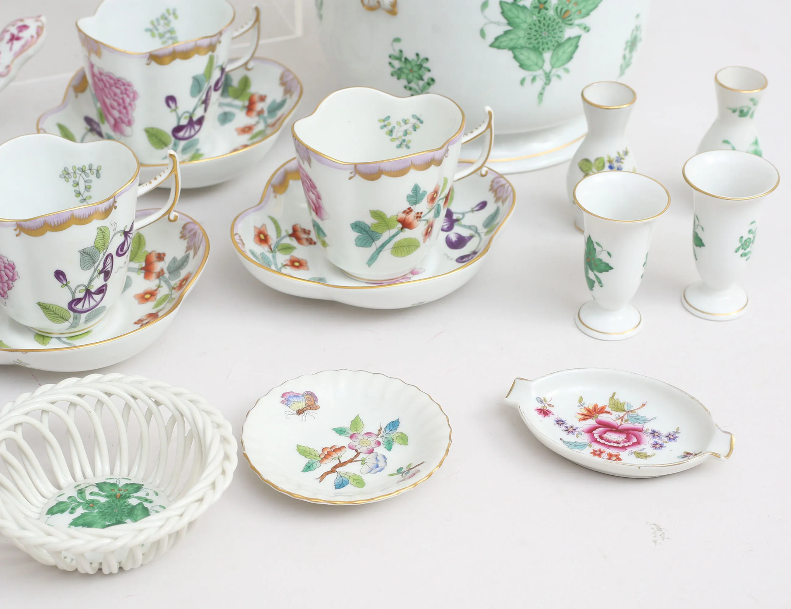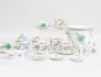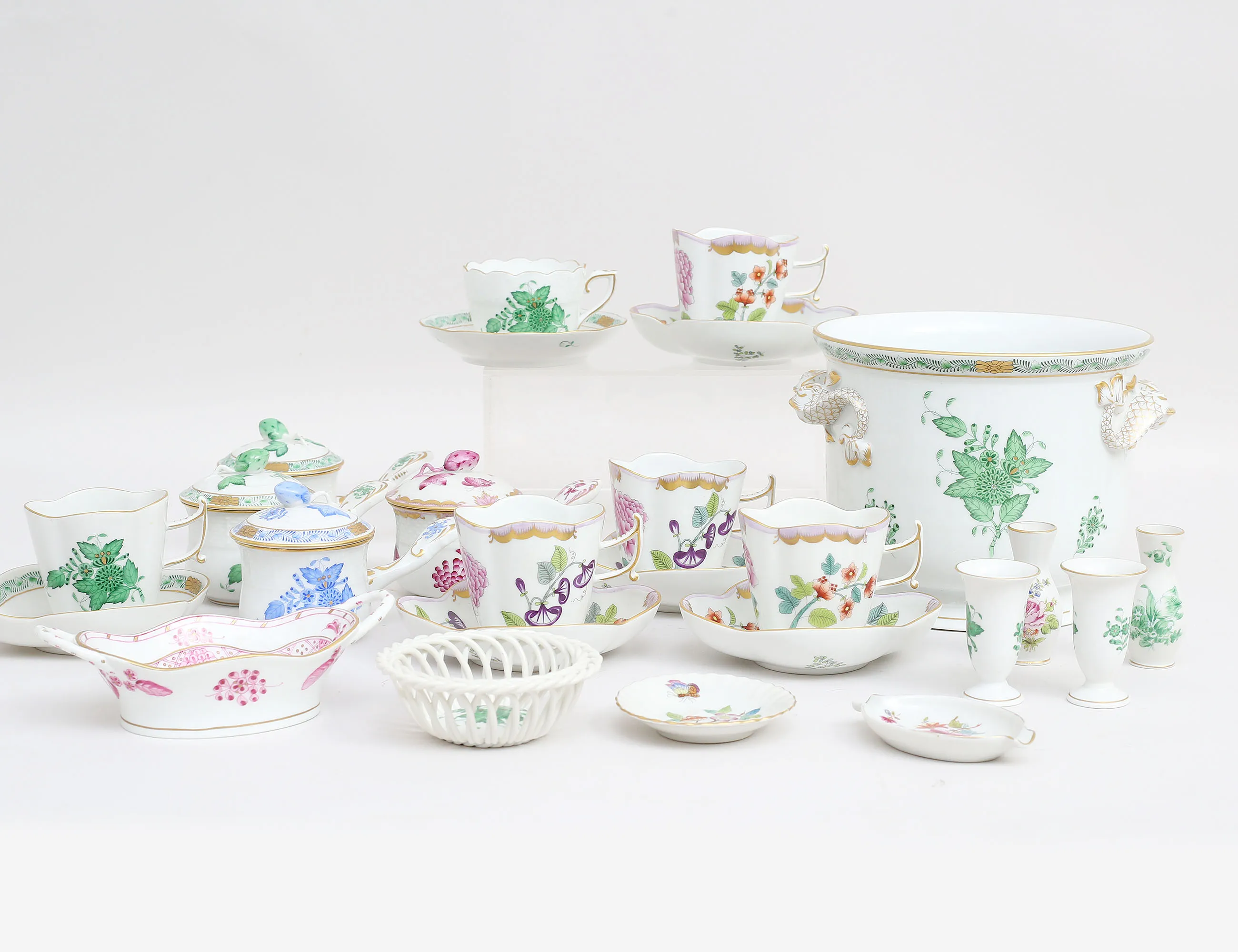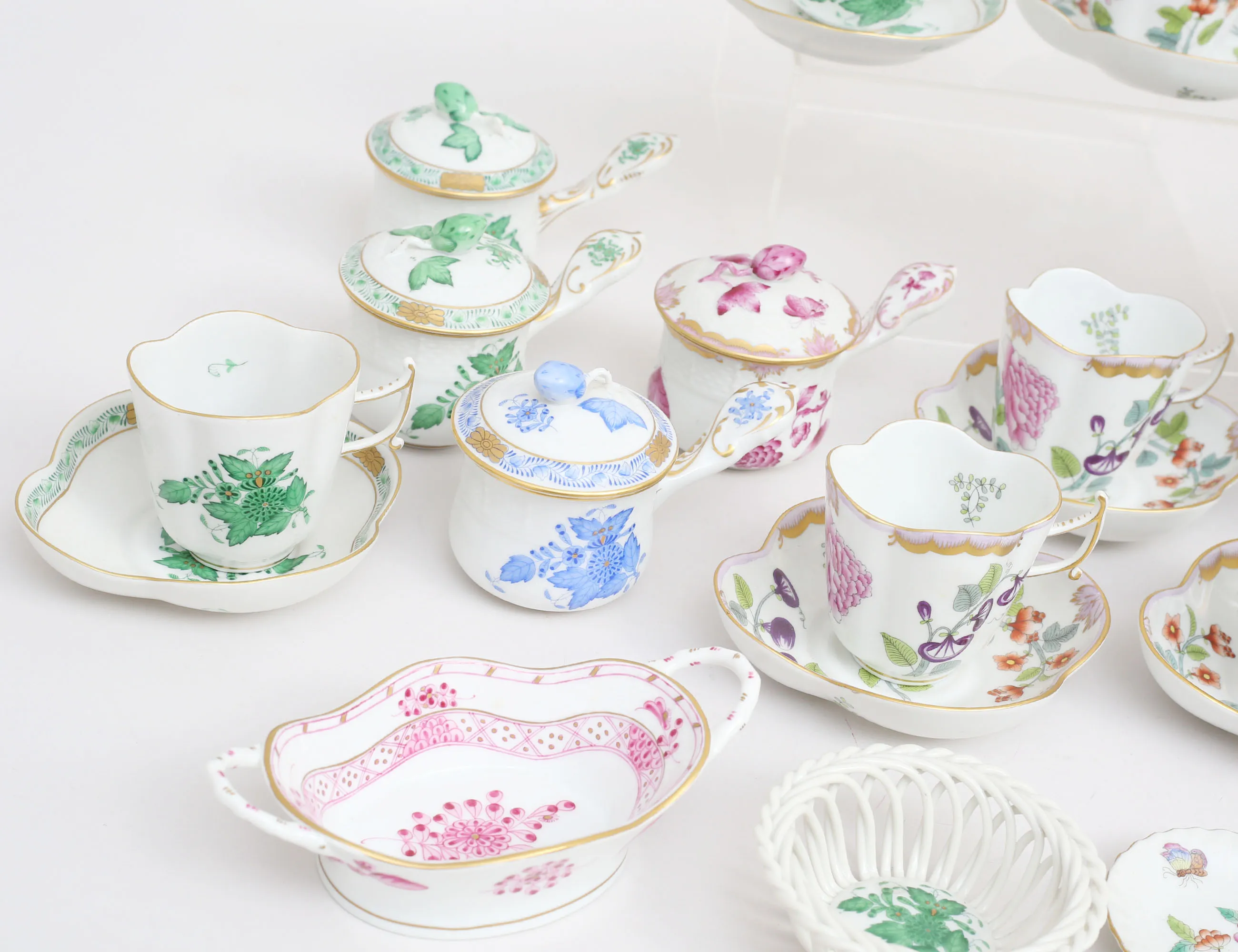 4+1+1 espressokoppar med fat, höjd 6,5, 2+1+1 cremékoppar med lock, höjd 8, 2+2 miniatyrvaser höjd 6, skål med hänklar längd 15,5, 3 småfat, ytterfoder höjd 14 (fotringsnagg)