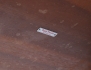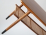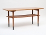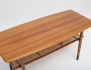 soffbord 1950-tal, fanerat med mahogny, ben i bok med svärtade avslut, tidningshylla av flätad rotting, brickmärkt, höjd 36, bredd 115x50 (smärre bruksslitage)