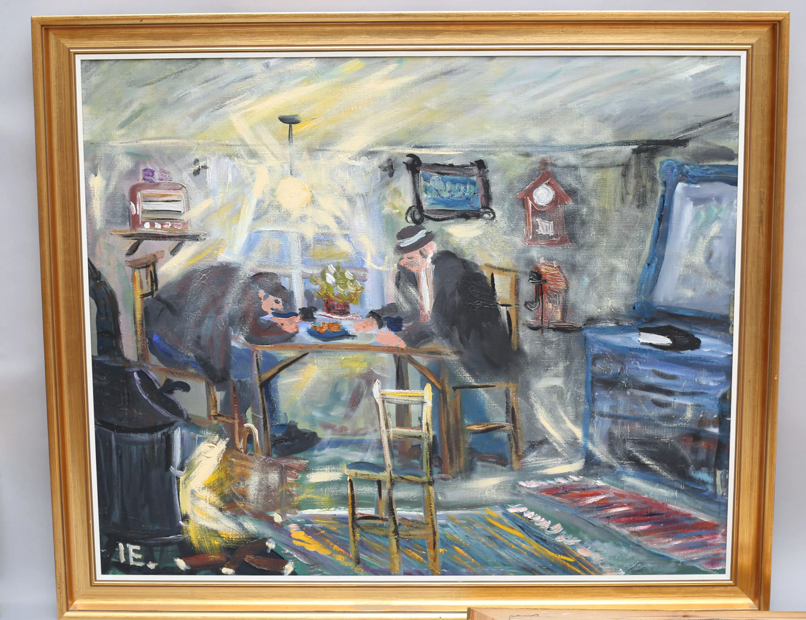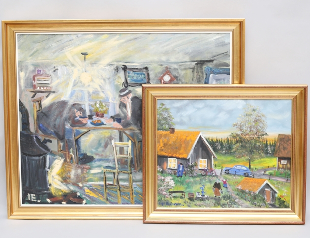 2 oljemålningar på duk, "Dricka kaffi på fat", 60x73, rammått 69x81, "Barnbarn hor morfar o mormor på Smålandstorp tidigt 50-tal", 38x46, rammått 48x55, båda signerade även atergo