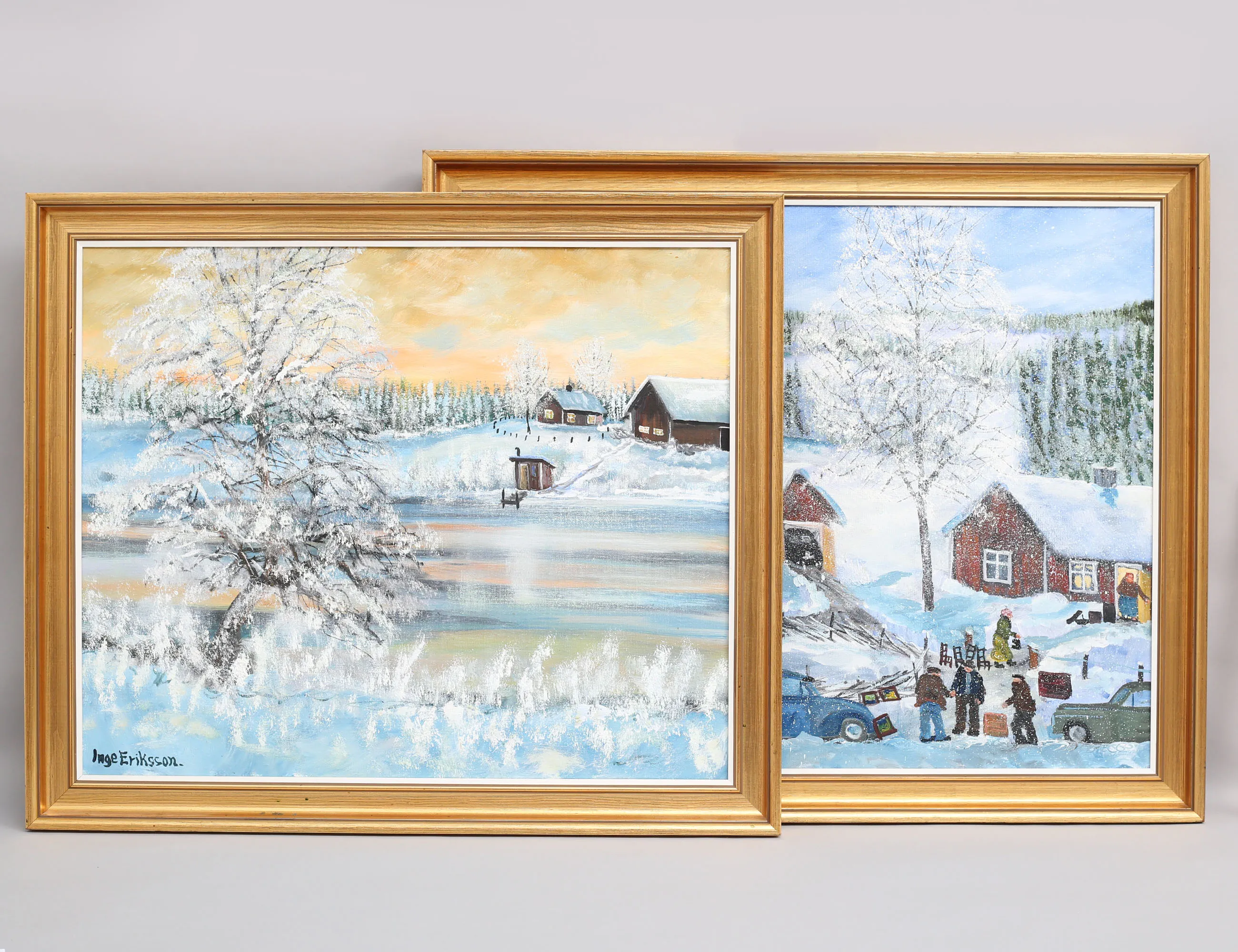 2 oljemålningar på duk, "Efter auktion i Småland tidigt 50-tal", 54x65, "Oxel vid sjökant", 50x61, båda signerade samt även atergo