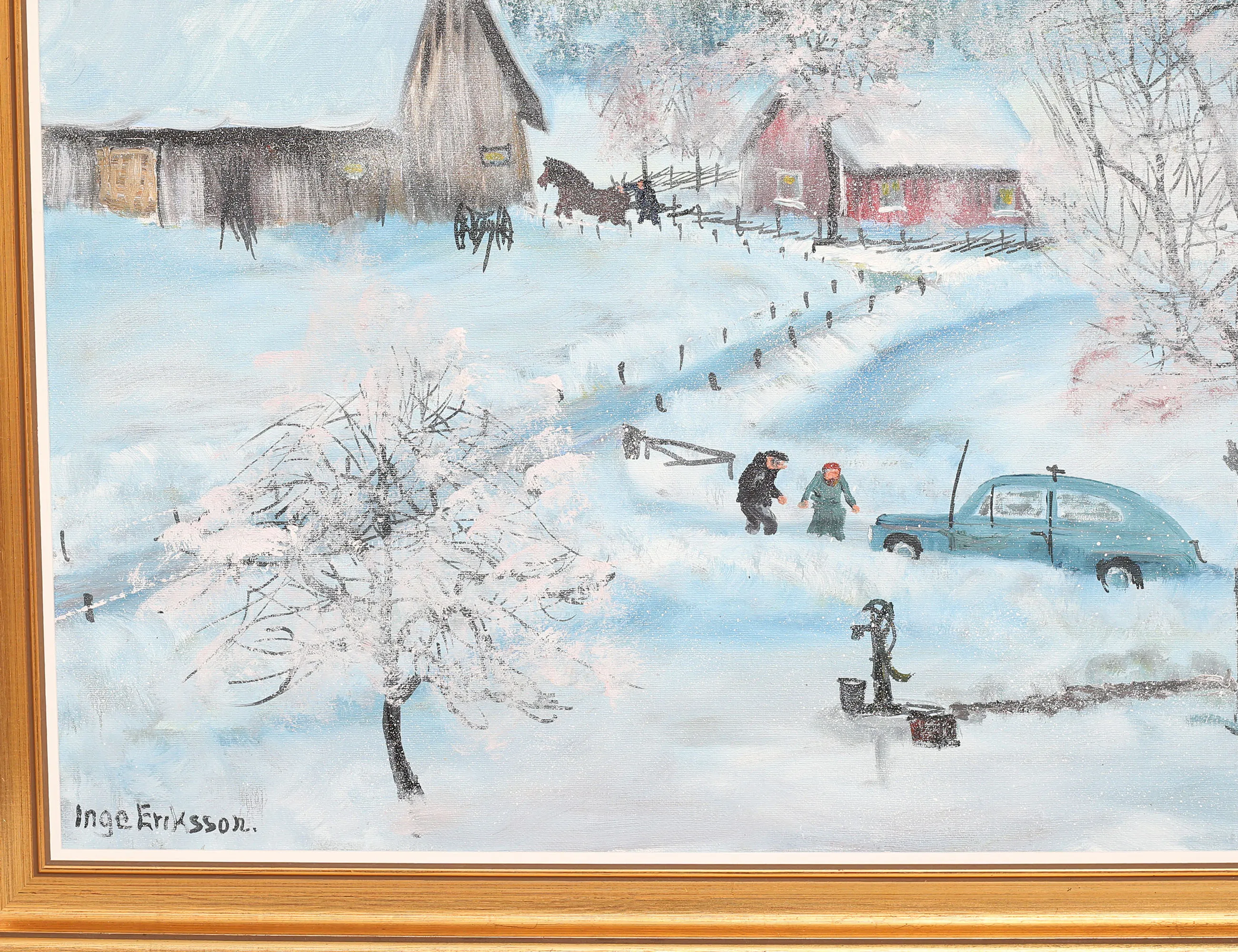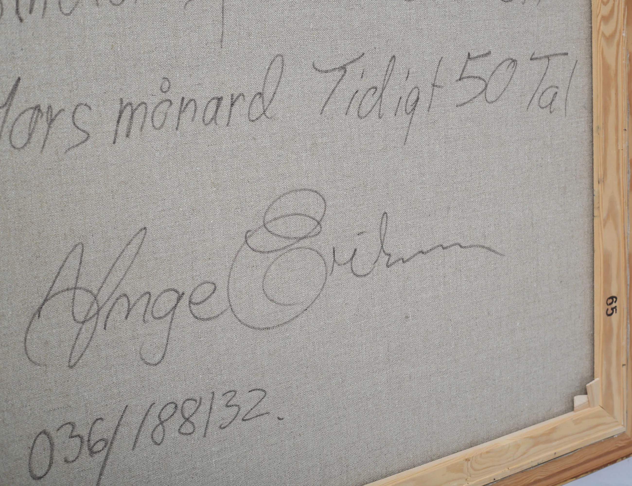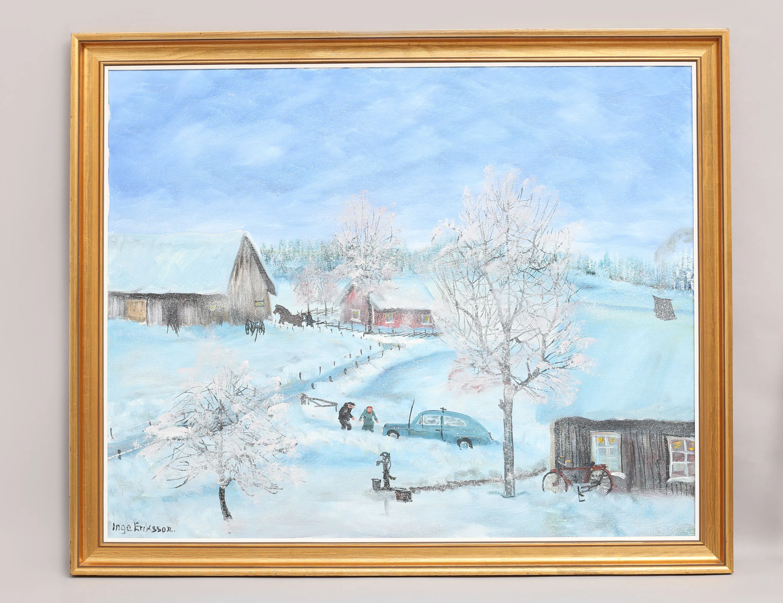 oljemålning på duk, "Smålandsgård solsken marsmånad tidigt 50-tal", signerad även atergo, 65x81, rammått 76x90