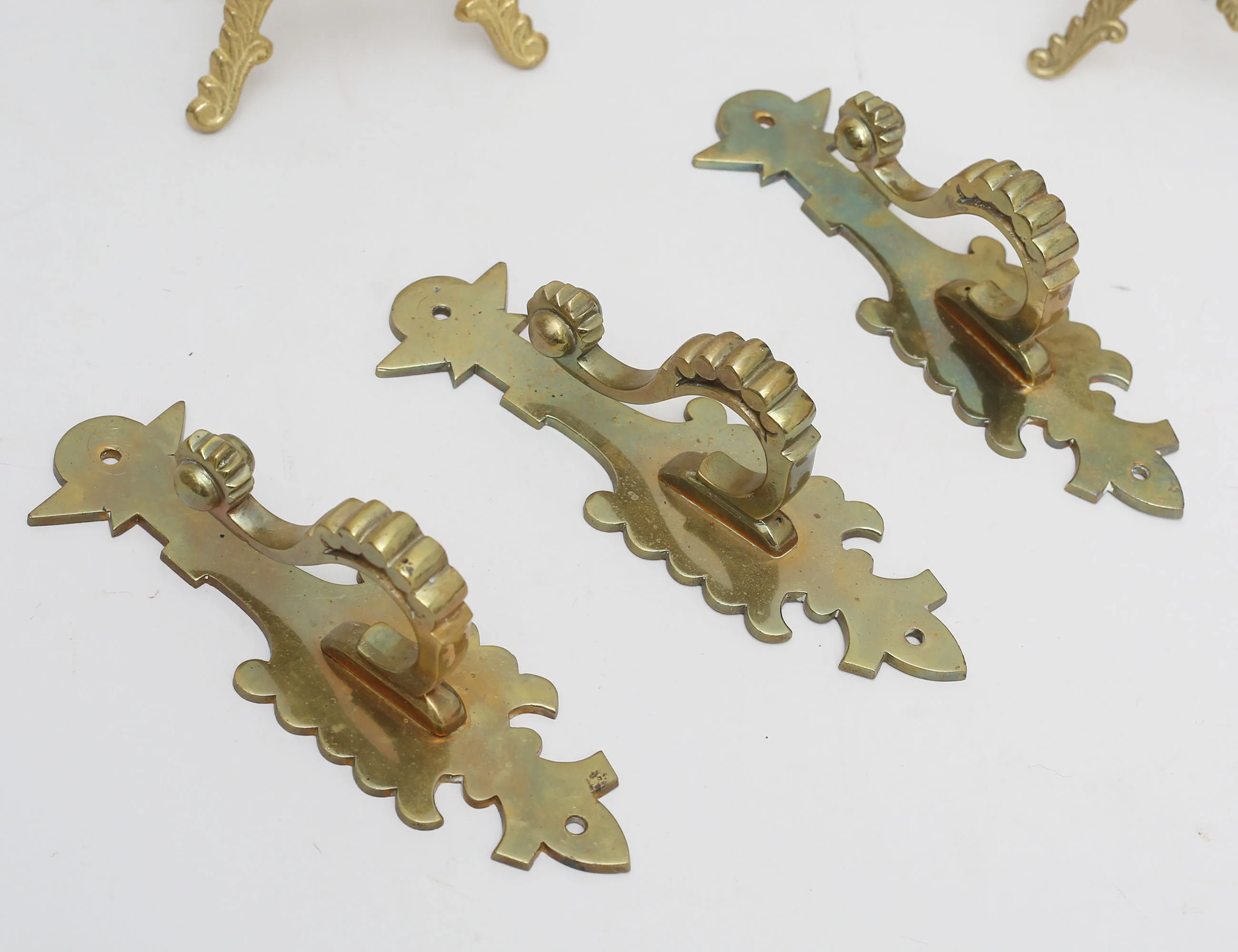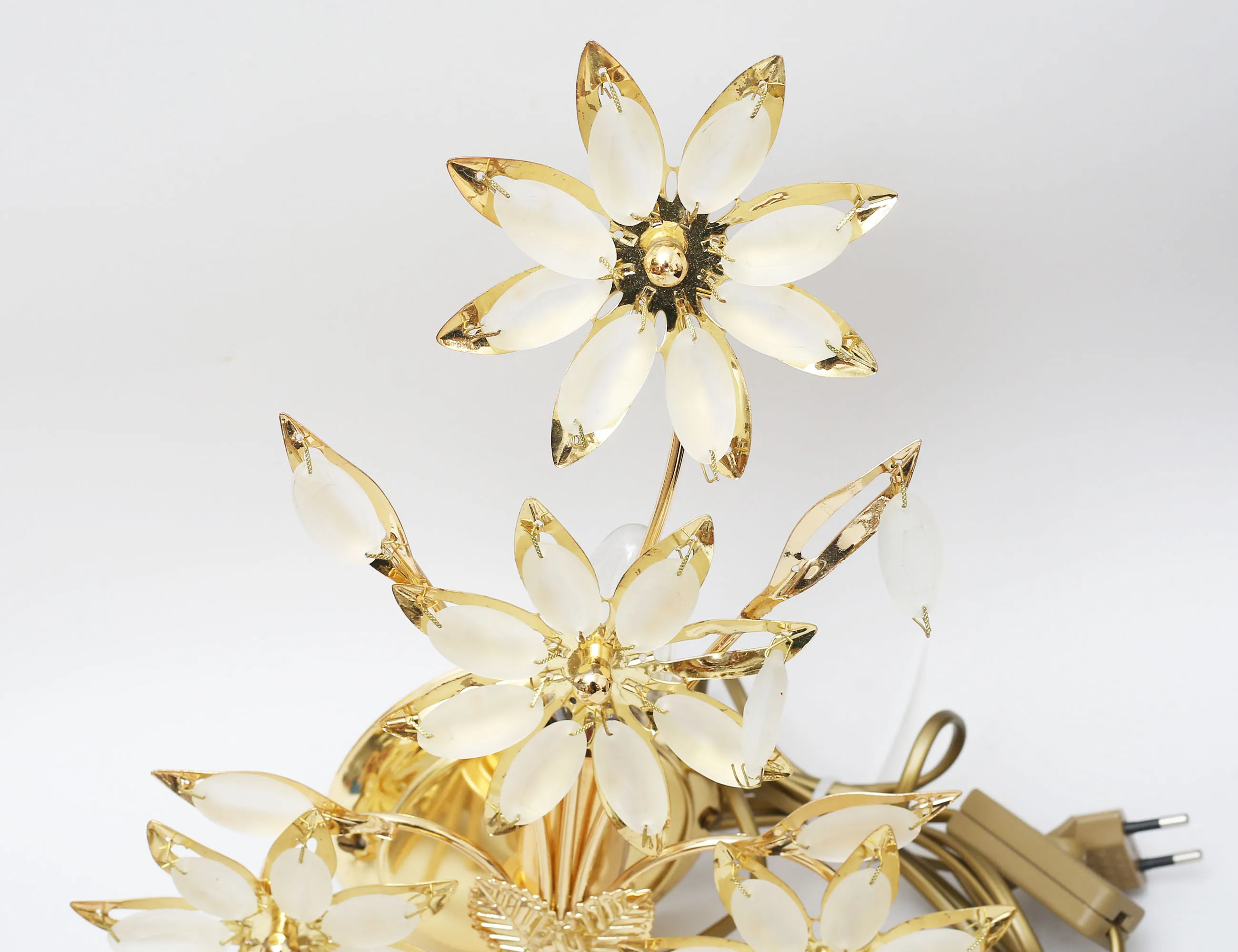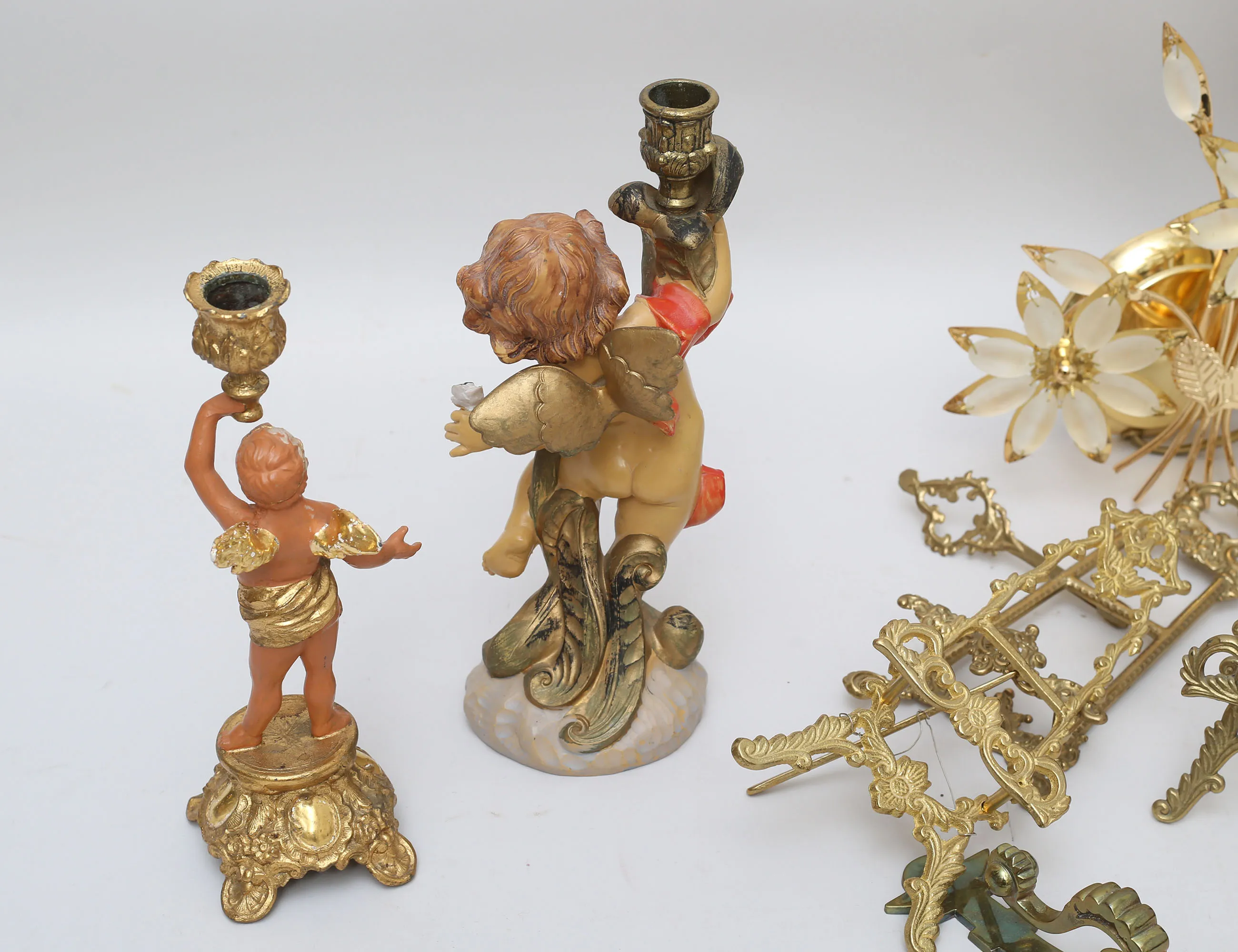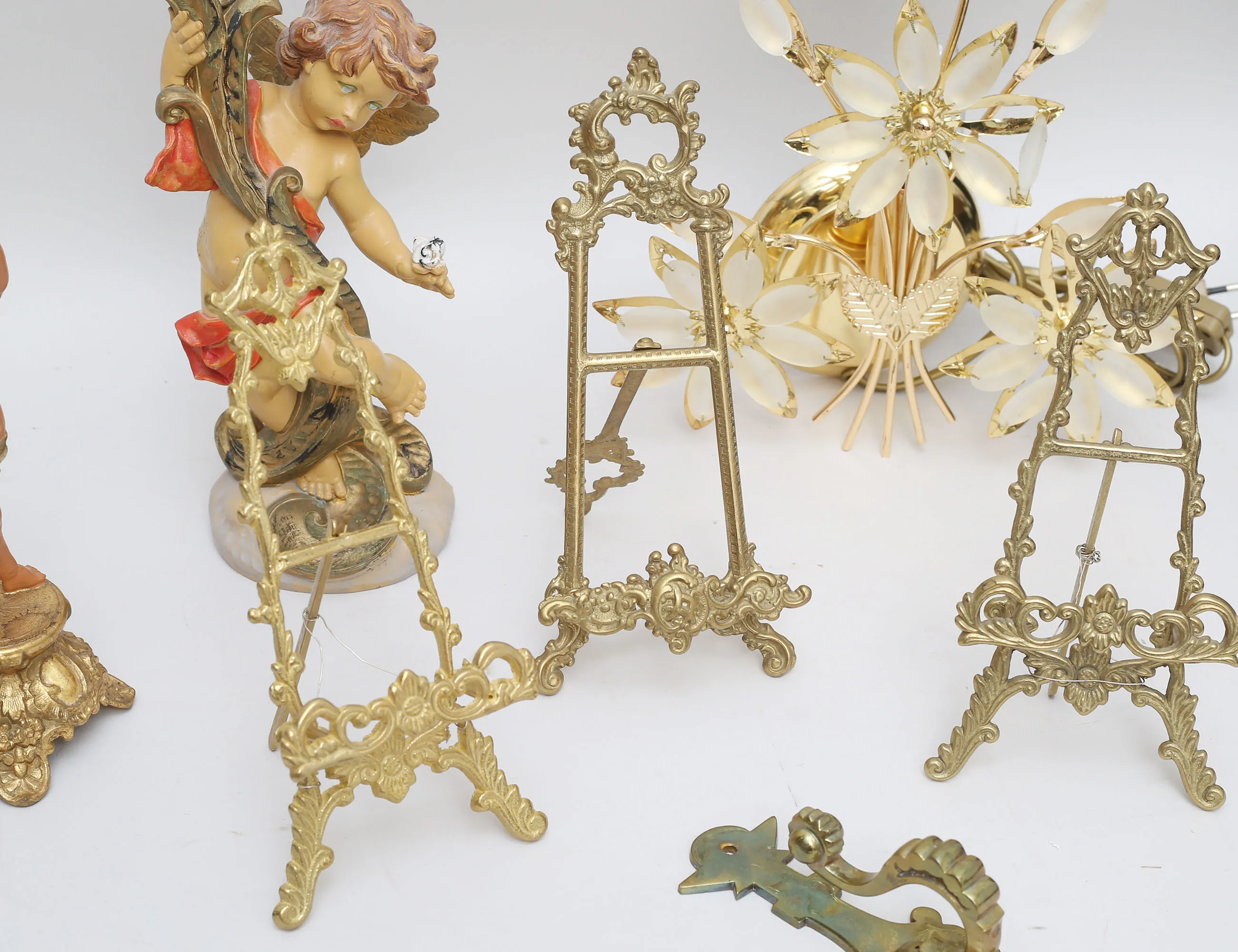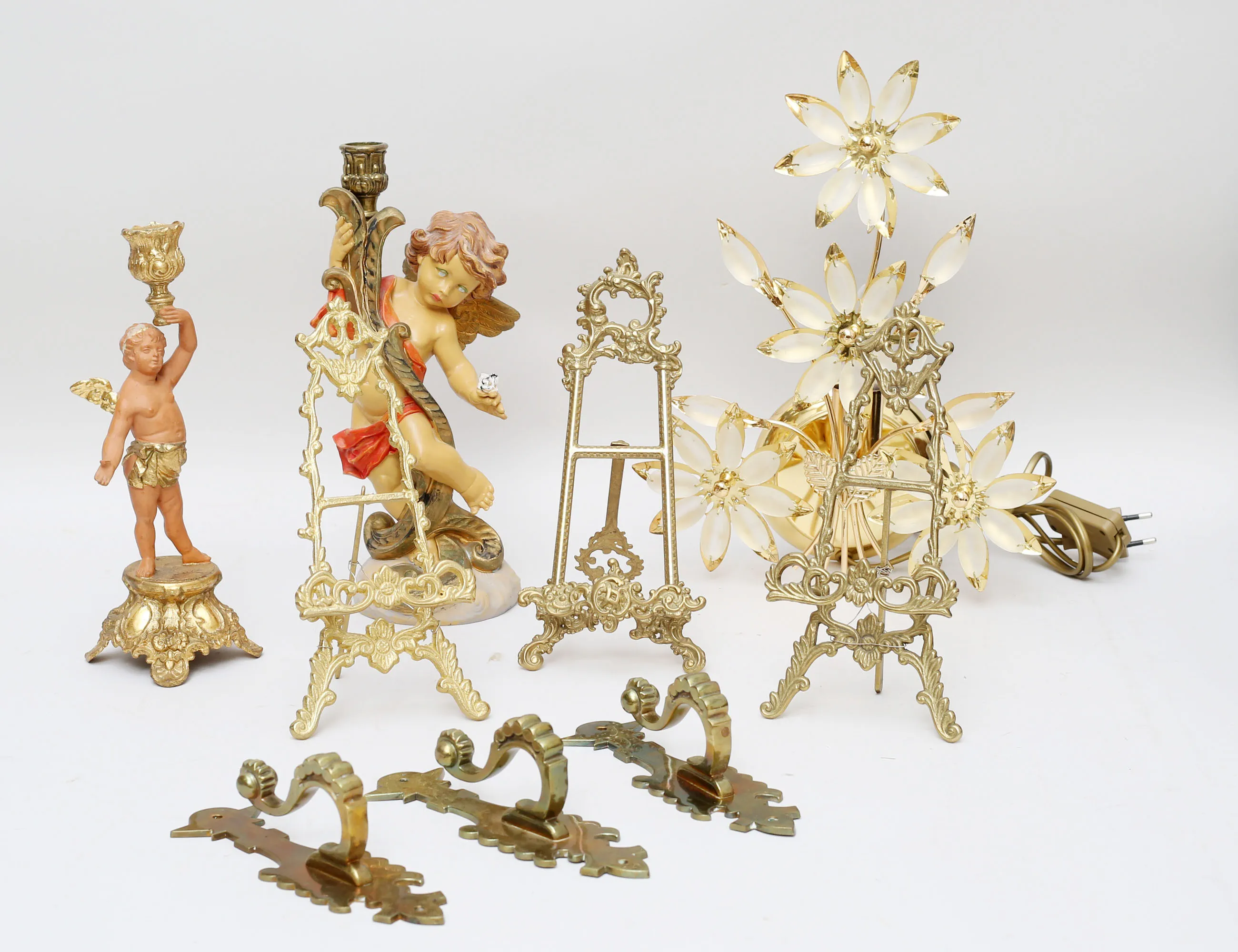 väggarmatur mässing, elipsformat matterat glas, höjd 33, bredd 26, 2+1 bordsstafflier för fotografier, gjuten mässing, höjd 22/23, ljusstakar 2 stycken metall/konstmassa, höjd 26/28, 3 väggkrokar mässing, höjd 19