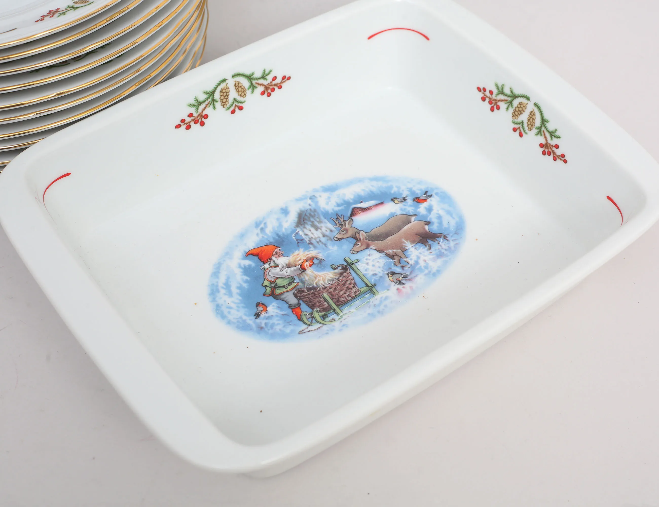 Lars Carlsson Christineholm Fyrklövern, 12 mattallrikar diameter 26,5, 12 assietter diameter 21, 12 djupa tallrikar diameter 22, ugnsform 26x20