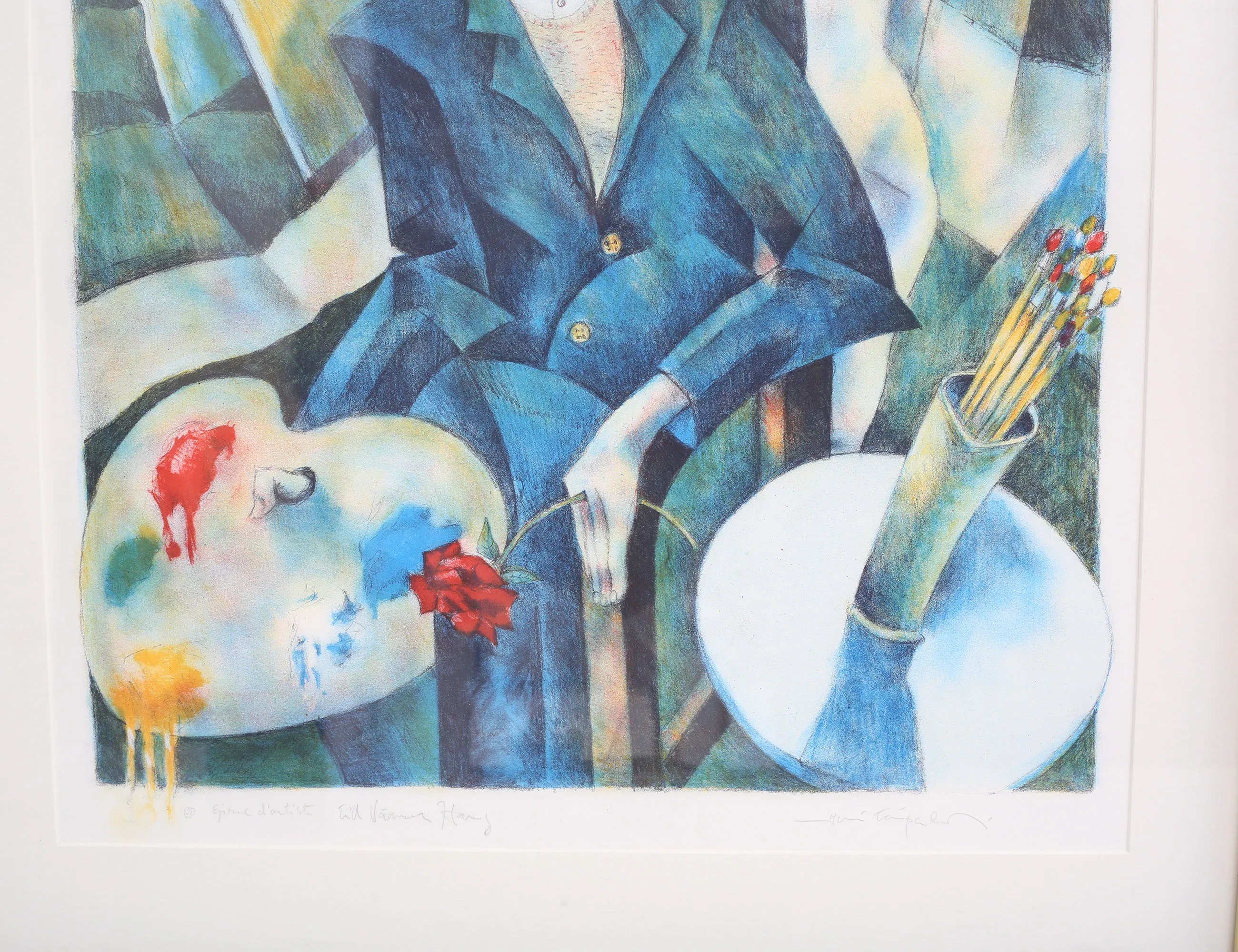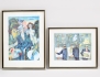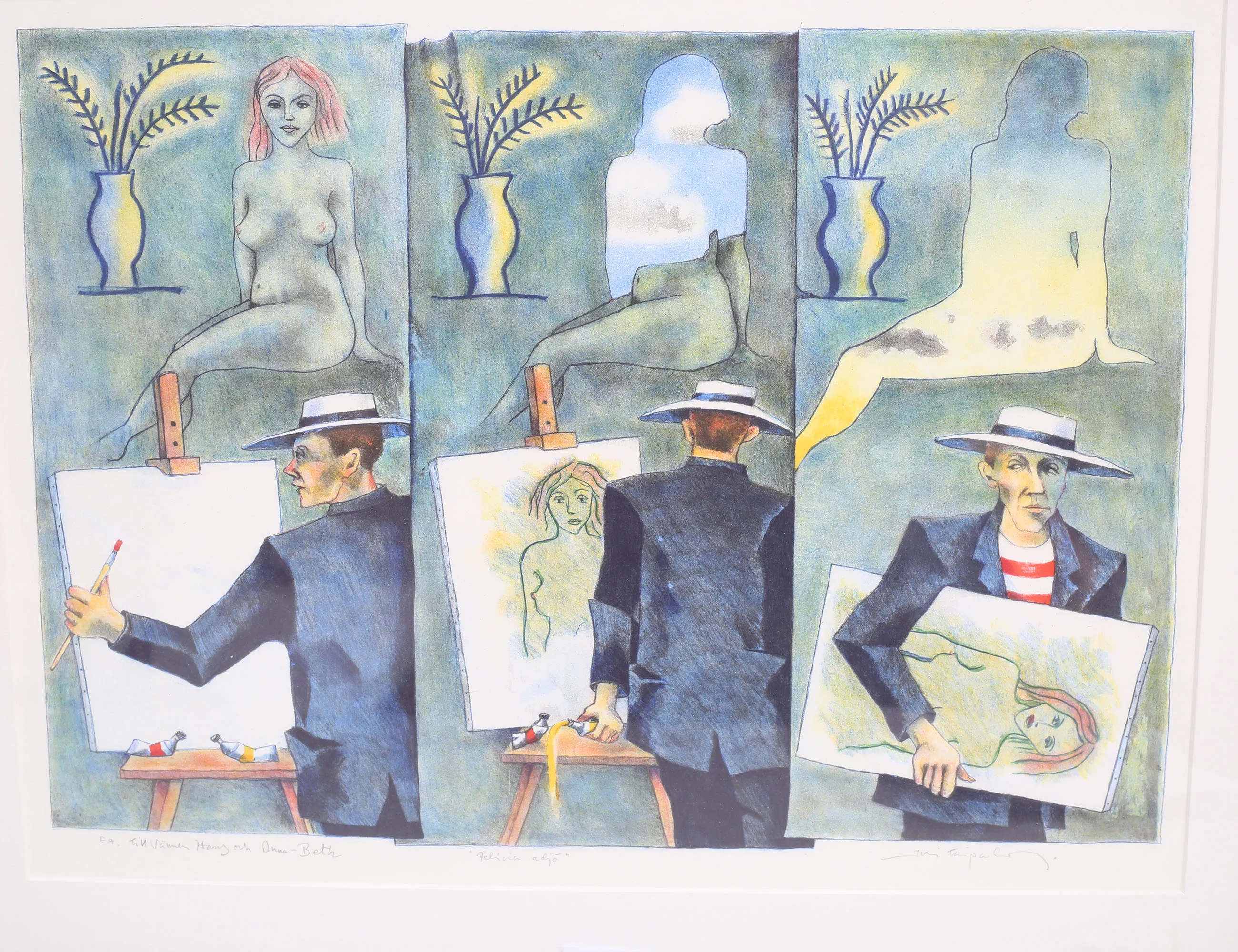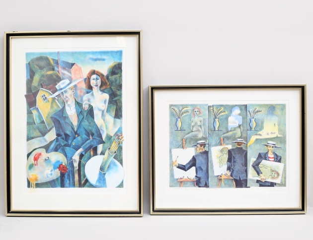 2 färglitografier ea., "Målare med modell" respektive "Felicia Adjö", signerade samt med dedikation, rammått 78x54, 51x61