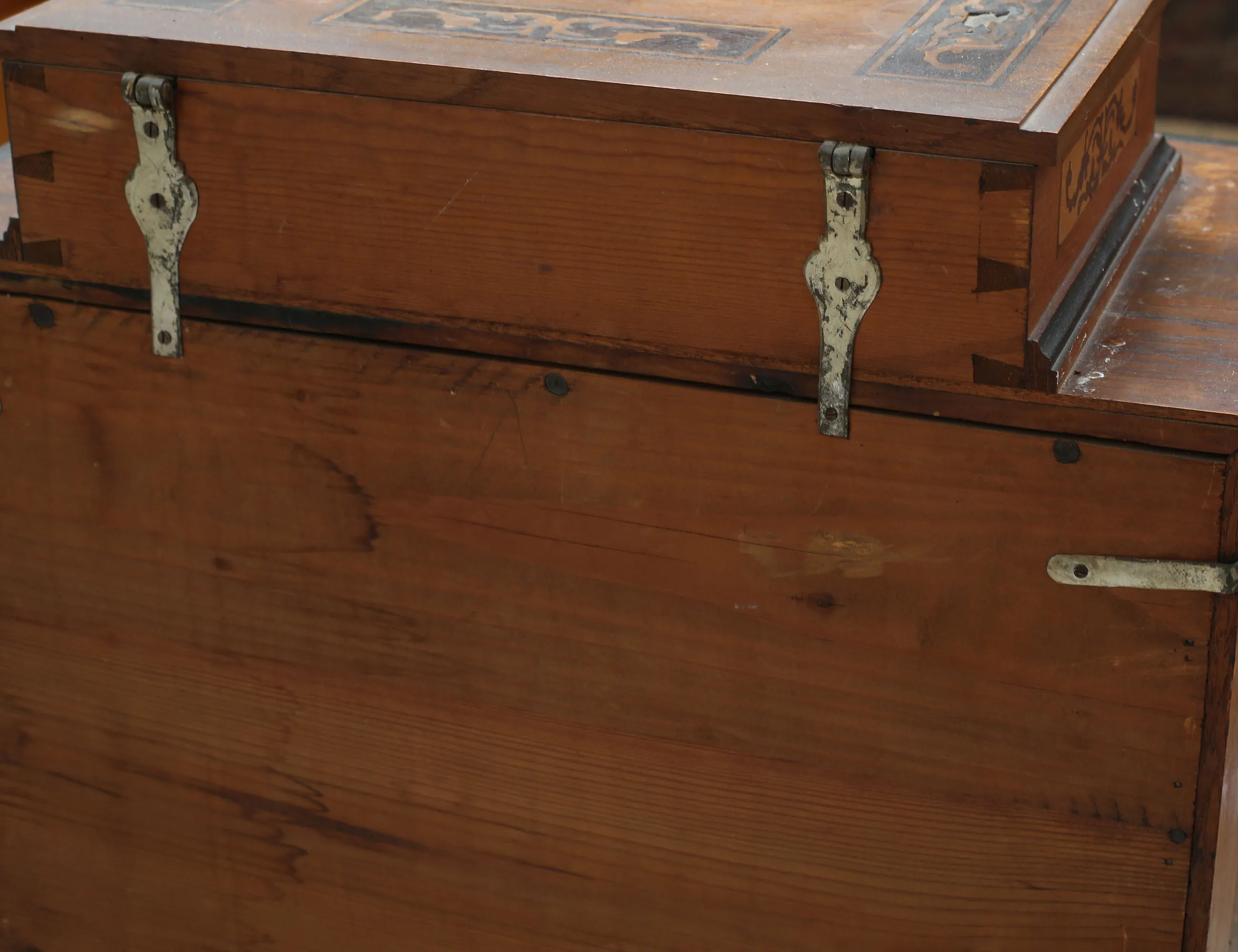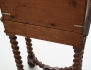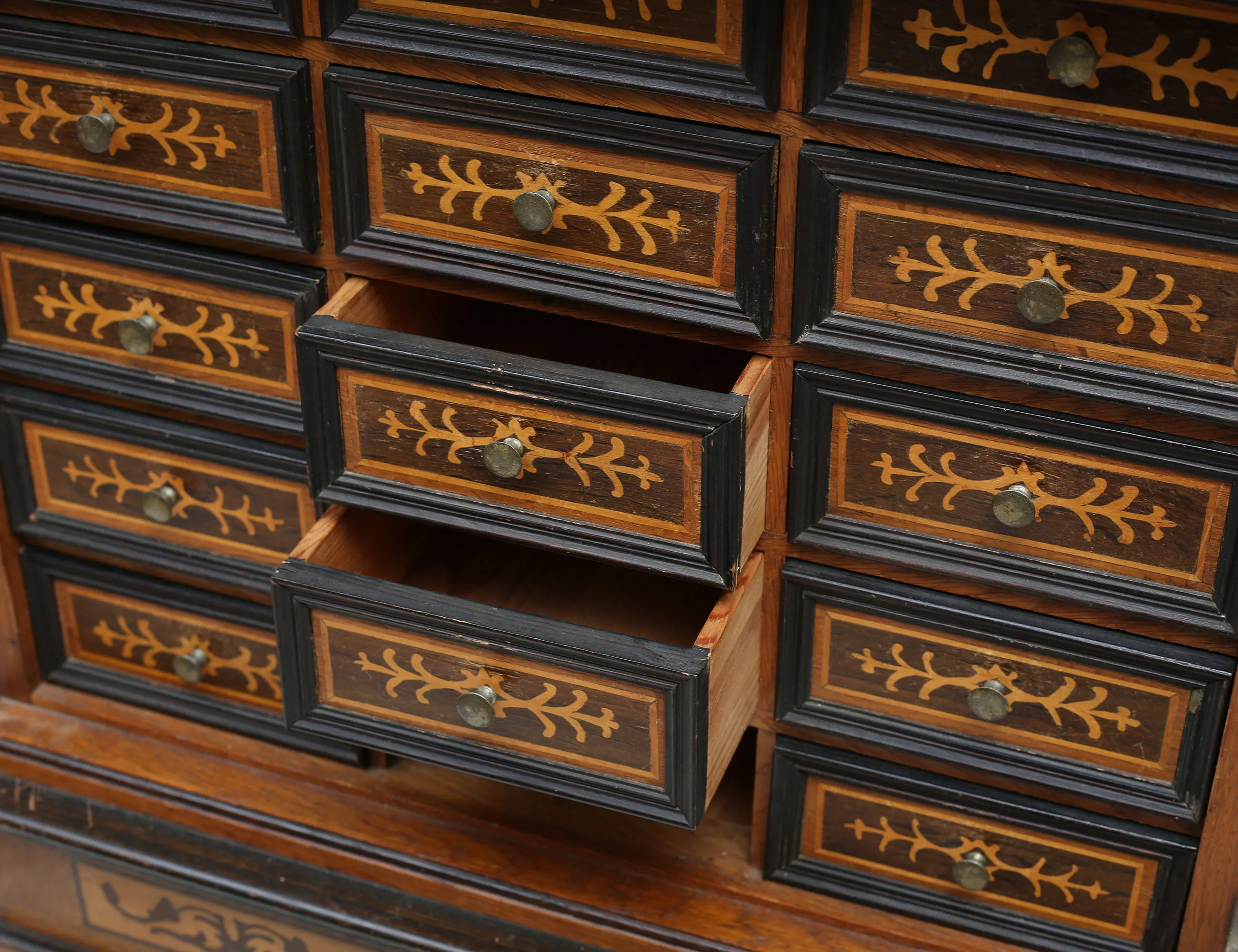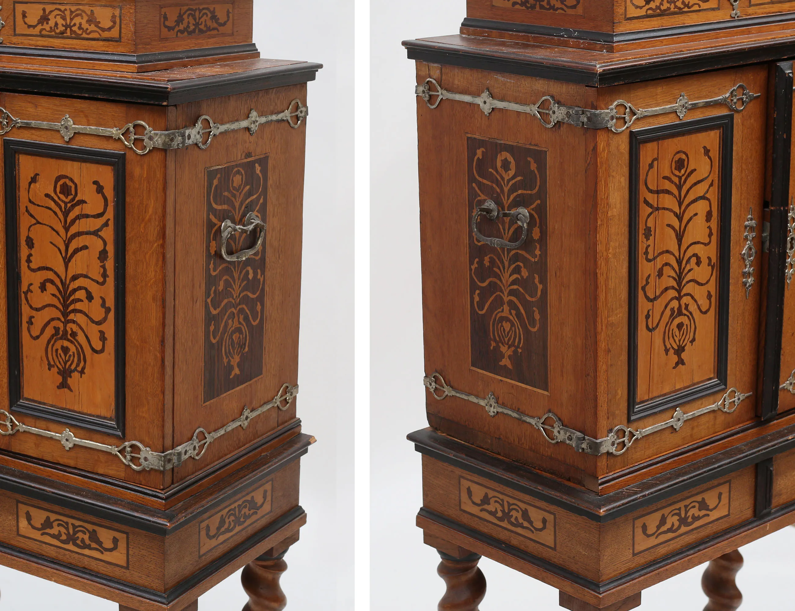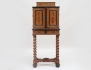 ek med intarsia, överdel med skrin, bakom dörrar 12 fack med smålådor samt överst en större låda,  spiralsvarvad benställning, förtenta gångjärn och beslag, hopplister, höjd 132, bredd 57, djup 30 (lister, en låda samt nyckel saknas)