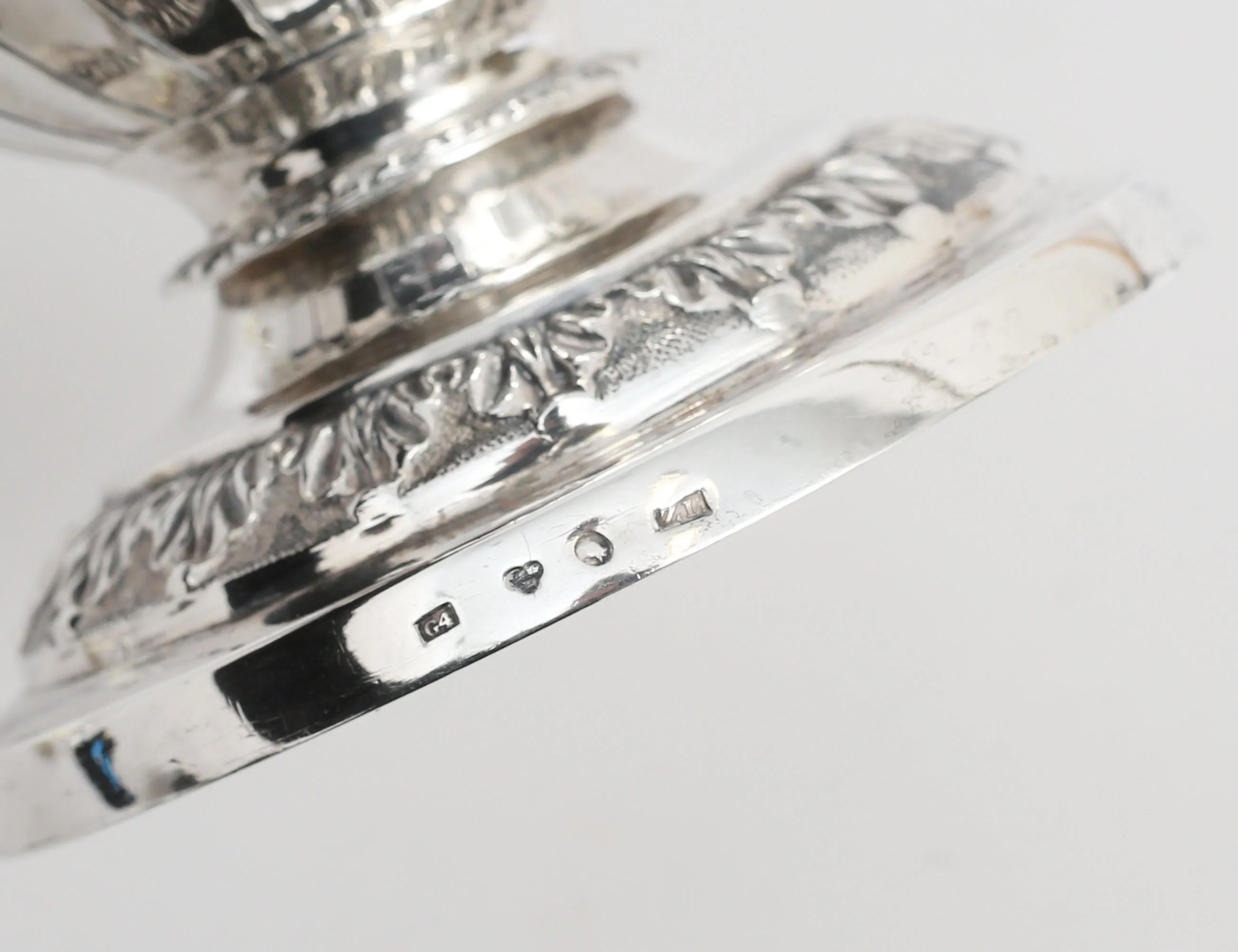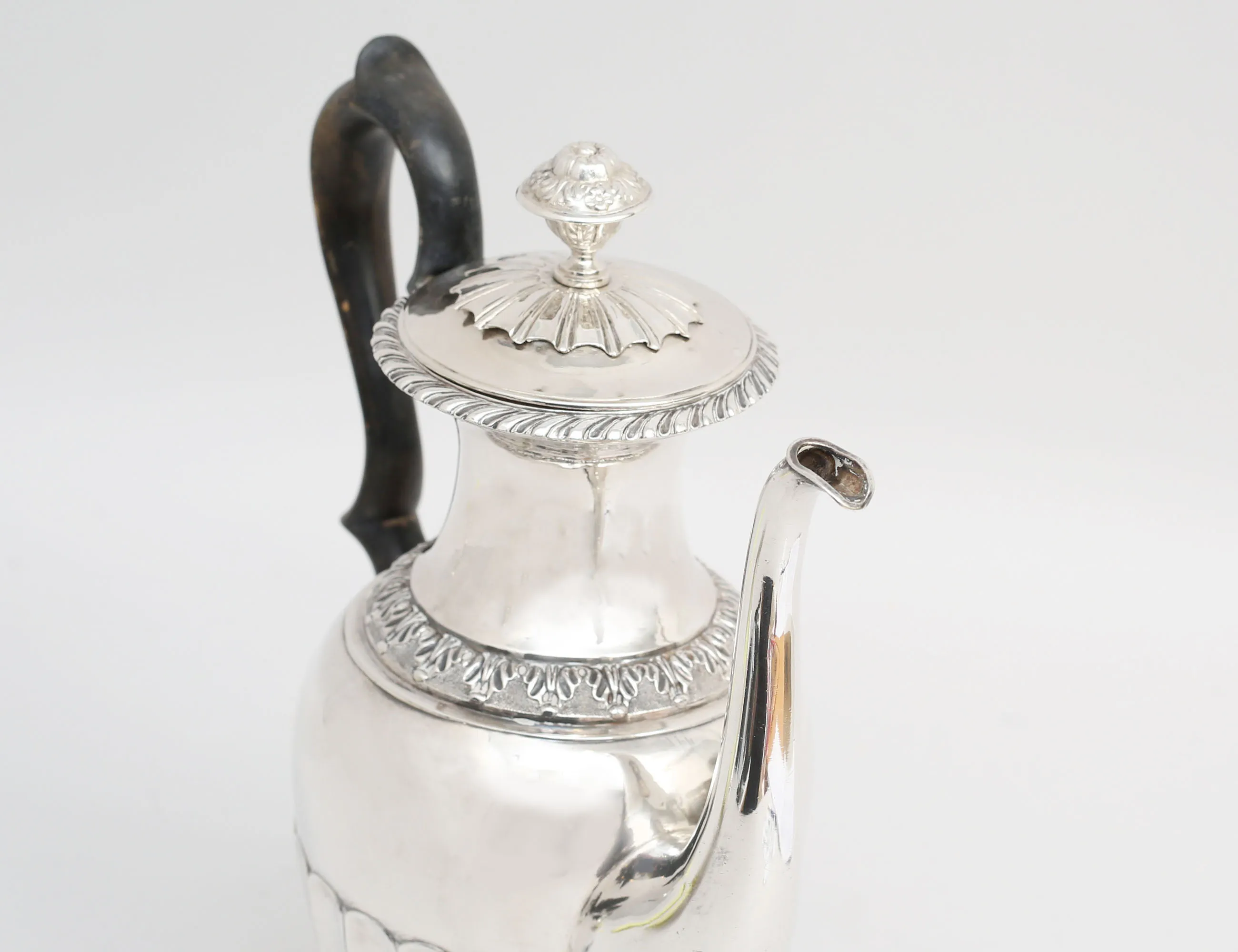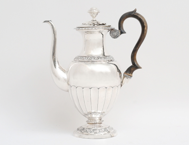 Zacharias Lundqvist Stockholm 1837, liv med godronnering, reliefdekor av akantus, stämplad på lock och fotring, vikt 736 gram inklusive trähandtag, höjd 28