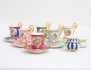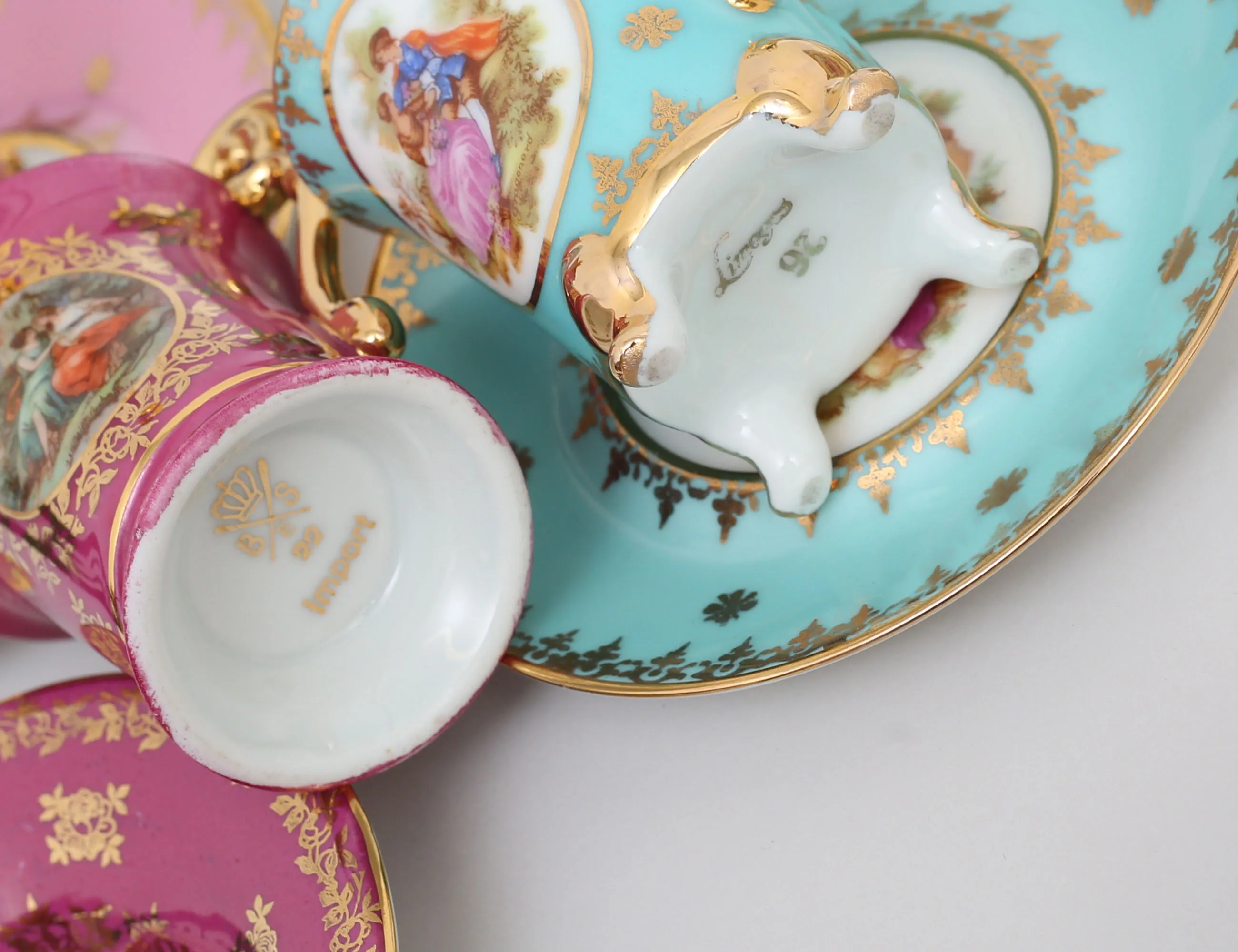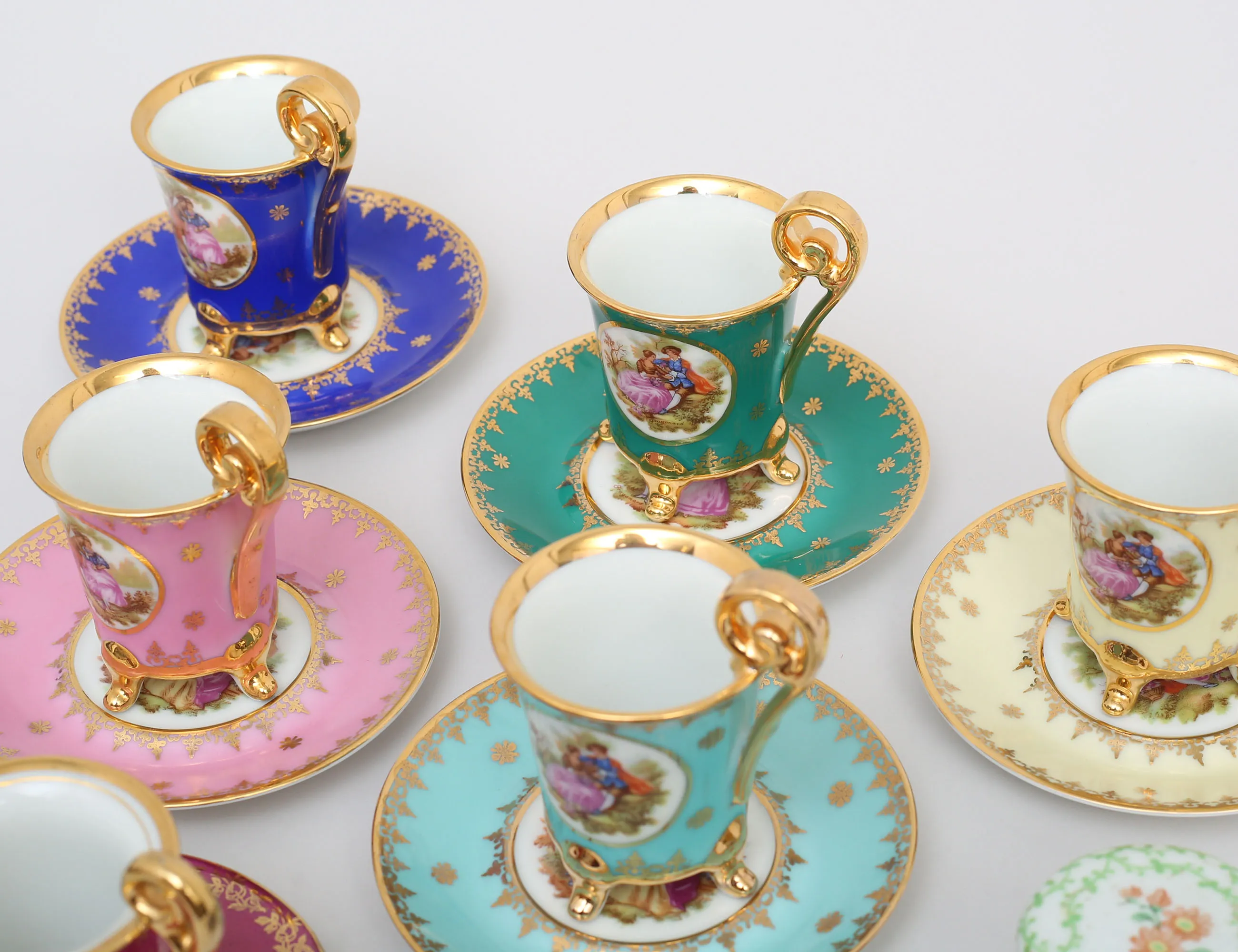 Limoges Frankrike, polykrom dekor av figurscener samt förgyllning, höjd 8,5, kaffekopp med fat Tyskland, 2 dosor porslin