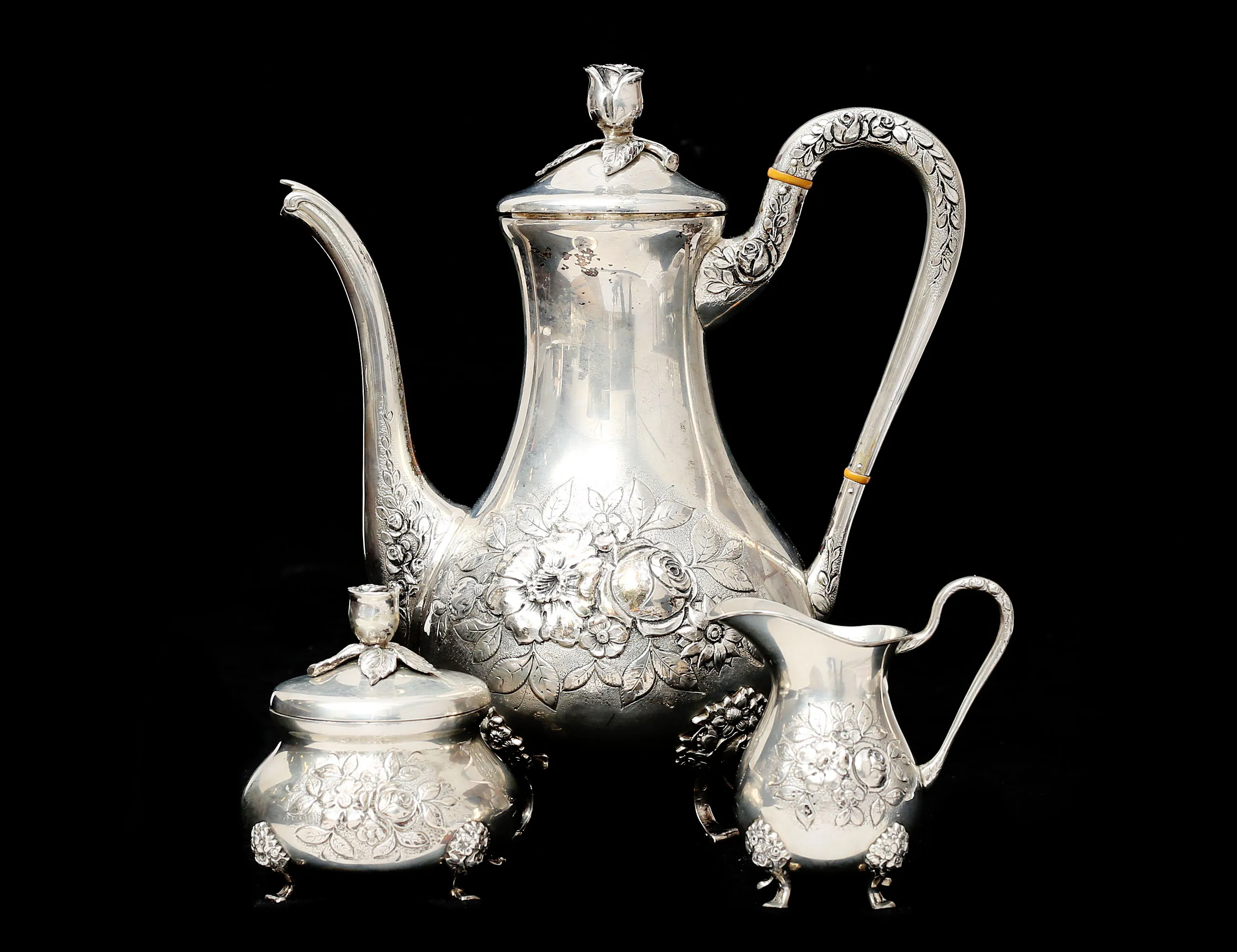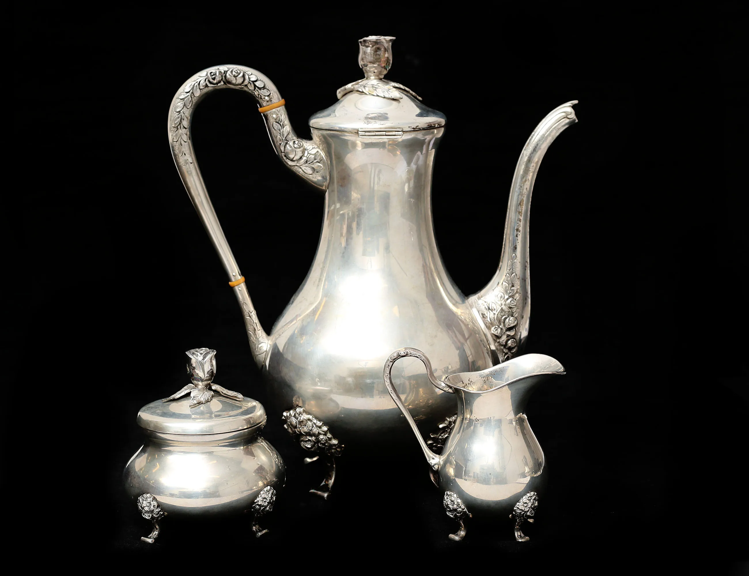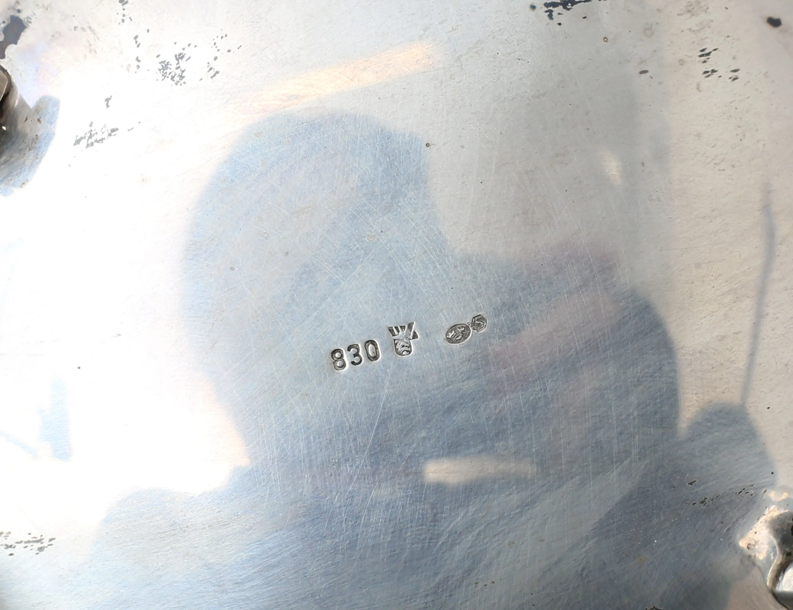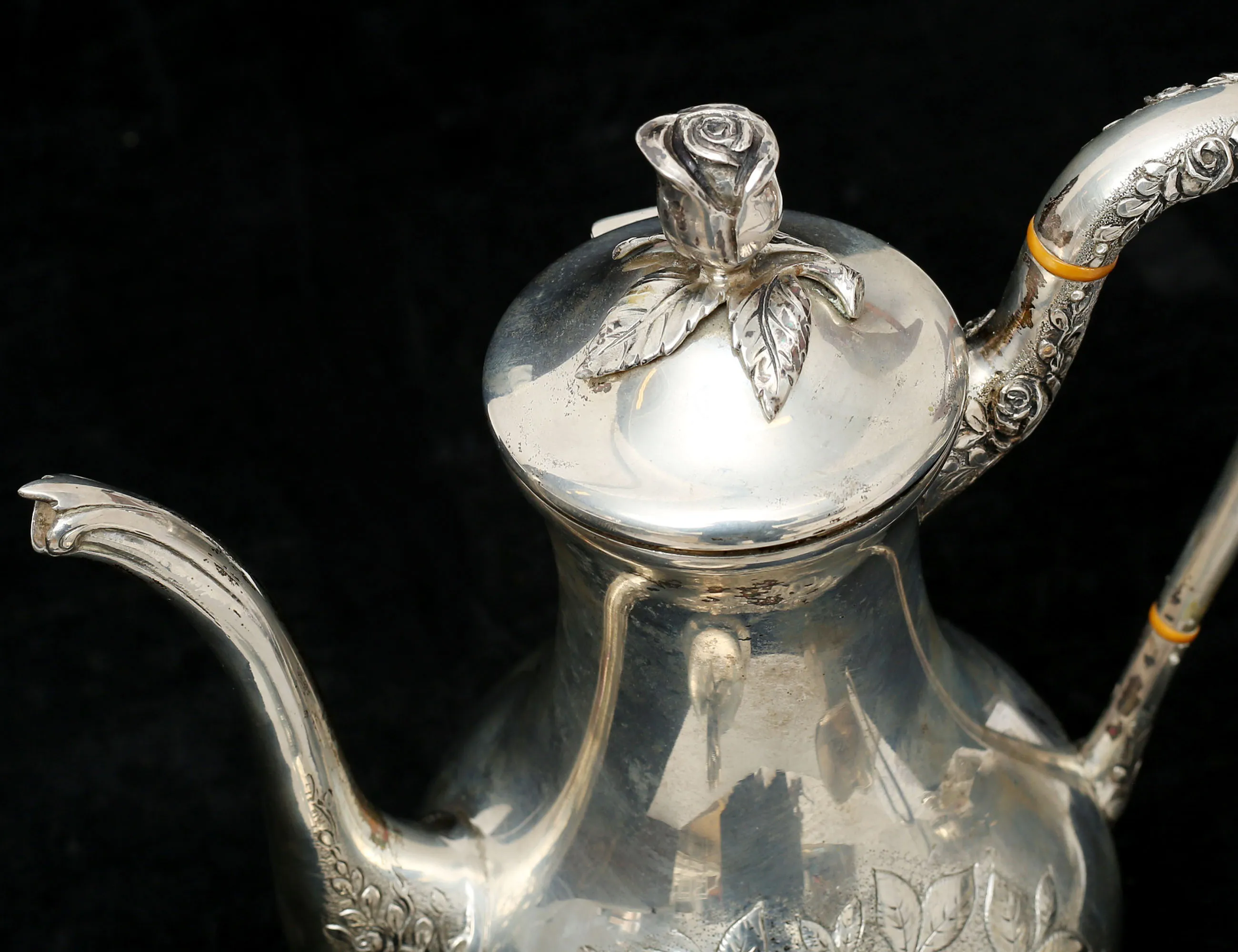 rokokomodell 1900-tal, svenska importstämplar, liv med reliefdekor, tassfötter, lock med krönande rosenknopp, vikt 1101 gram, höjd 24