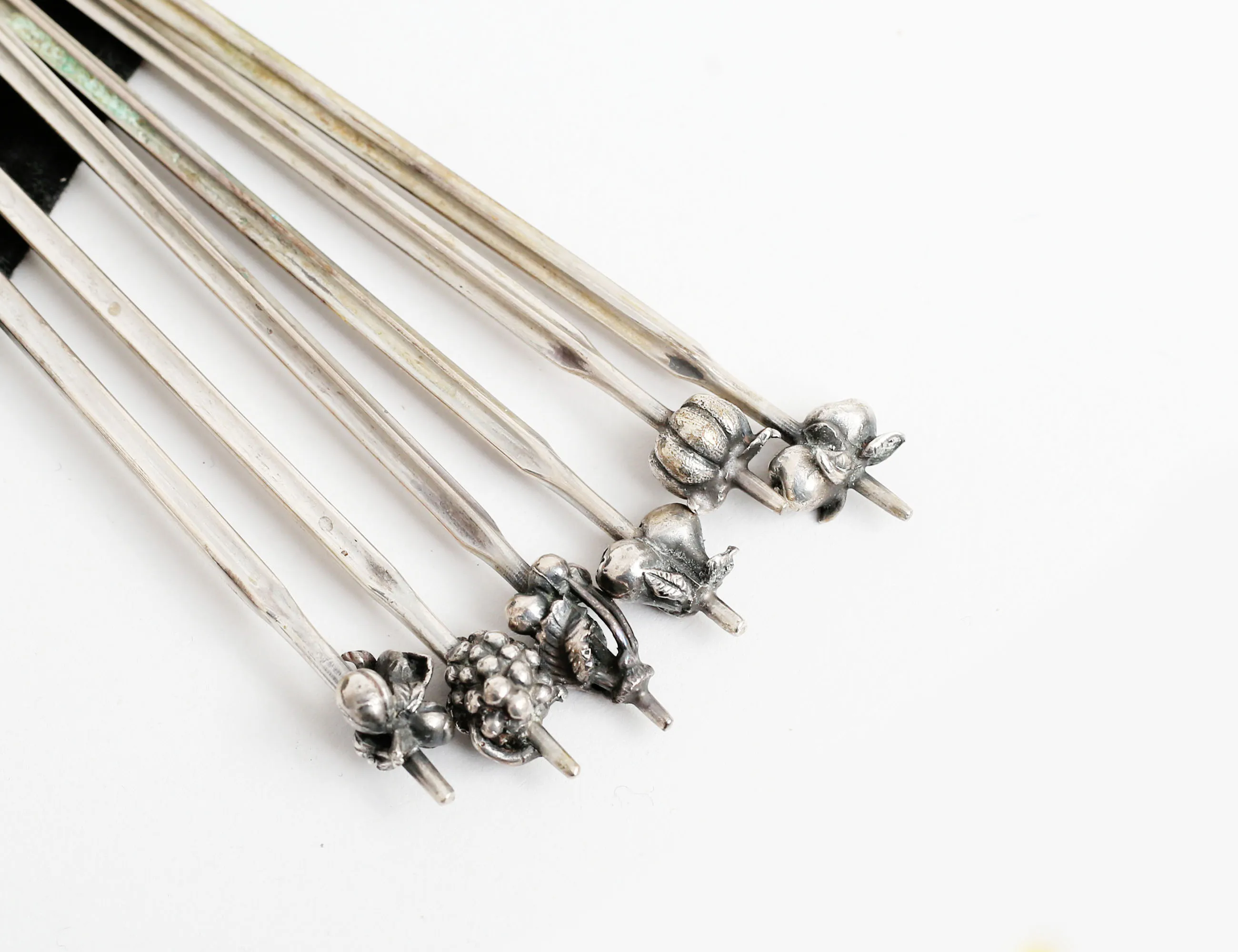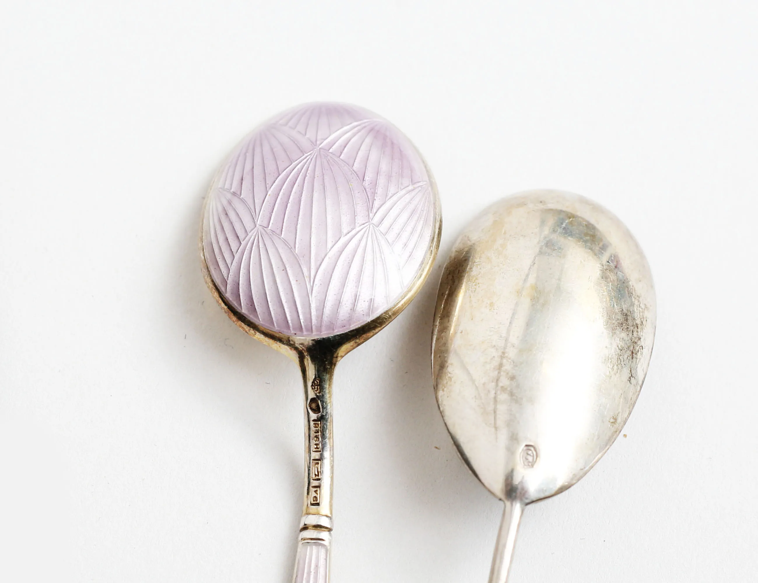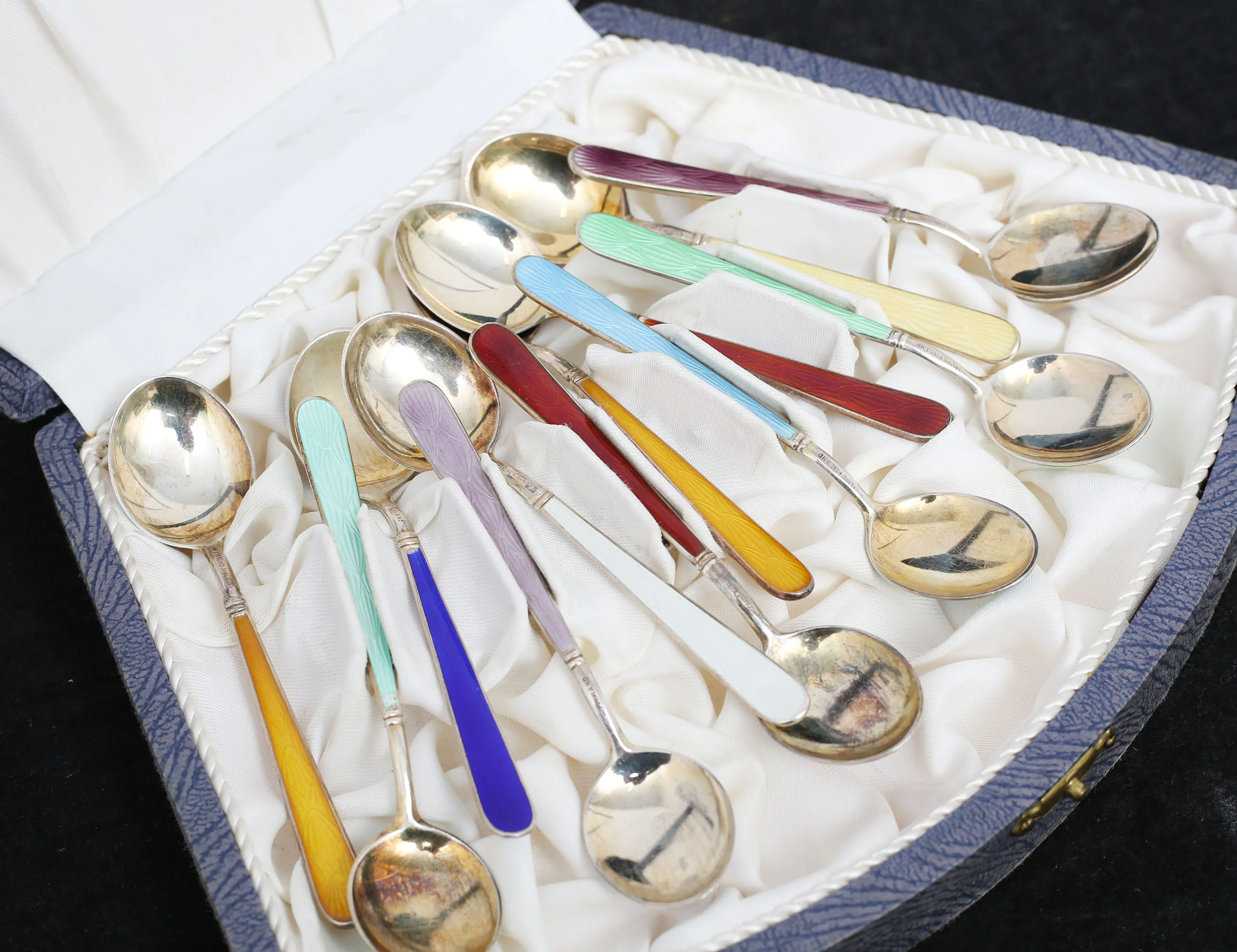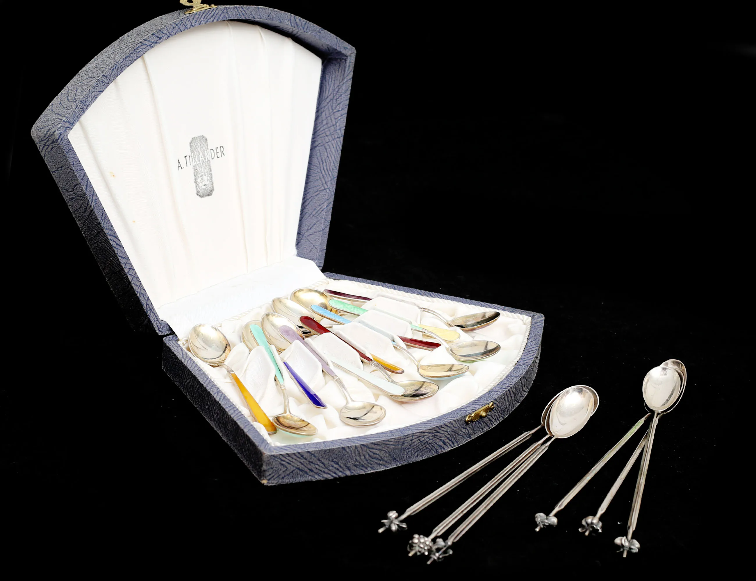 förgyllt sterlingsilver med emalj, Finland 1956, i etui ,ärkt A- Tillander, längd 10 (en med emaljbortfall), 6 cocktailskedar silver, längd 18, vikt 103 gram exklusive kaffeskedar (18)