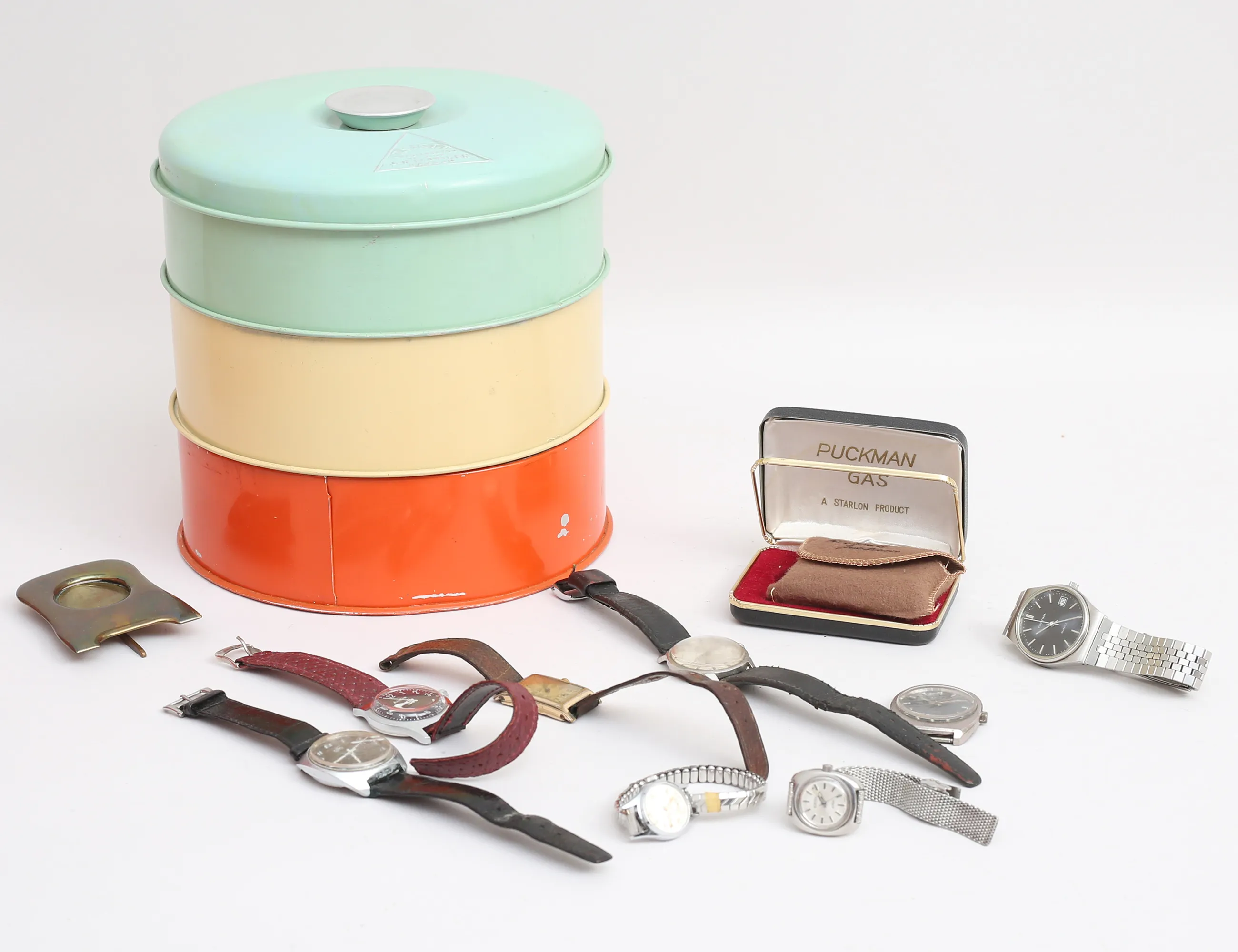 J-H Fabriken Sävsjö 1950/60-tal, höjd 20, damarmbandsur 2 stycken , herrarmbandsur 6 stycken, ej funktionstestade, gaständare Nichika Puckman i etui