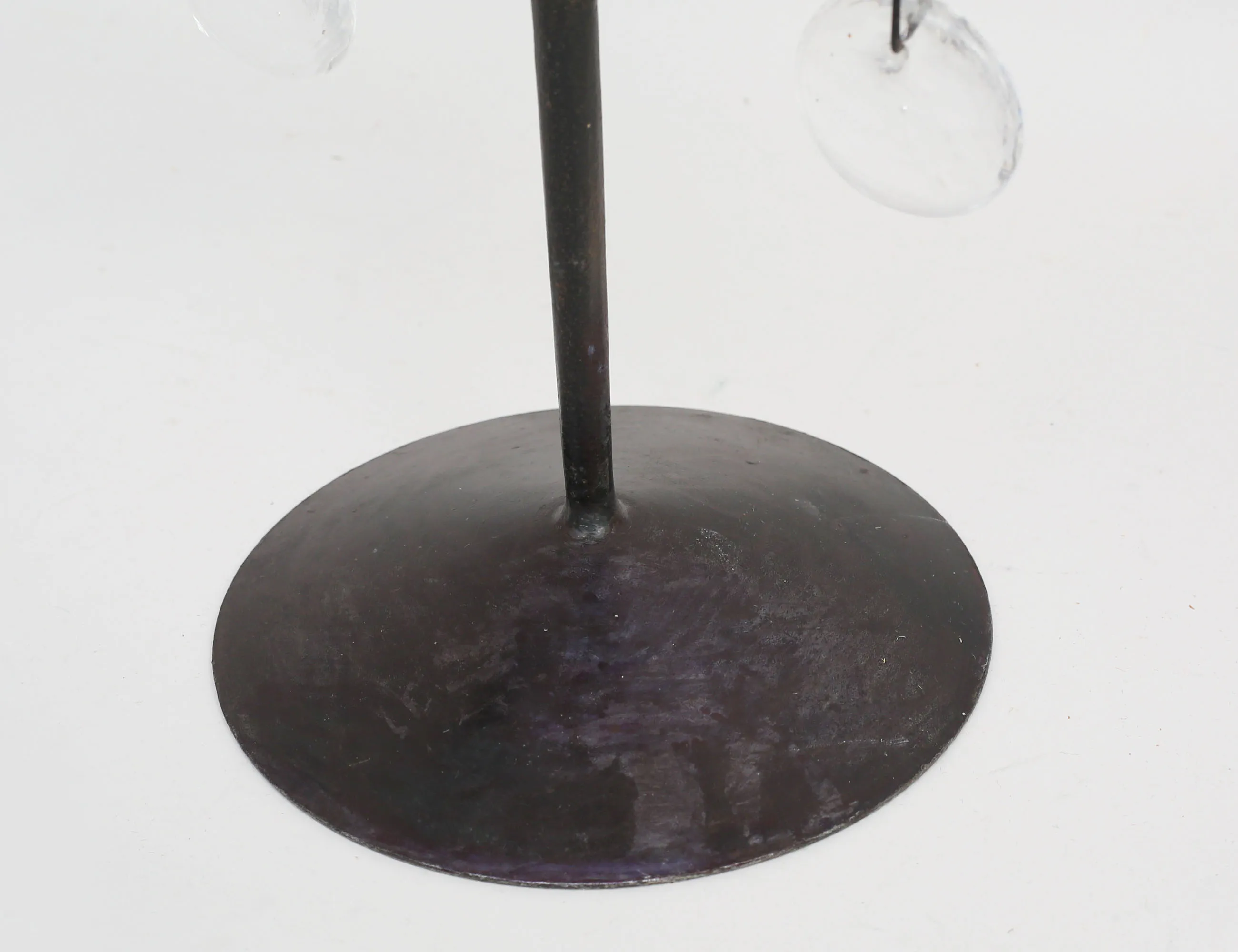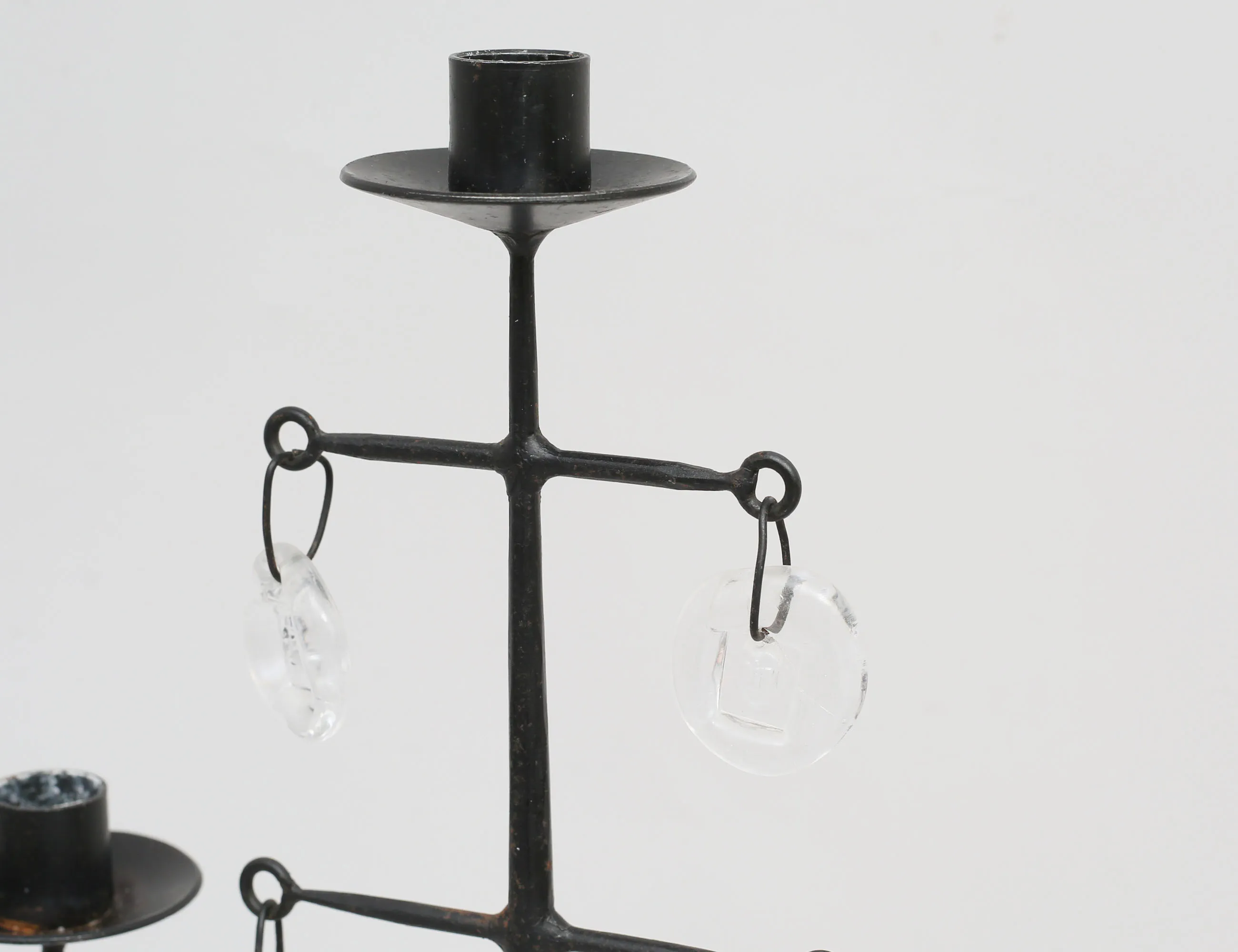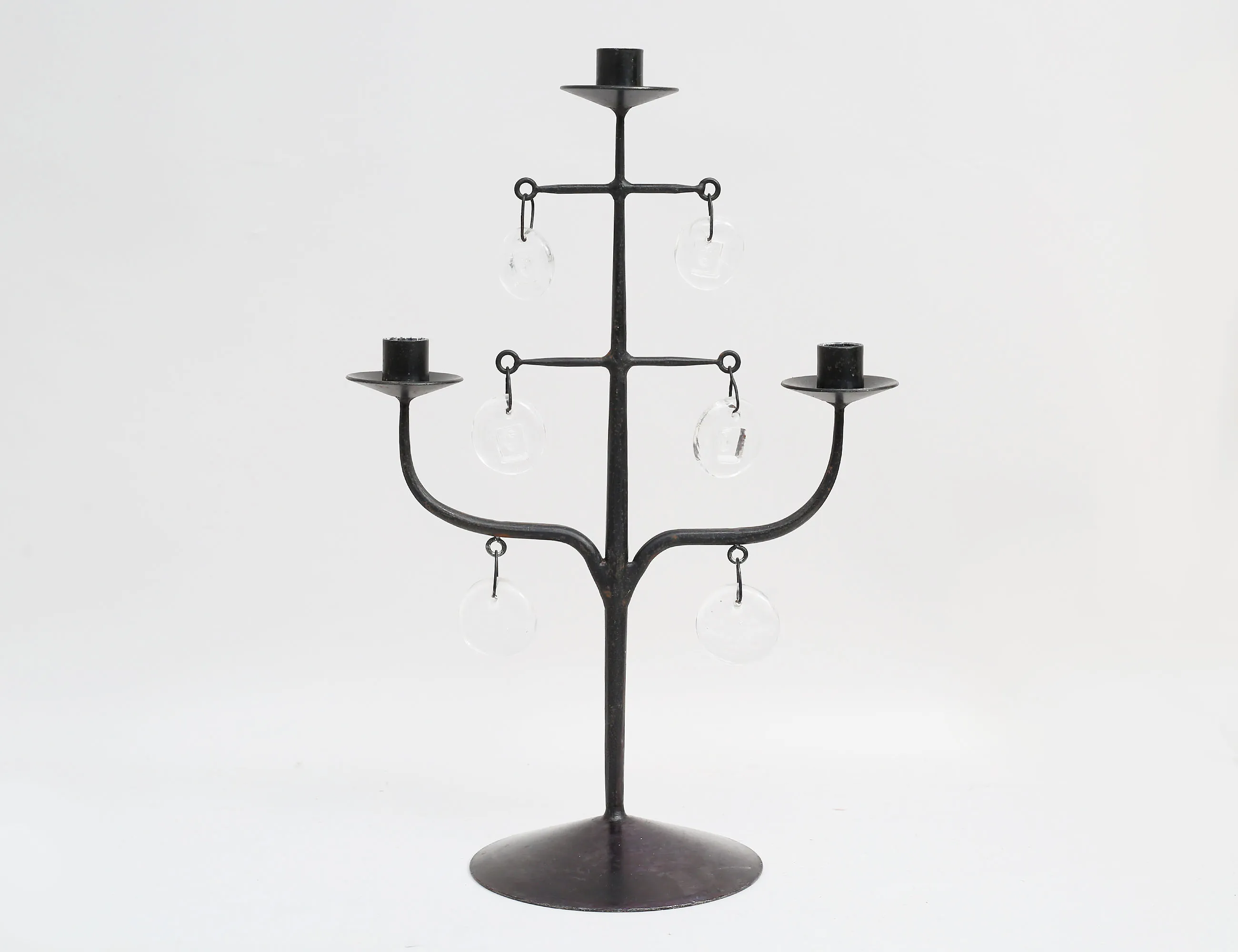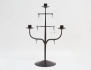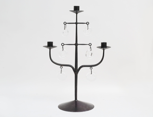 handsmidd, modell SH7, stomme svärtad järnsmide, kläppar med formblåst och gjutet glas, varav fyra med inpressade symboler, för tre ljus, höjd 47, bredd 28 8forplattans svärta med retuscheringar)