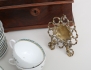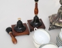 för 4 ljus, nysilver, tvådelad och konvertibel till ljusstake, höjd 50, 9 kaffekoppar med fat "Wexiö Guld" Gustavsberg, skrin c.1900, valnöt, höjd 14, bredd 24x17, 1 par ljusstakar Karl-Johan stil, trä och ben, höjd 20 (en med bräckage), klockställ i mässing