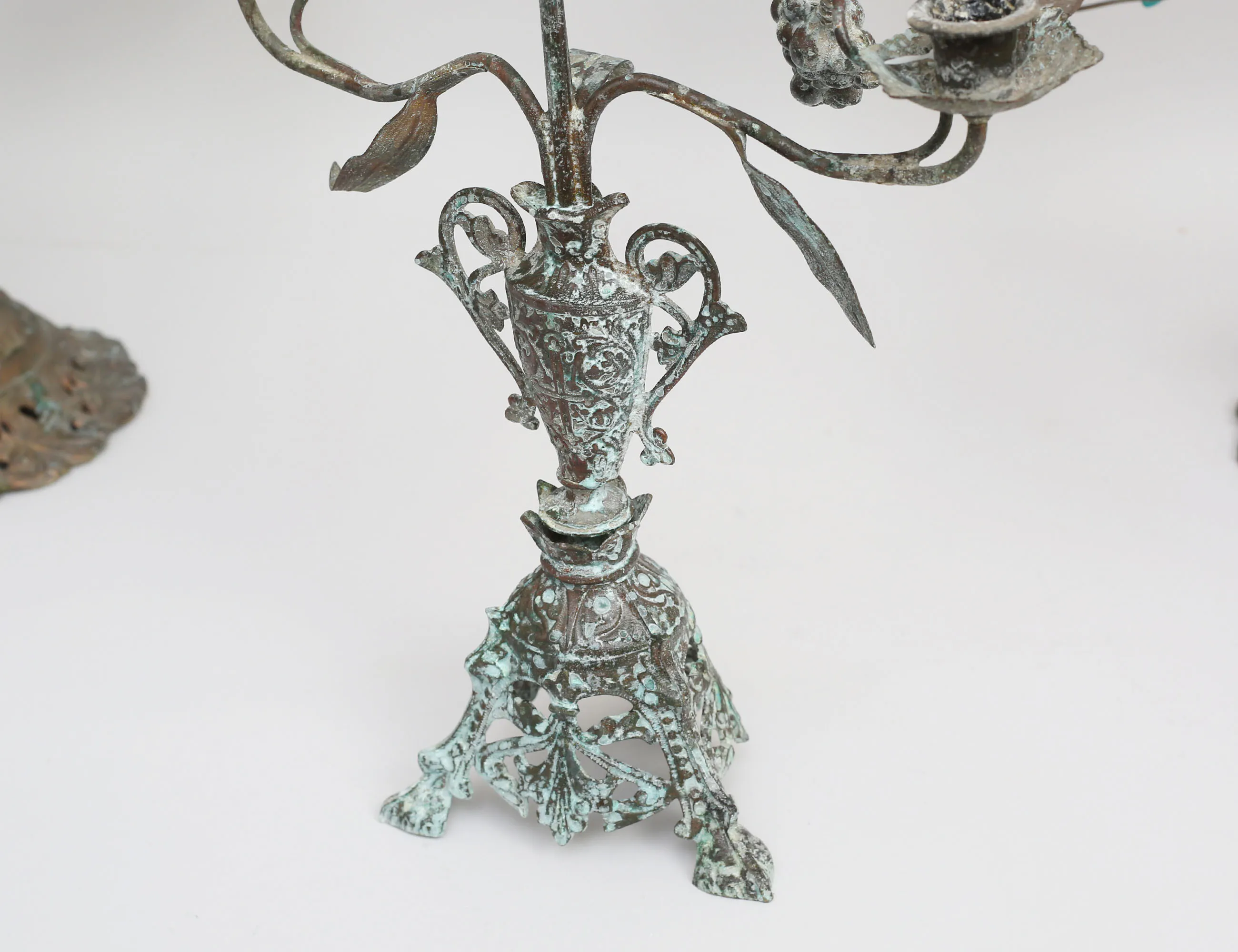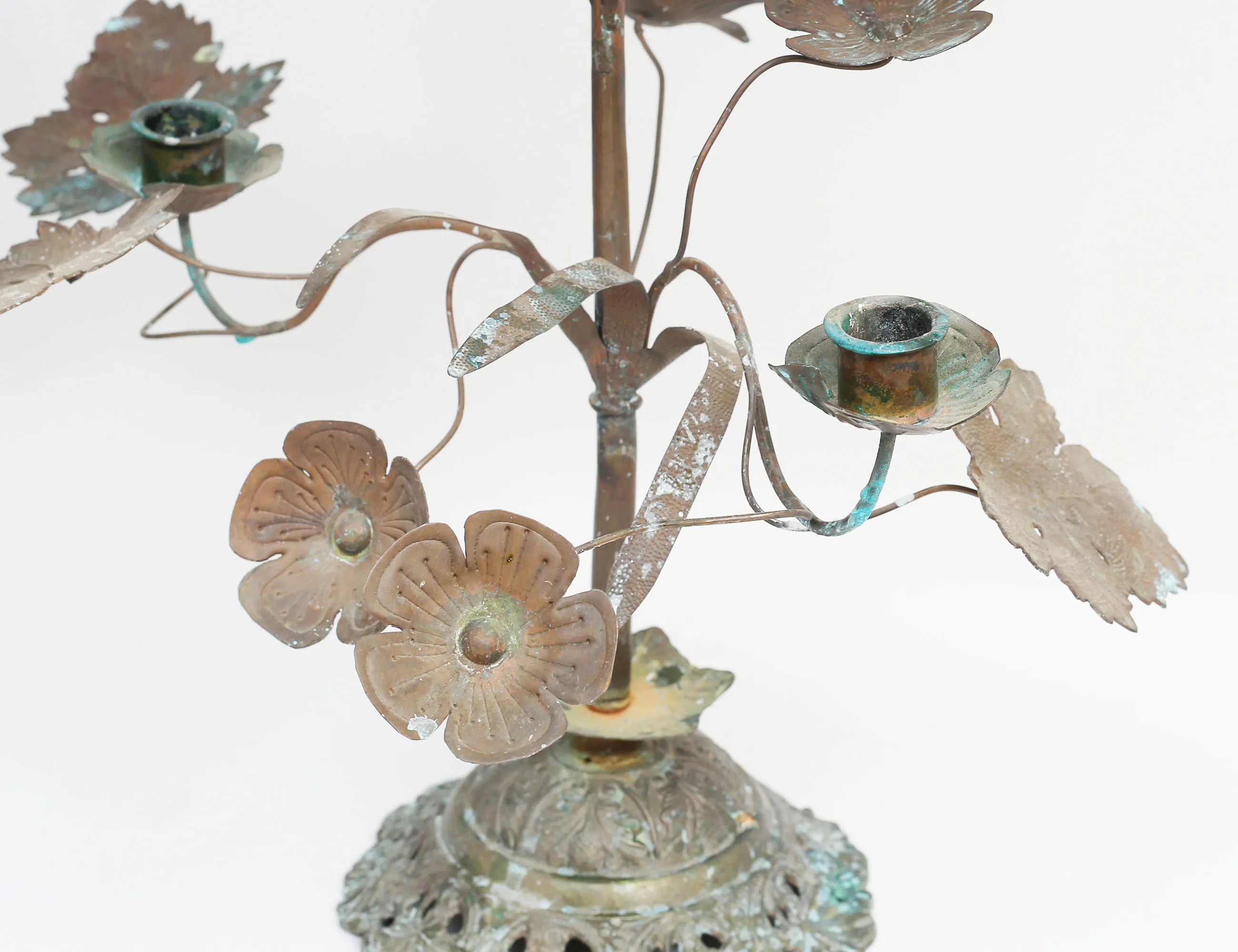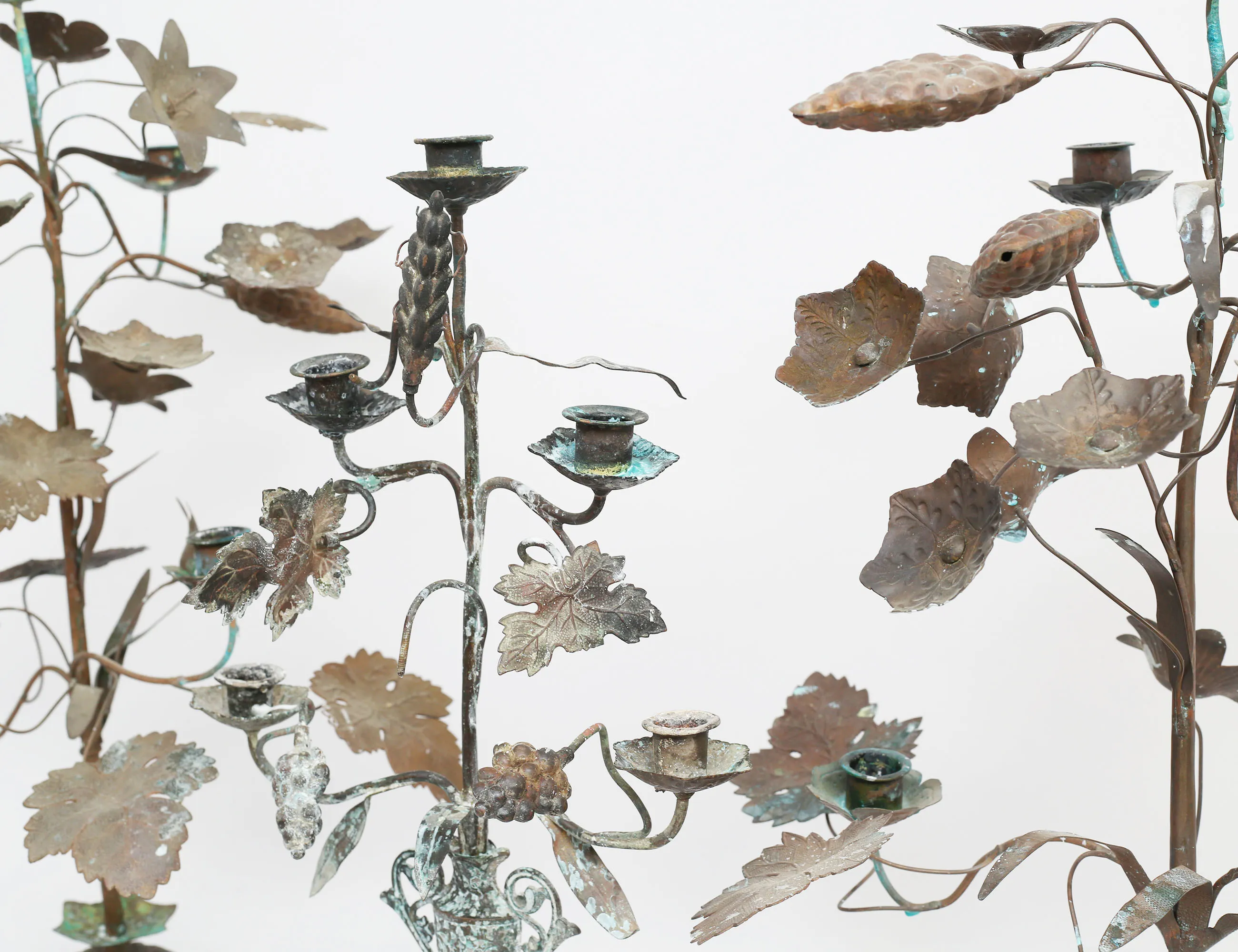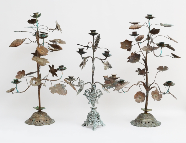 varav 1 par för vardera fem ljus, samt 1 för fem ljus, gjuten genombruten fot i mässing, i övrigt mässingsplåt formade som druvor och blad, höjd 61/52 (stearinrester)(3)