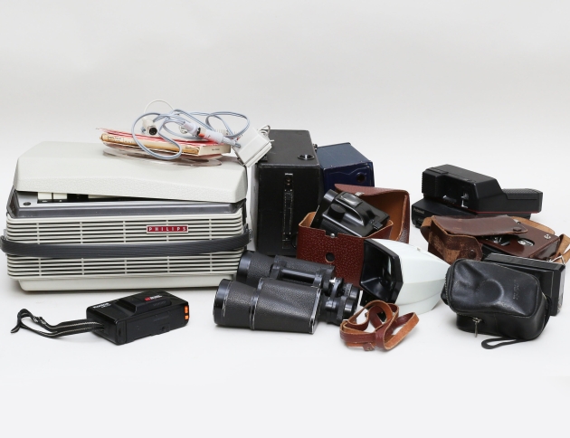10x50 Field 5,5, polaroidkamera Impulse, 2 kameror Instamatic, kamera Konica MG/D, Unibox, Kalimar Type A Viewer, filmkamera Agfa Movex 8, rullbandspelare Philips EL3541, troligen 1960-tal, ej funktionstestad, bredd 35, m.m.