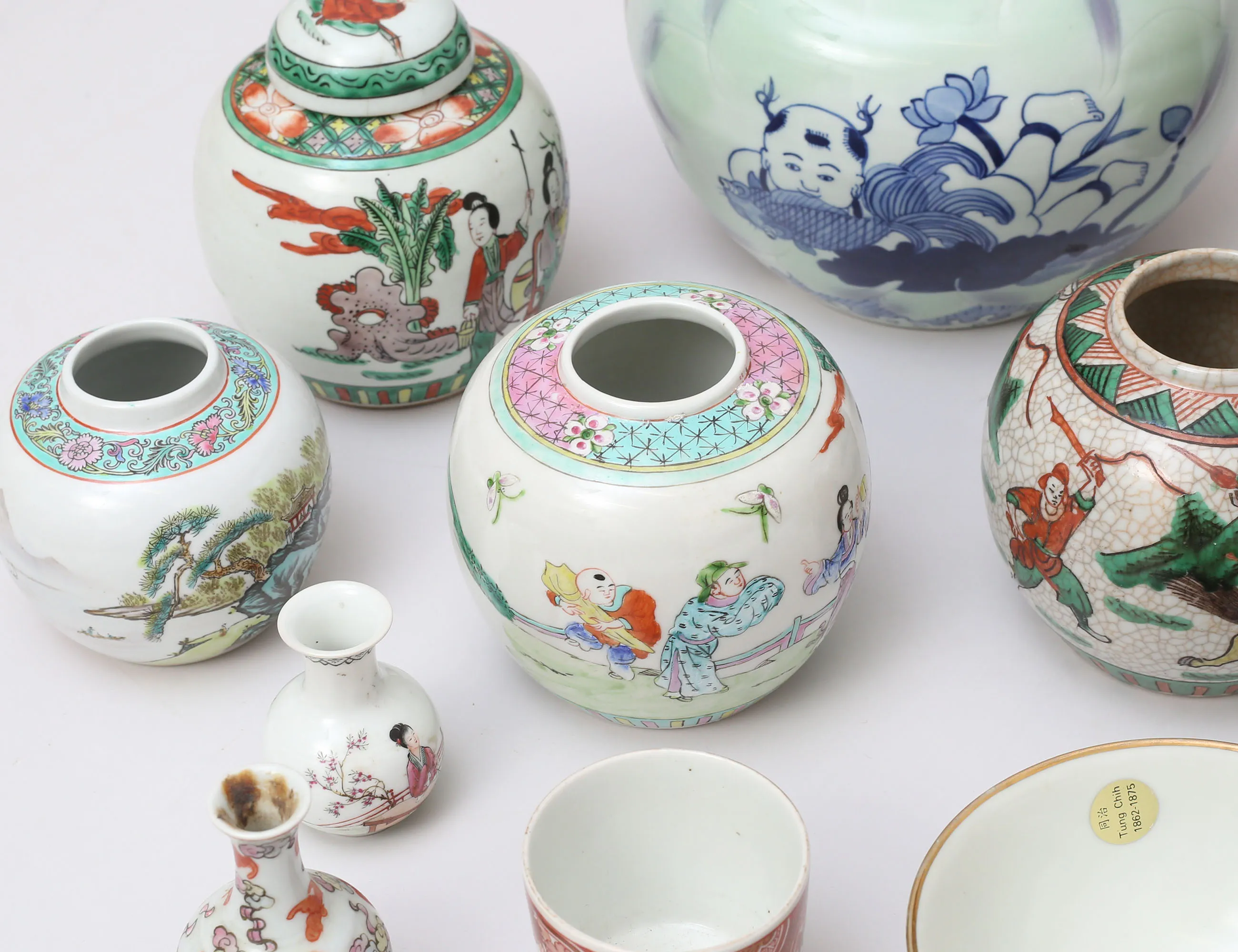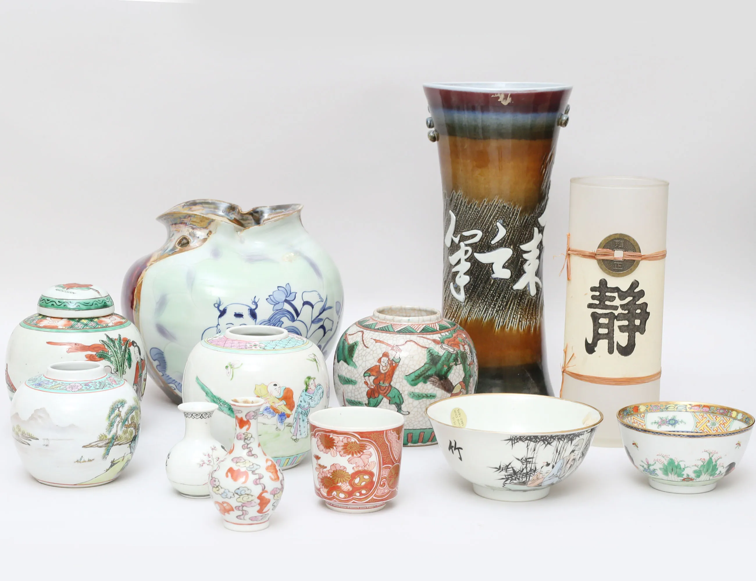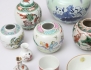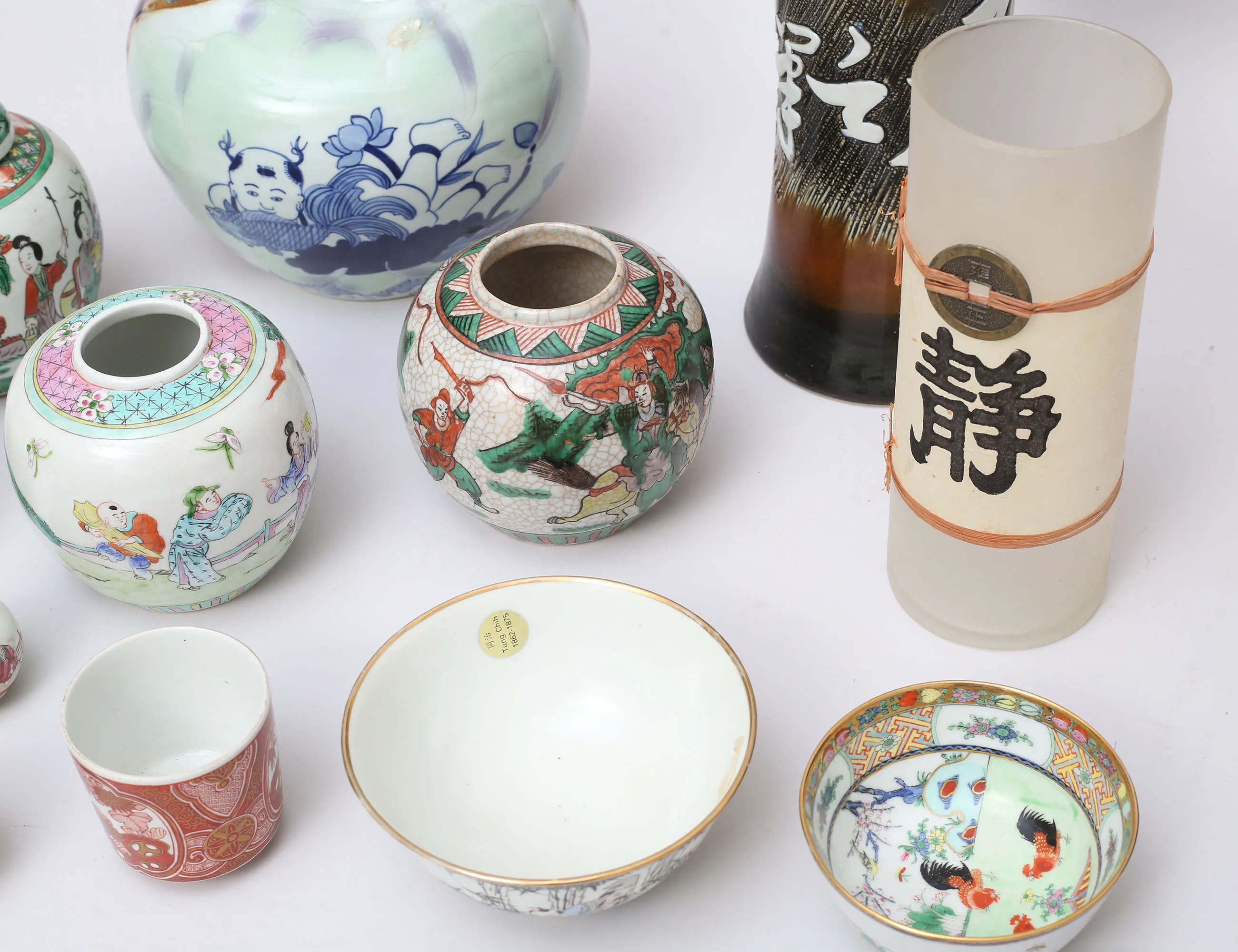 4 bojaner varav en med lock, höjd 10-14, 2 skålar, 3 vaser, 20-32, mugg , 2 miniatyrvaser , polykrom dekor