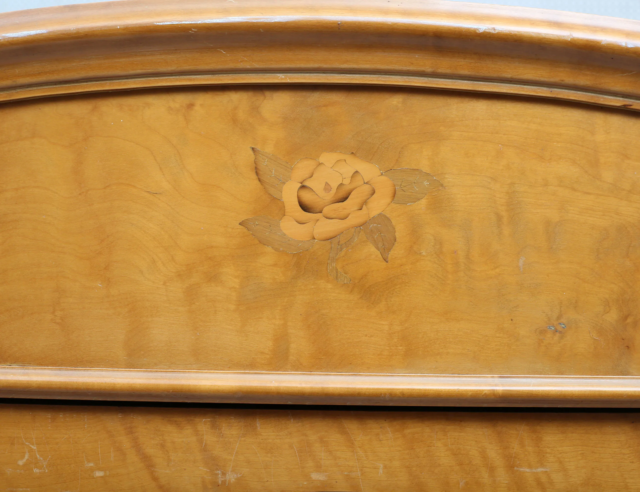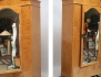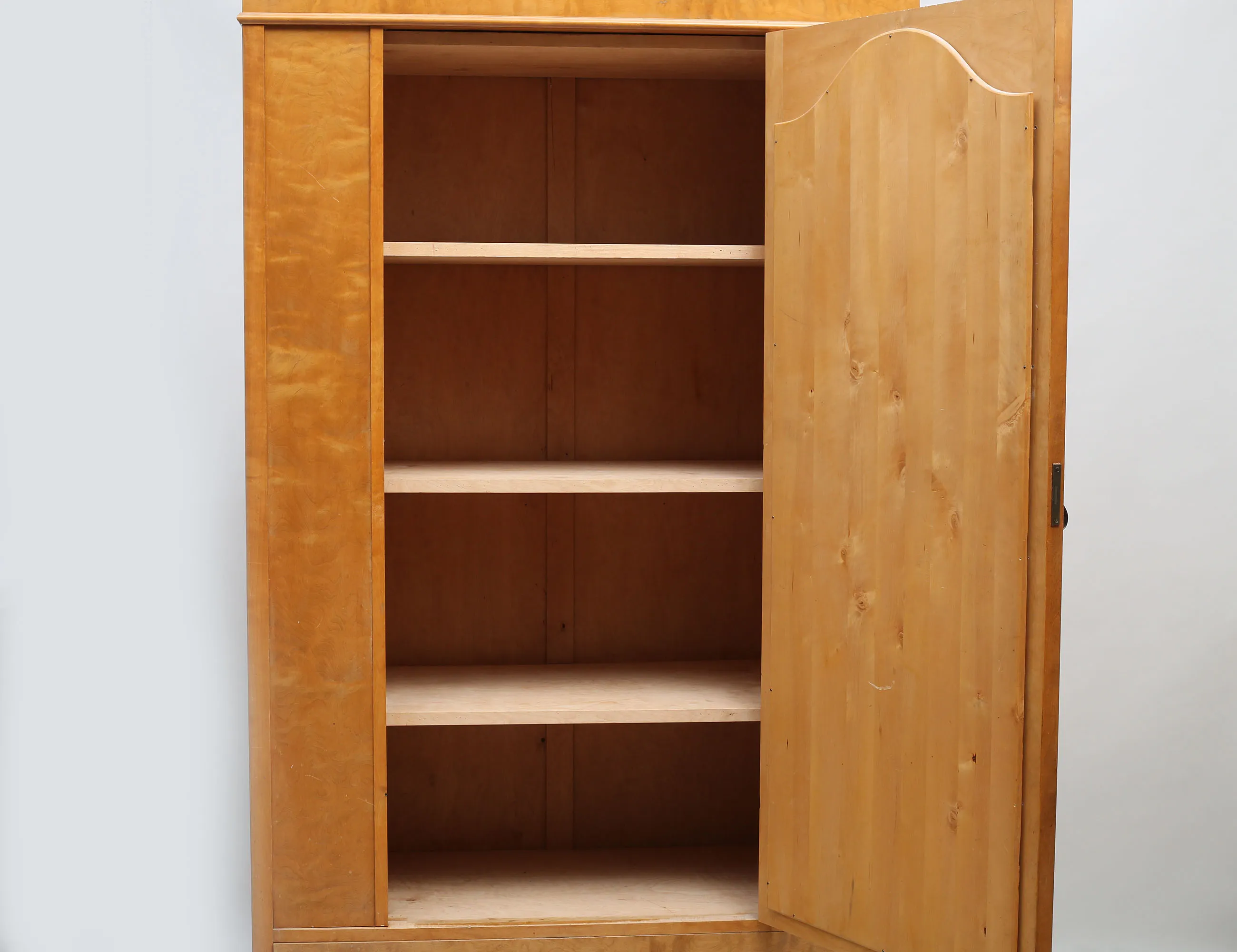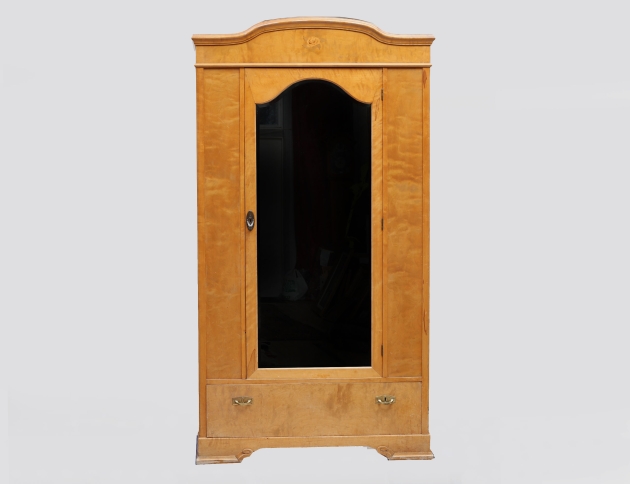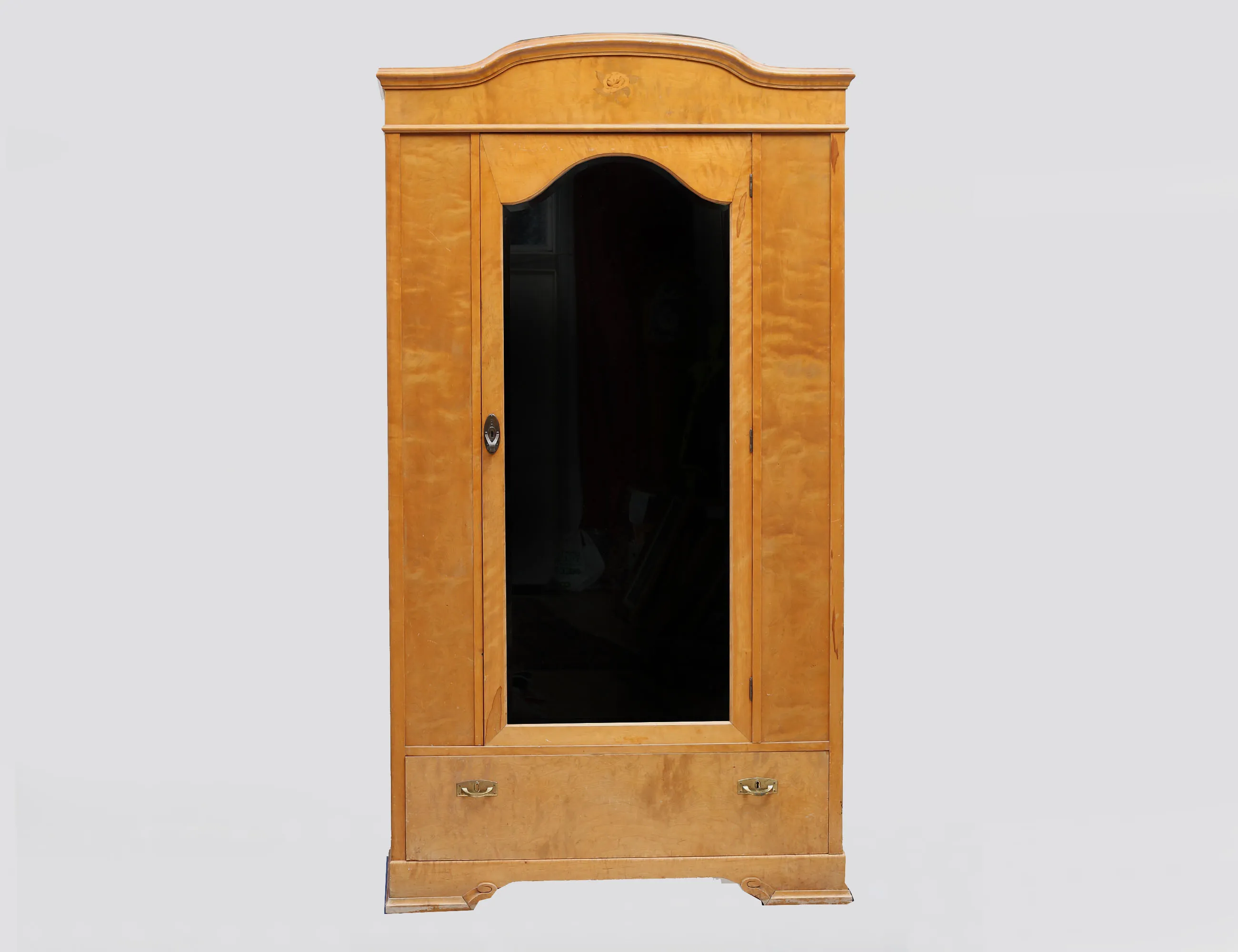 björk, krön med intarsia, dörrblad med fasettslipat spegelglas, tre hyllplan, nedtill en låda, beslag i mässing, höjd 197, bredd 105, djup 50