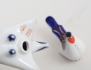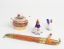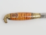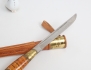 handtag i trä och mässing, blankpolerat knivblad märkt Made in Finland, skinnfodral, längd 26, tekanna 1900 S:t Petersburg, höjd 9, 2 figuriner Lomonosov Ryssland, höjd 7/9