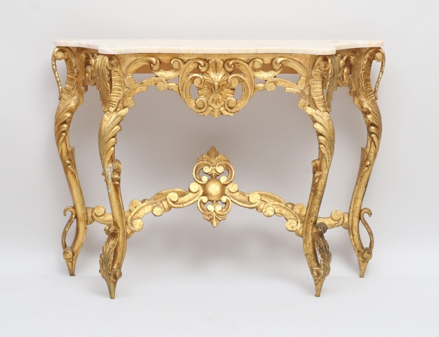 1900-talets andra hälft, rikt skuren förgylld dekor, delvis genombruten, konturerad skiva i sten, höjd 88, bredd 117, djup 33