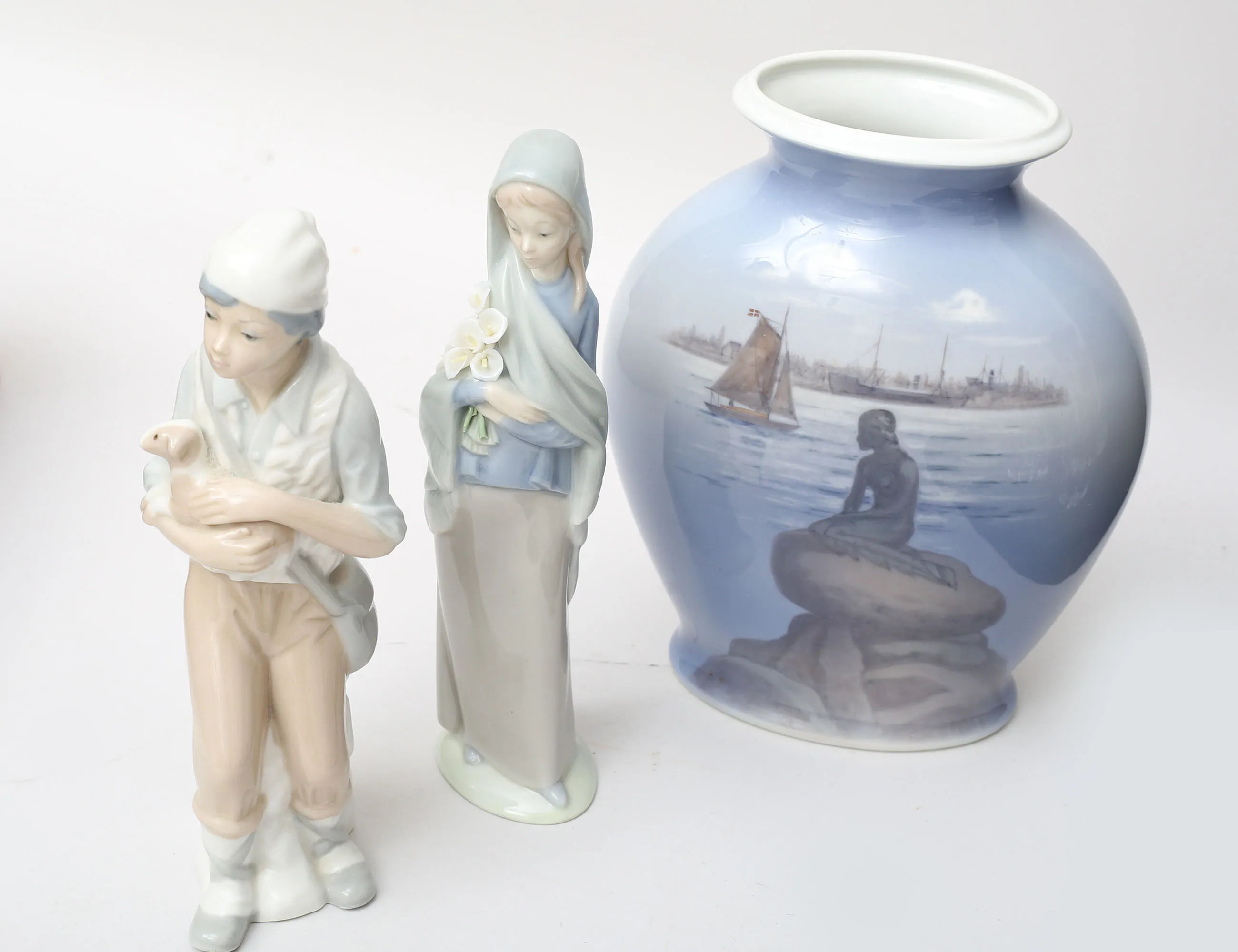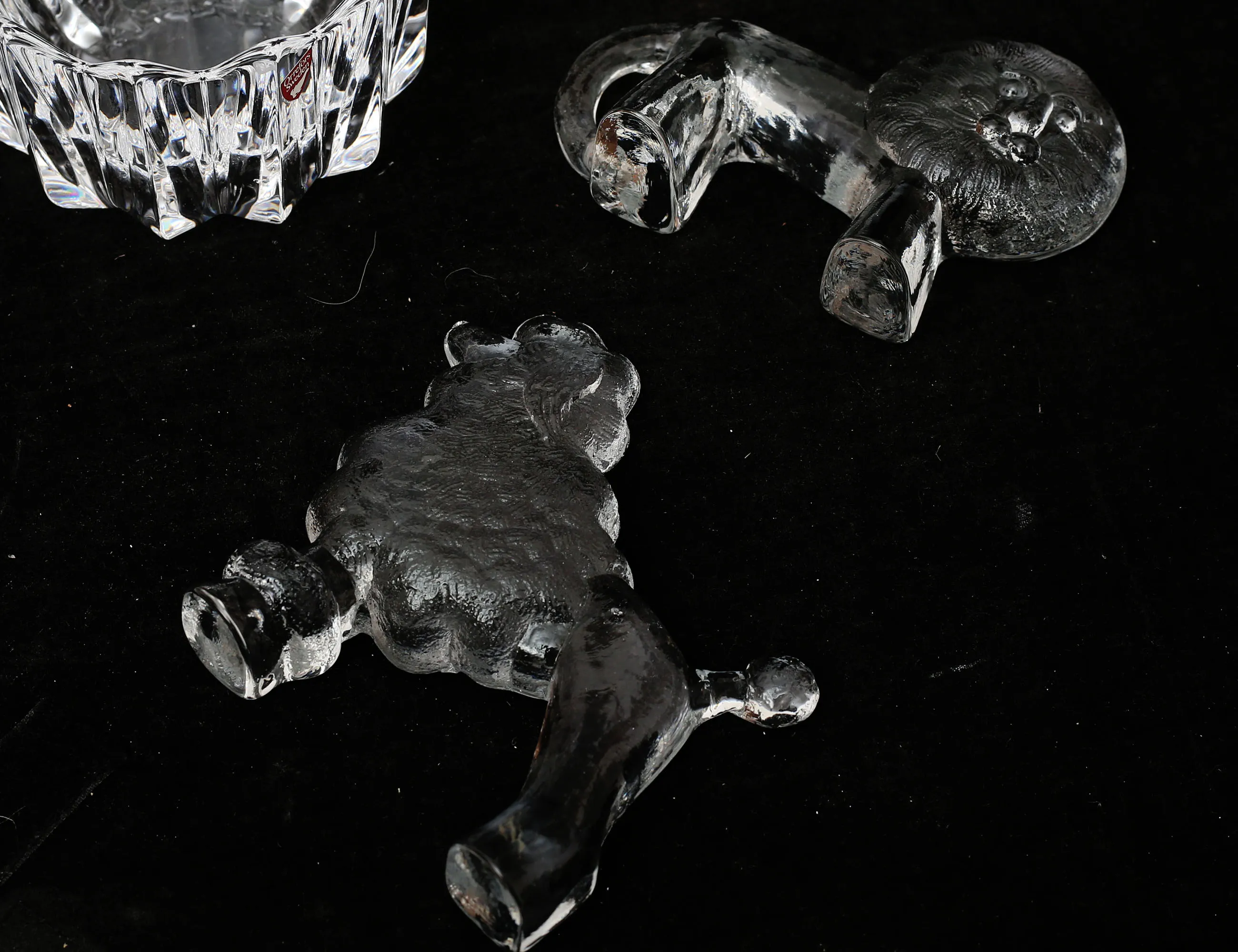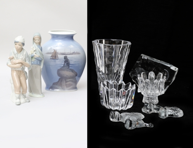 vas Olle Alberius Orrefors, höjd 20, 2 figuriner hund och lejon, Bertil Vallien, Kosta Boda, höjd 10/12, ljuslykta "Sunflower" Göran Wärff kosta Boda, höjd 10, skål Orrefors höjd 8, glasskulptur signerad Mats Jonasson höjd 14, vas "Lille havsfrue" Royal Copenhagen, höjd 22, 2 figuriner Spanien, höjd 22