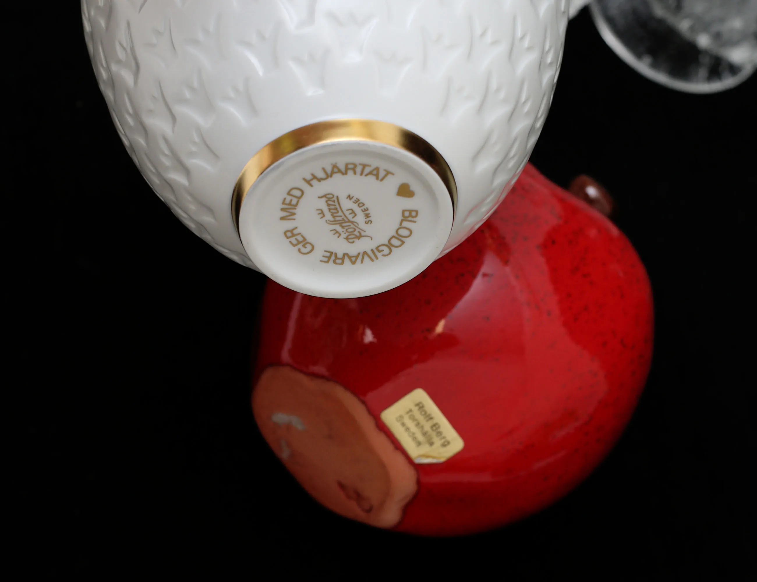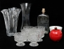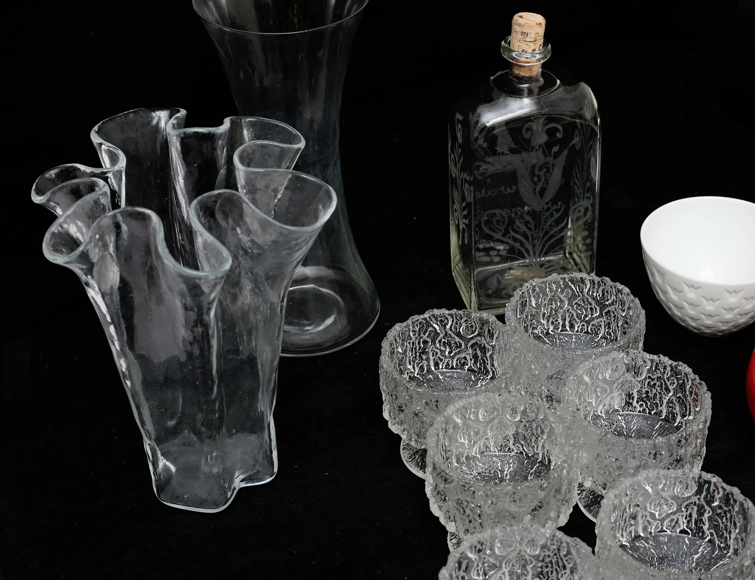 6 coupeglas "Aslak", Tapio Wirkkala Iittala, höjd 8,5, vas Muurla Finland, höjd 22, vas "Helena" Gunnar Cyrén Orrefors, höjd 25, plunta 1800-tal, glas kasad dekor 1870, höjd 20, Rolf Berg skulptur äpple, höjd 10, skål Gunnar Nylund Rörstrand, höjd 7