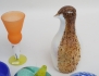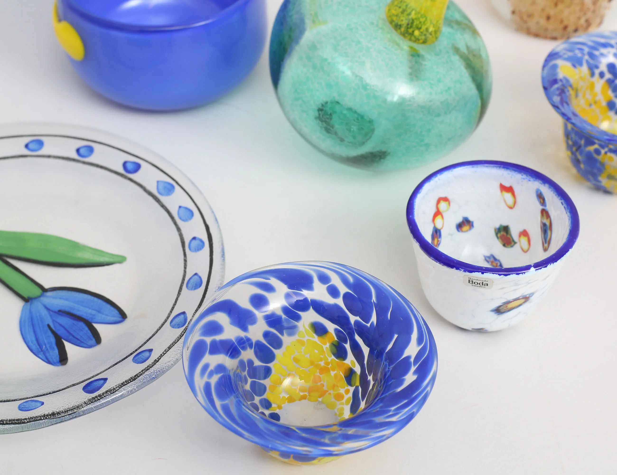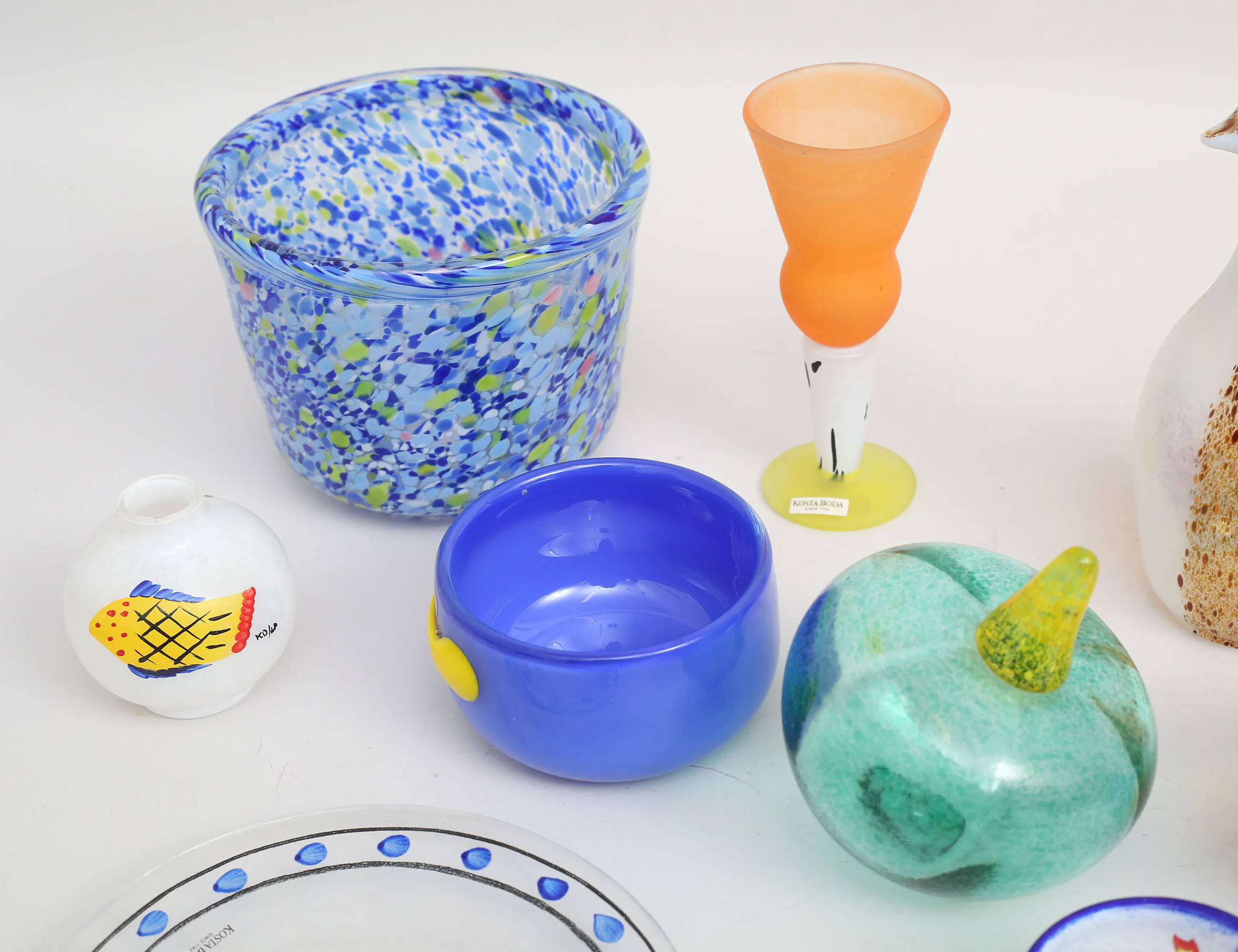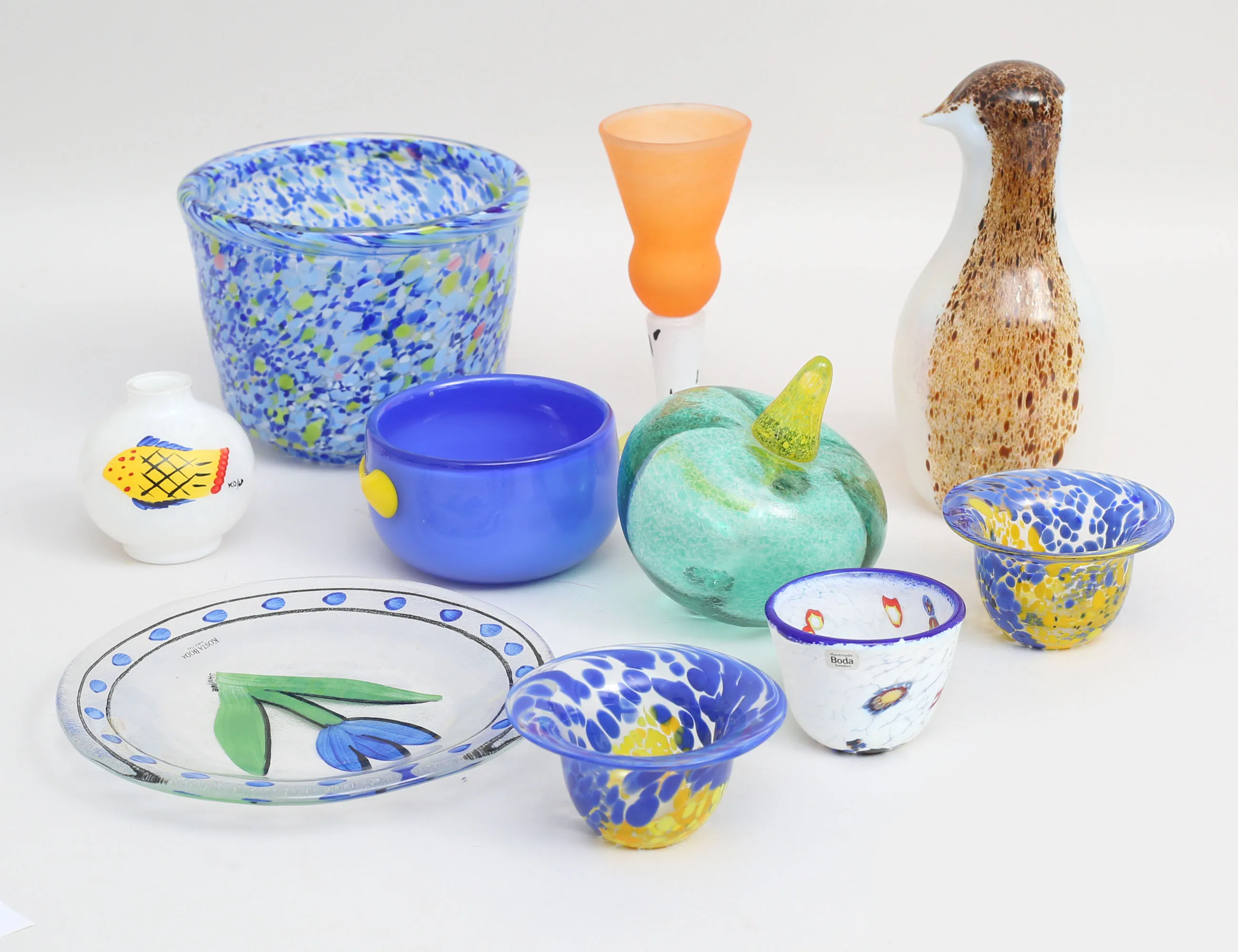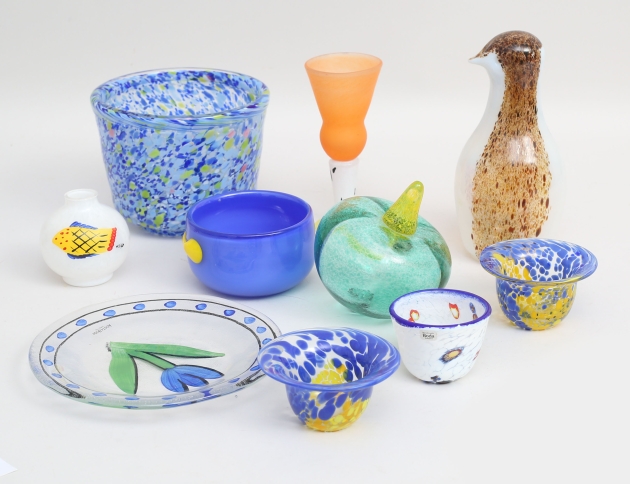 miniatyrskålar 2+1, ytterfoder höjd 12, assiett Ulrica Hydman Vallien, vinglas "Amazon", höjd 15, frukt höjd 11, Gunnel Sahlin, pingvin Monica Backström höjd 20, vad Ken Done höjd 7,5, skål Jonas Thorstensson höjd 6,5