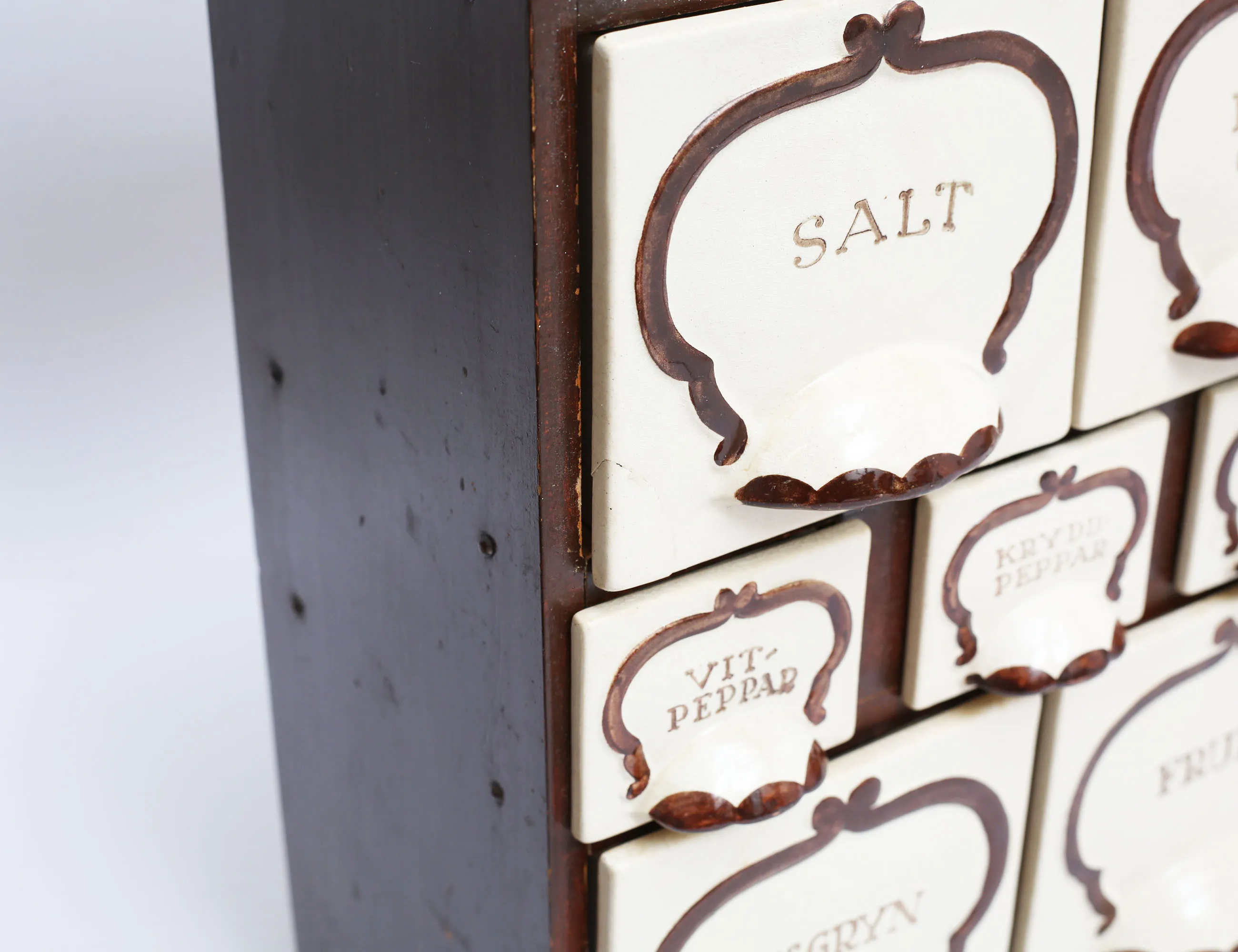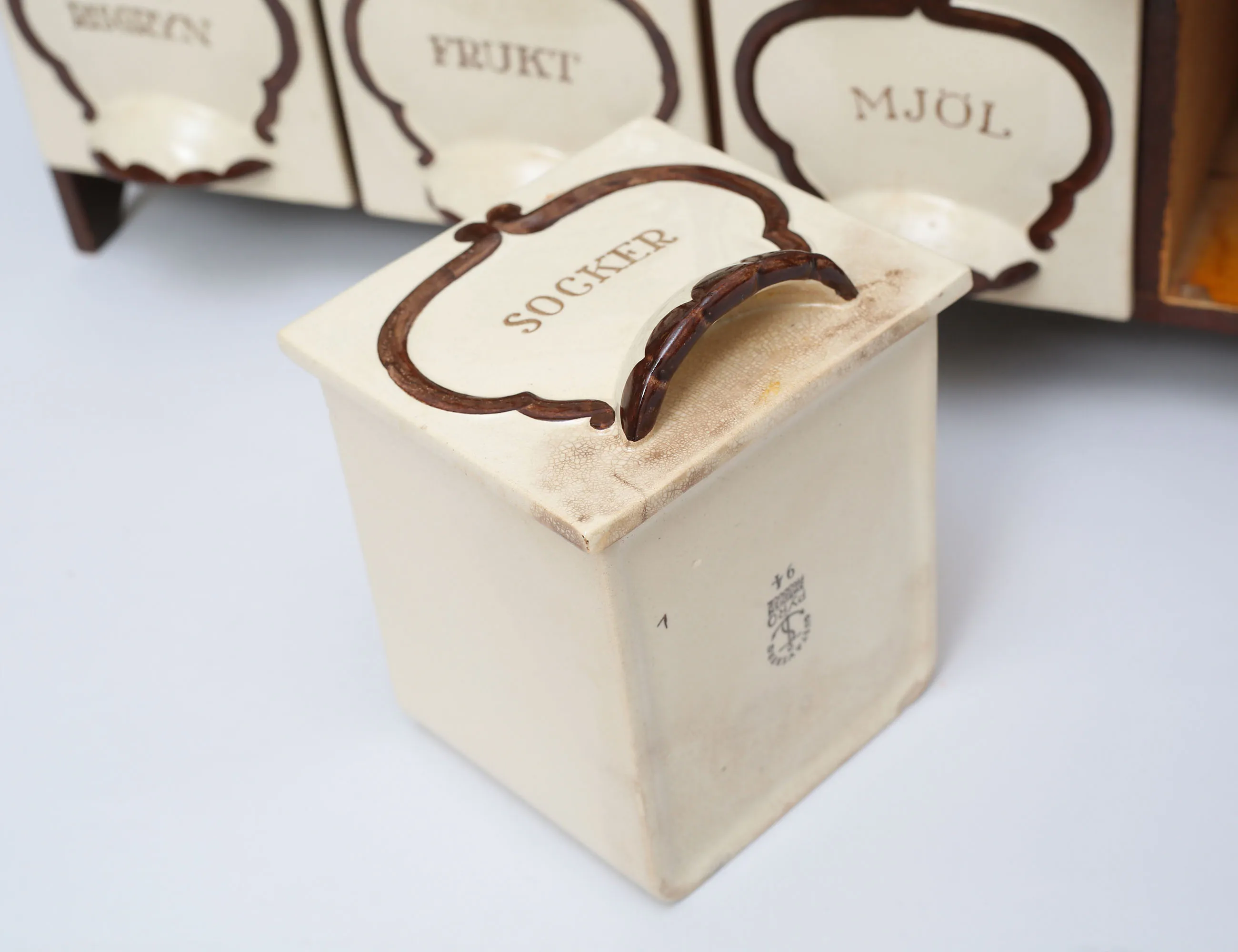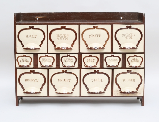 Wilhelm Kåge Gustavsberg 1930-tal, 14 olika lådor, hylla i bemålat trä, höj 37, bredd 51 (en med lagning)