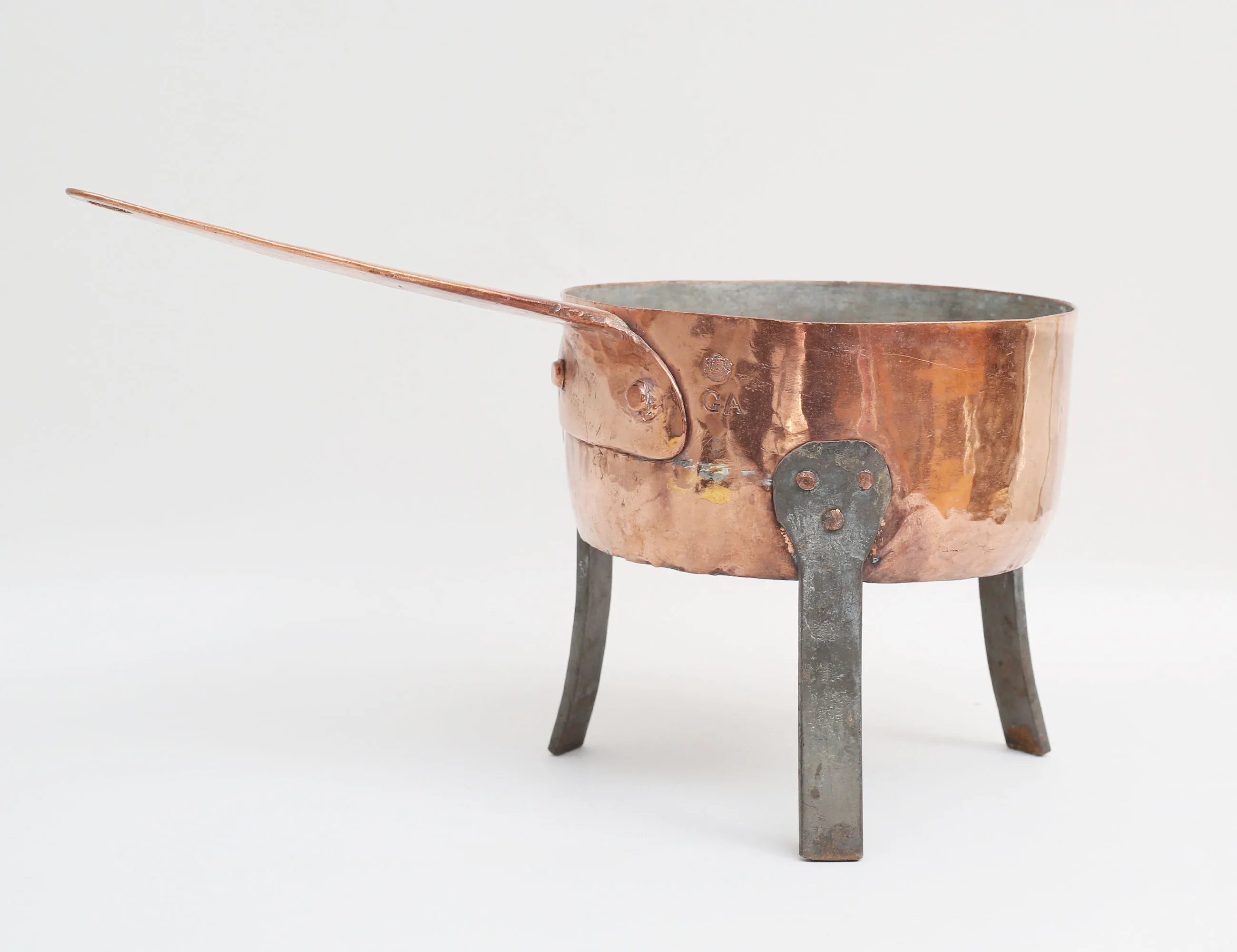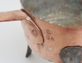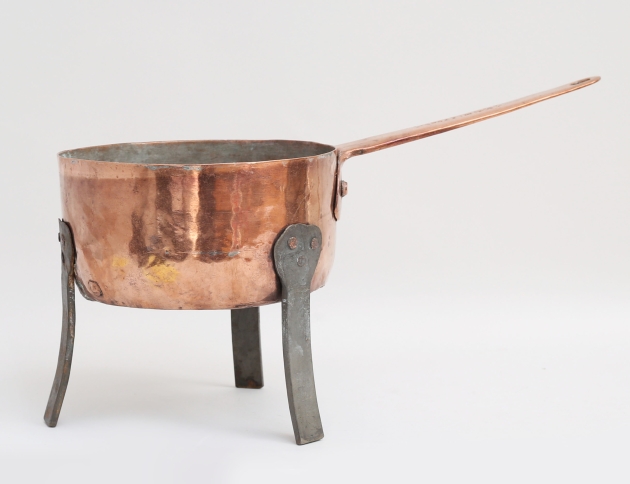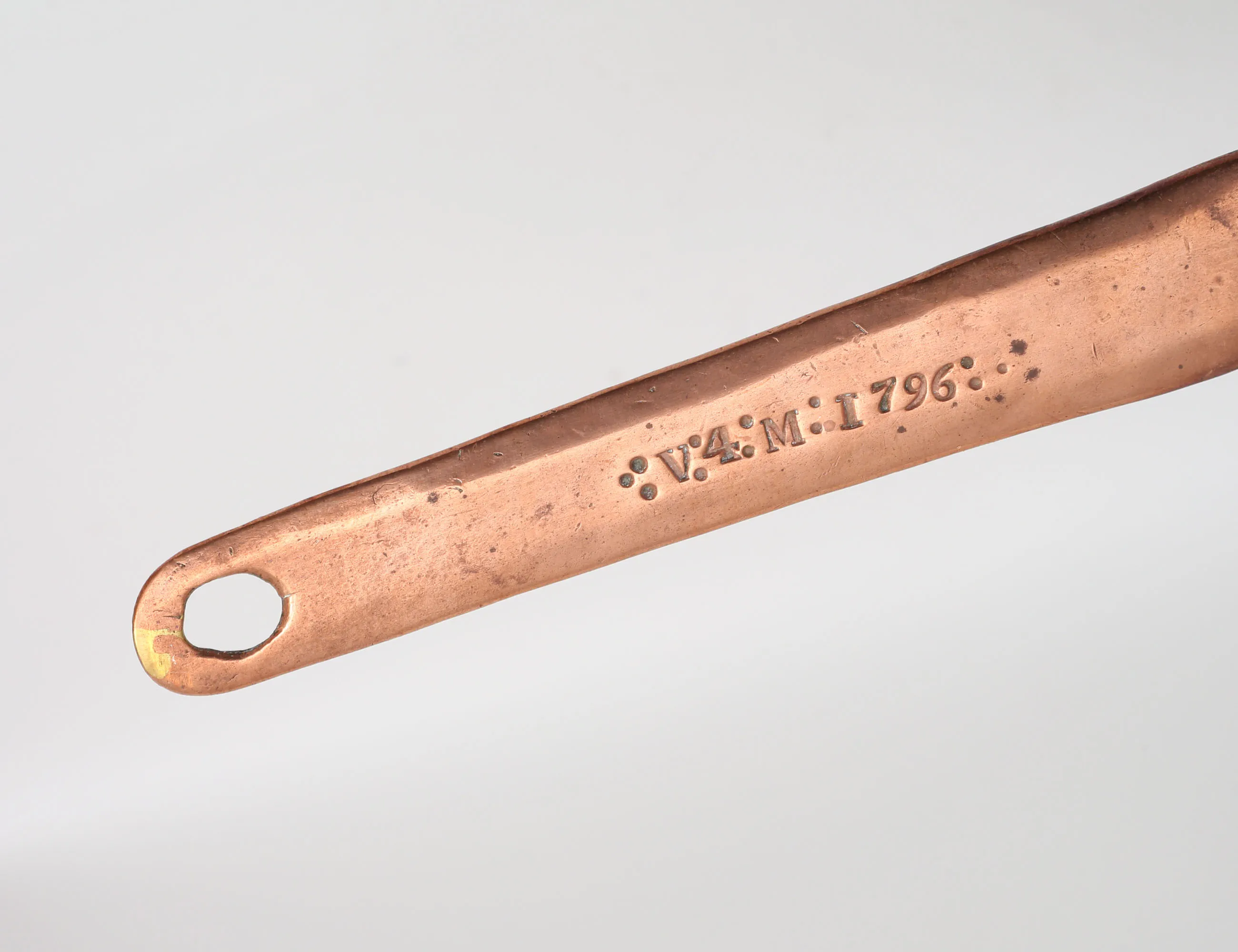 märkt GA under kunglig krona (Gustav IV Adolf), samt handtaget märkt V4M 1796, vikt 4 mark, senare ben i smide, höjd 21, bredd 45, diameter 22 (botten med äldre lagningar samt bristningar)