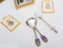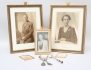 5 stycken fotografier i exklusiva ramar, varav 2 med kronprinskrona i förgylld mässing, istång och 2 skedar i nysilver med tre kronor i blå emalj, höjd 8-34, bredd 6,5-26,5