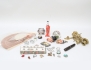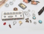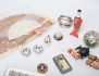 bijouterier, 1 par dosor porslin, dosa mässing/emalj, etui, flakong propp i form av kvinnohuvud, höjd 15, 2 bläckpennor, prydnadskorkar 3 stycken, 1 par väggljusstakar mässing, brevpress m.m.