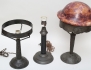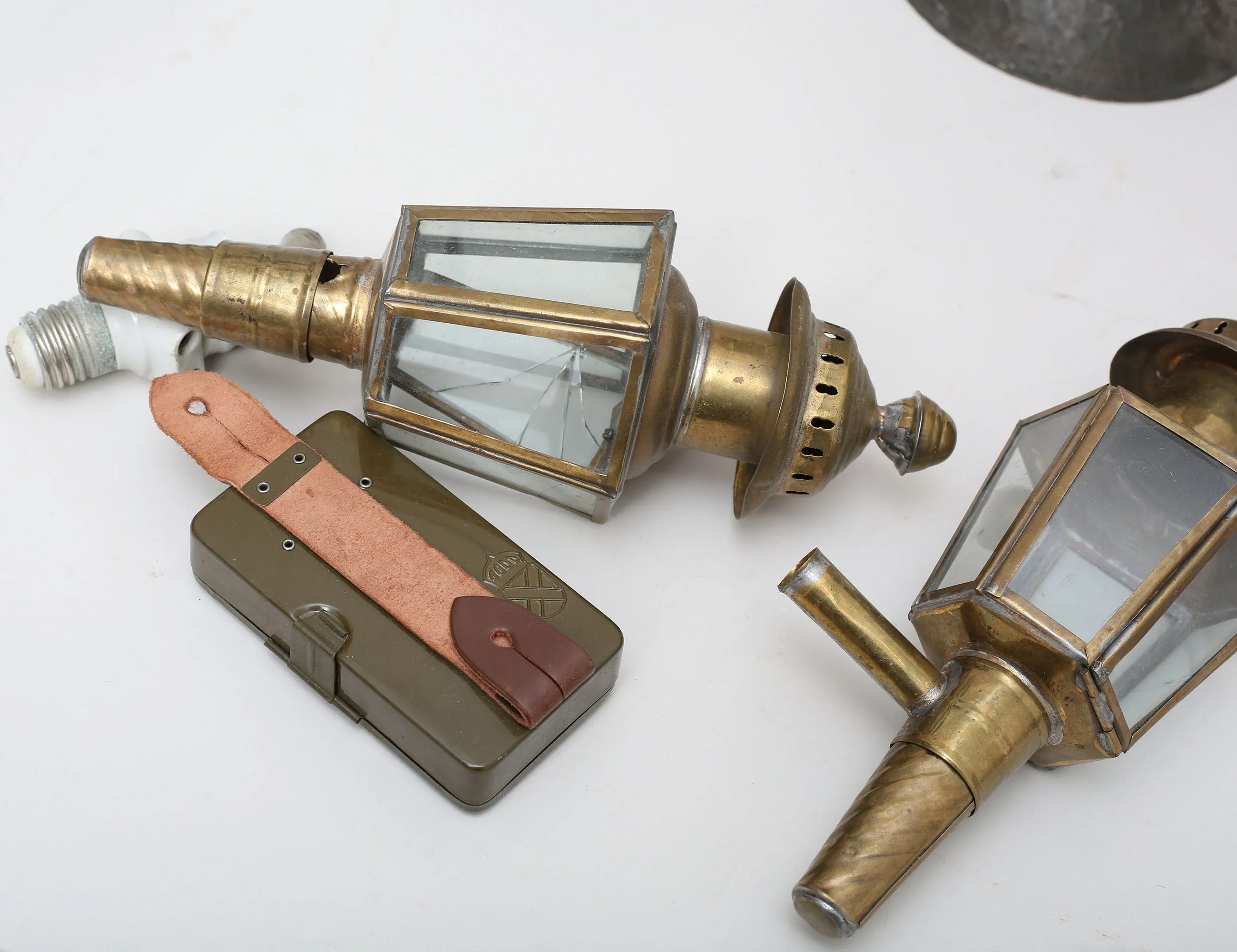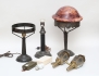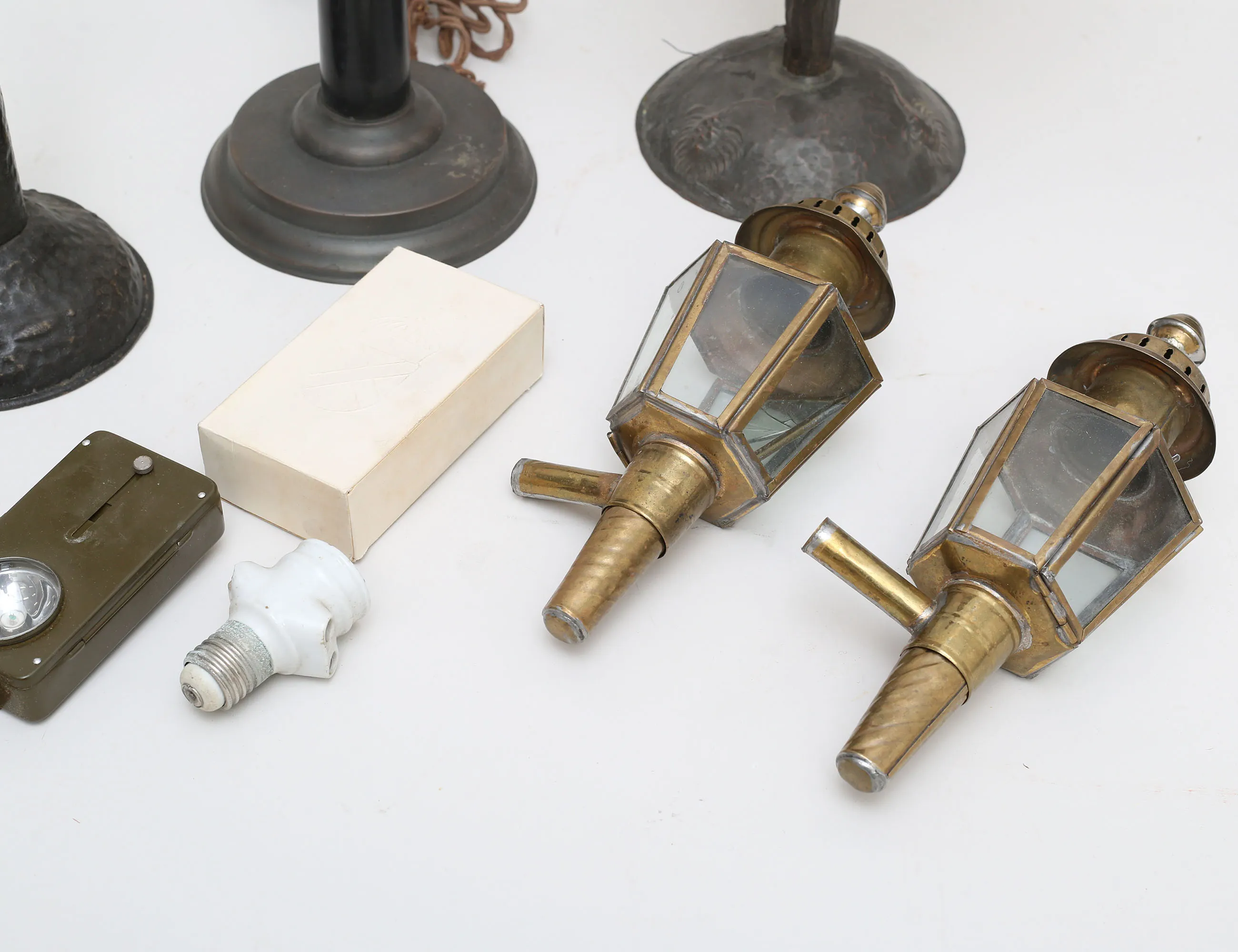 bordslampa jugend, patinerad koppar, melerad glaskupa, höjd 48 (saknar el och lamphållare), bordslampa hamrat smide, höjd 31 (saknar kupa), bordslampa mässing/svärtat trä, höjd 35, vagnslyktor 1 par, mässing, höjd 28 (ett glas med skada), ficklampor 1 par i originalkartong