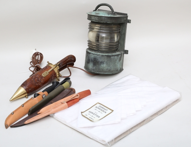 senare el, höjd 26, trancherset orientalisk, skuret träfodral, längd 32, 3 dolkar i fodral, 2 jaktknivar i fodral, bordsduk med 6 servetter, 140x180, 40x40