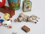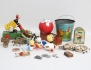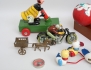 motorcykel MAC700 Arnold 3, 50-19, litograferad plåt, Tyskland, längd 20, 2 hästar textil, tidigt 1900-tal, dominospel, benmarker i mahognyfodral, trävagn med rörlig figur, m.m. (MC ej funktionstestad)