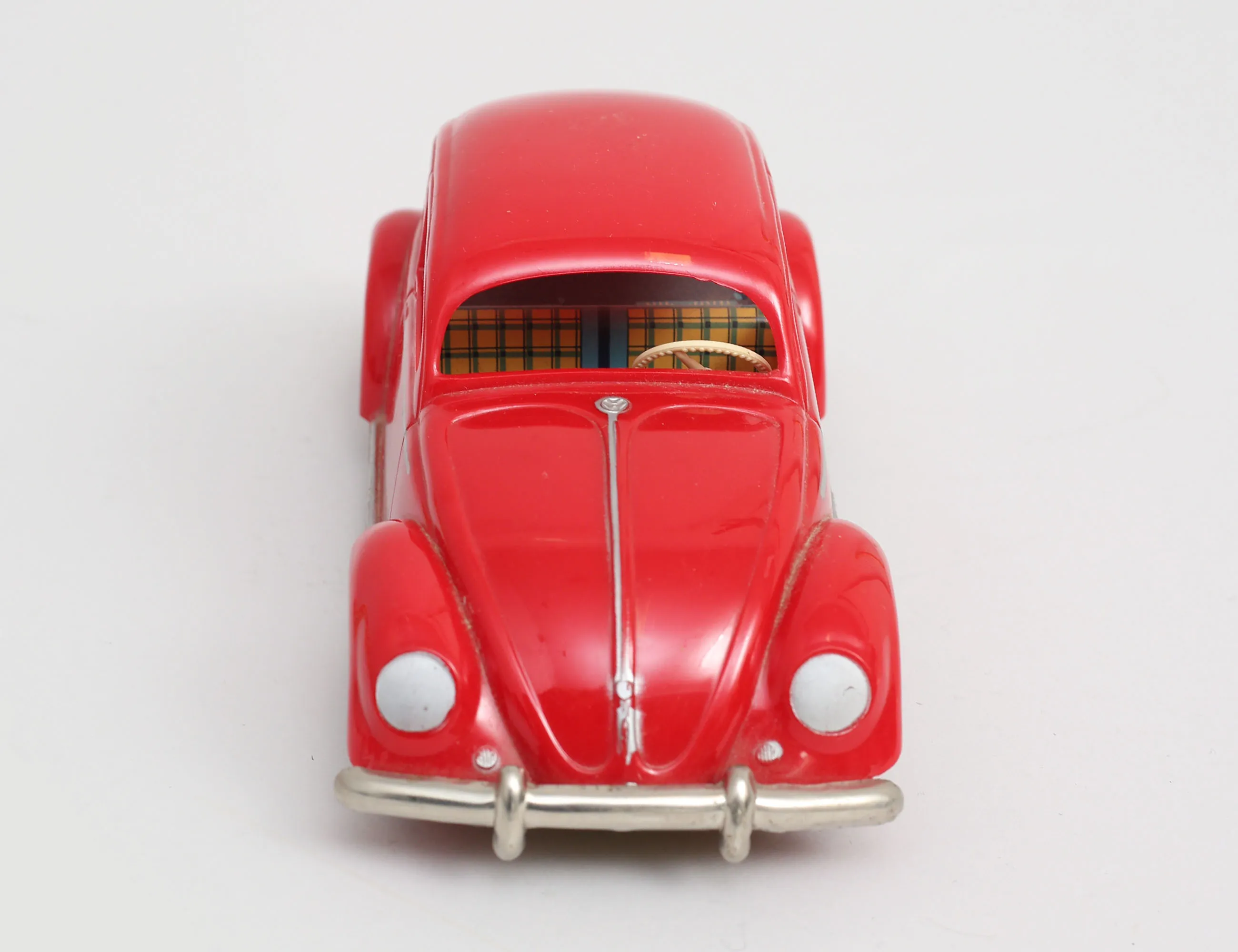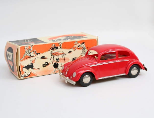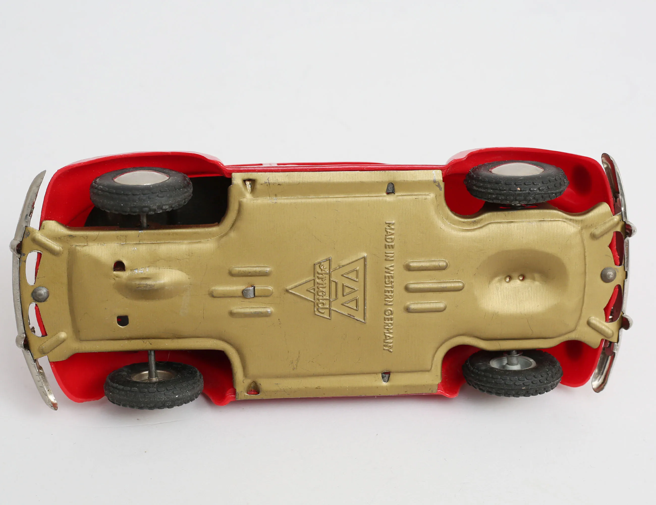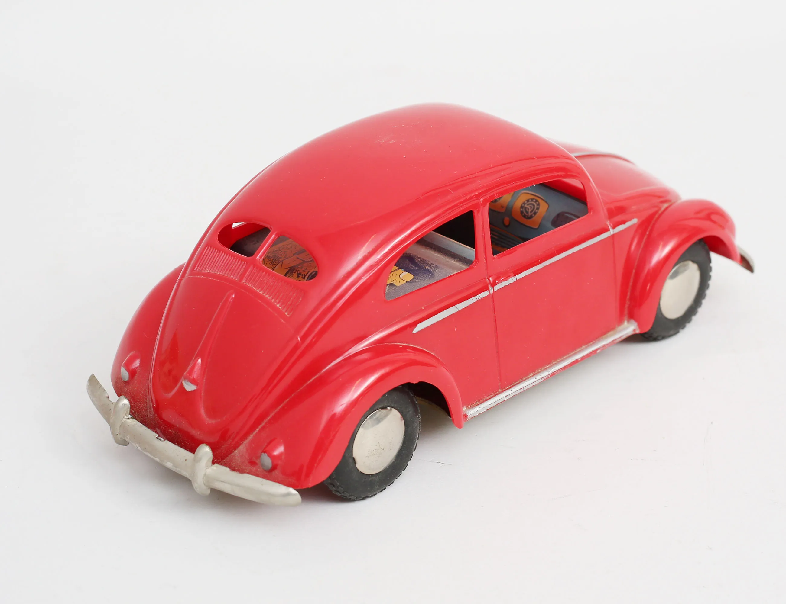 VW4000 "Bubblan", made in Western Germany, rödlackerad plast, insidan med litograferad plåt, friktionsdrift - fungerar vid katalogiseringstillfället, originalkartong, längd 21,5 (kartong med smärre defekter)