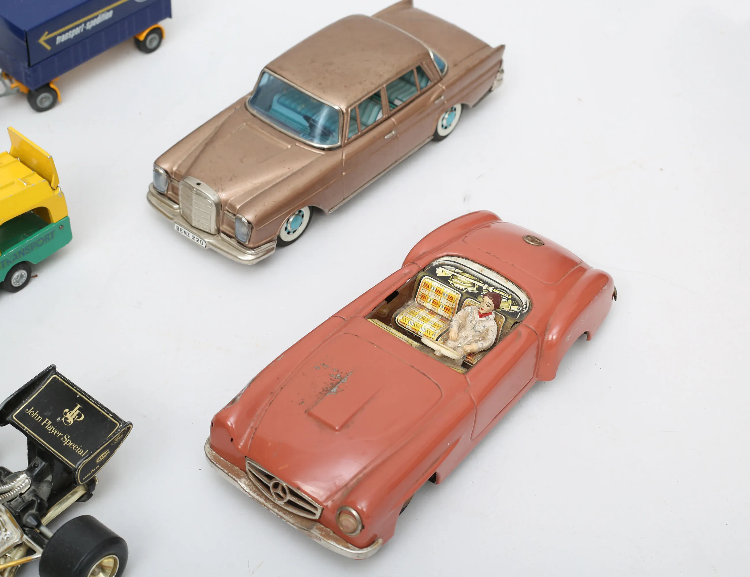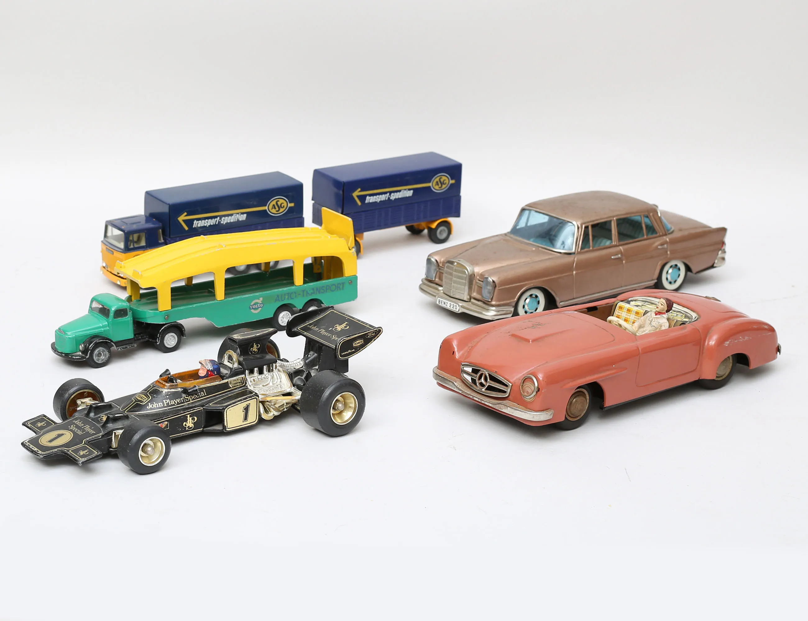 Formel 1 Racing Ronnie samlarbil, Corgi, John Player special Mercedes Benz 220, 1960-tal, Mercedes 190SL made in Western Germany (defekter, sufflet saknas), lastbil Volvo samt ASG, längd ca. 27-31