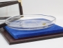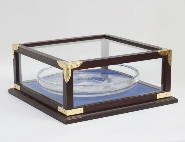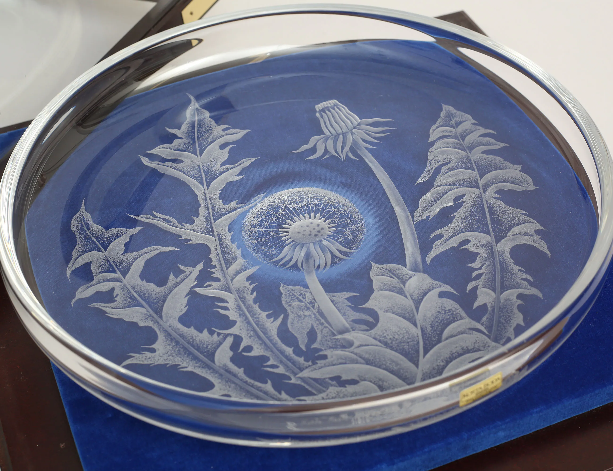 skålfat glas, graverad dekor av maskros, signerad Master Pieces Lisa Bauer 1984/J. Neiklev 108847005, höjd 5,5, diameter 31, i schatull