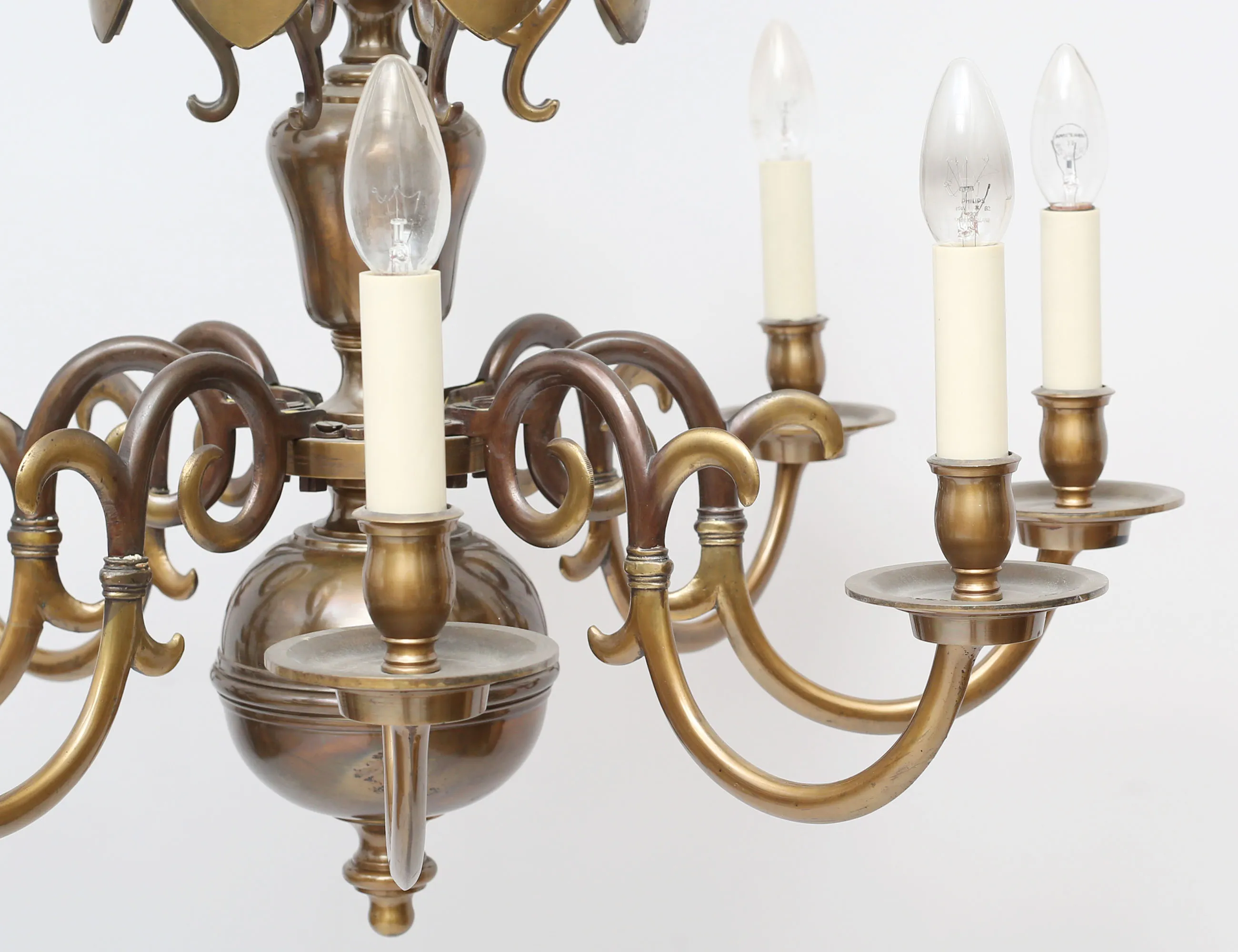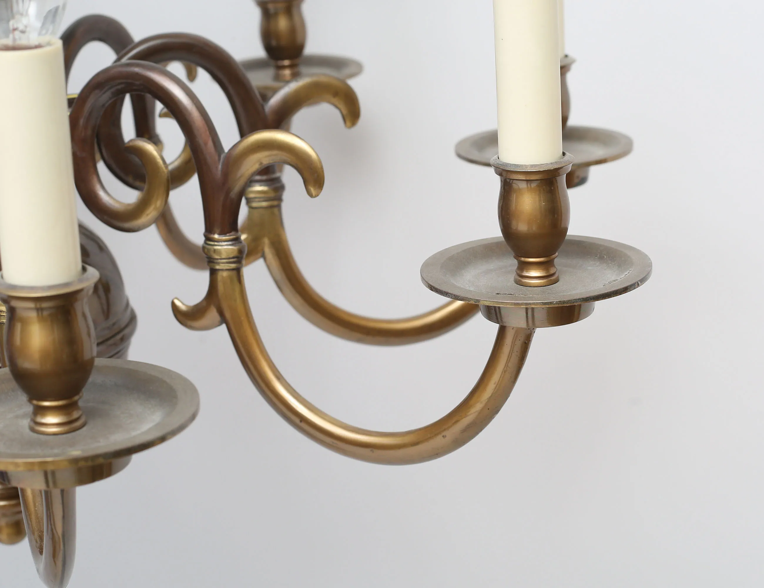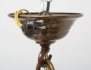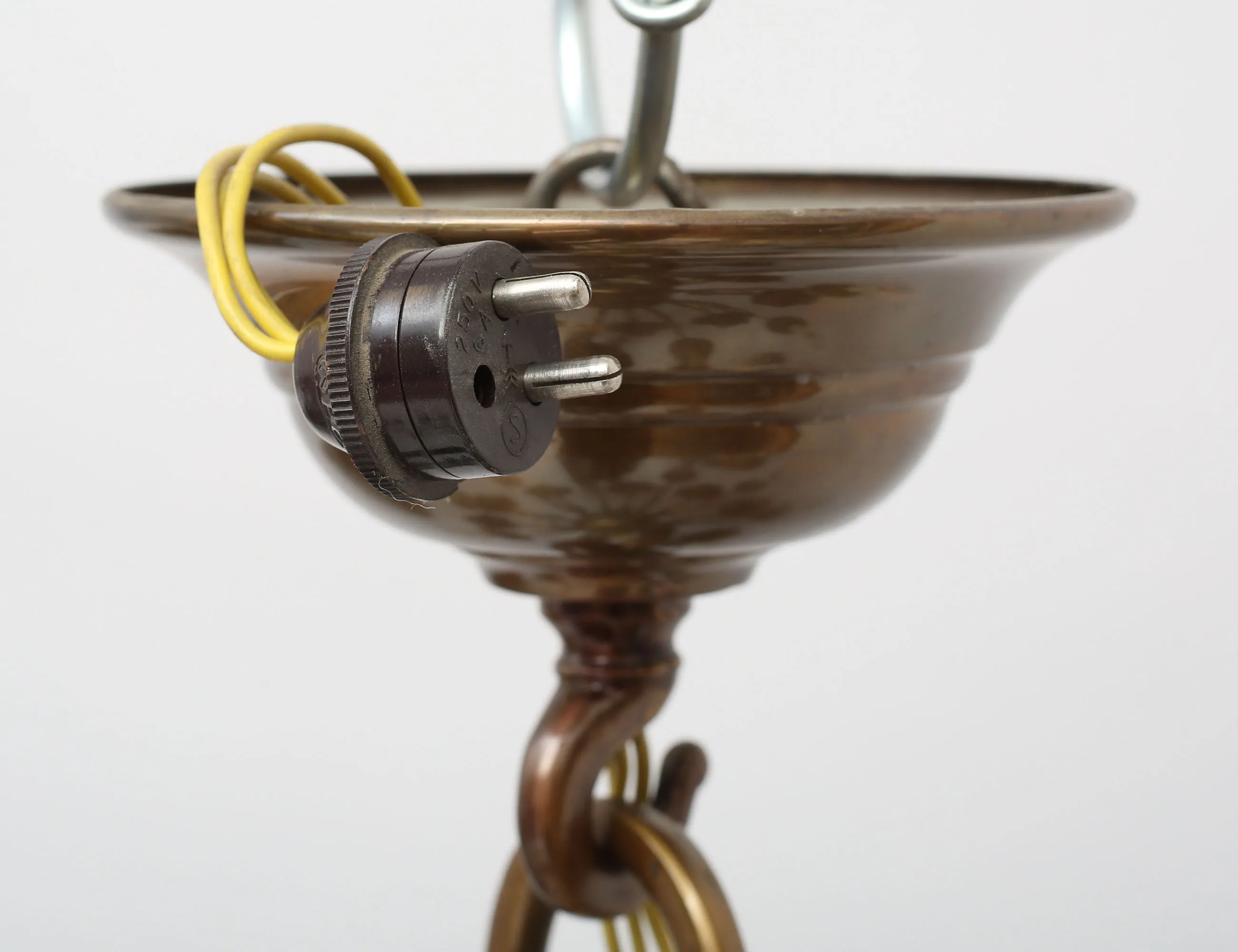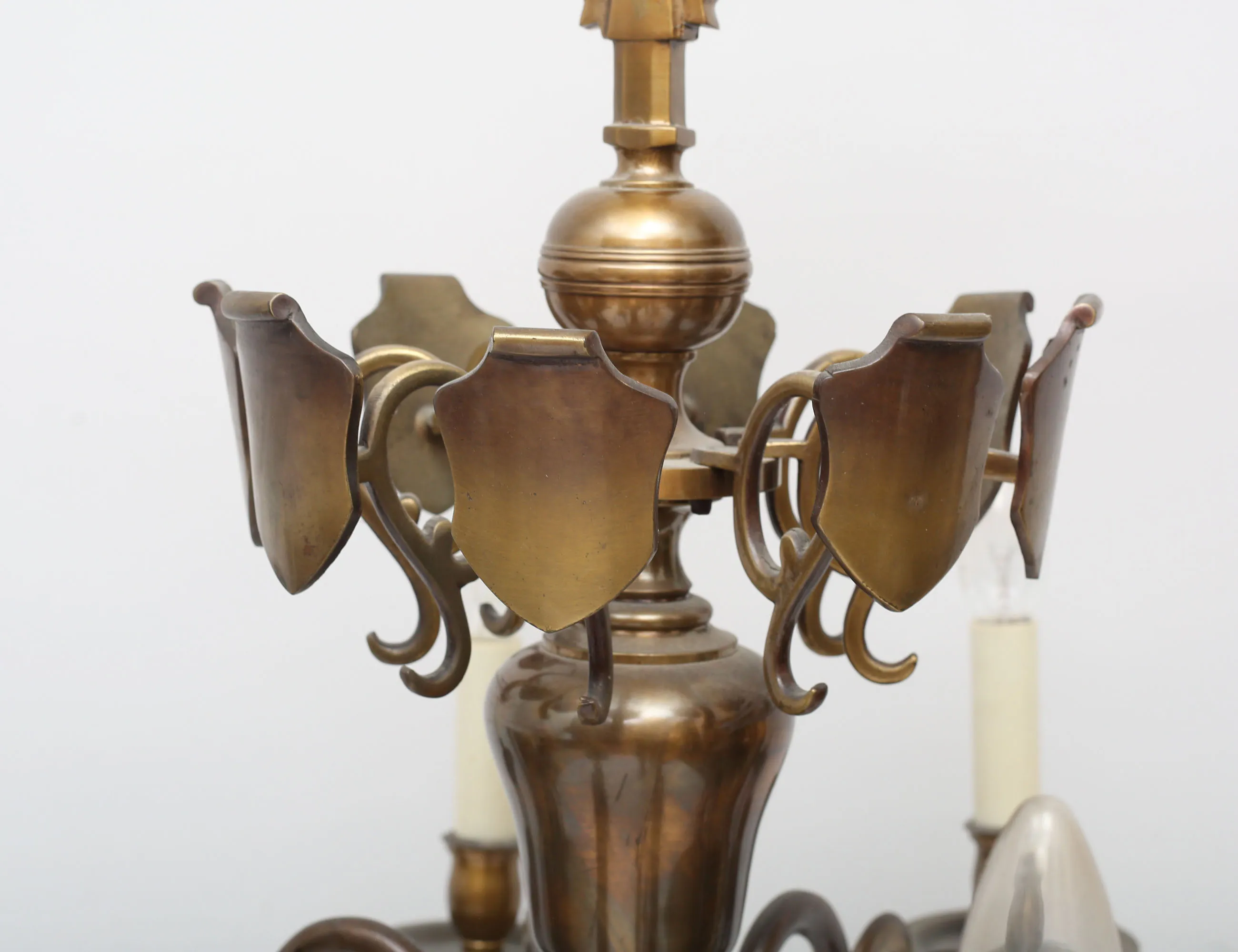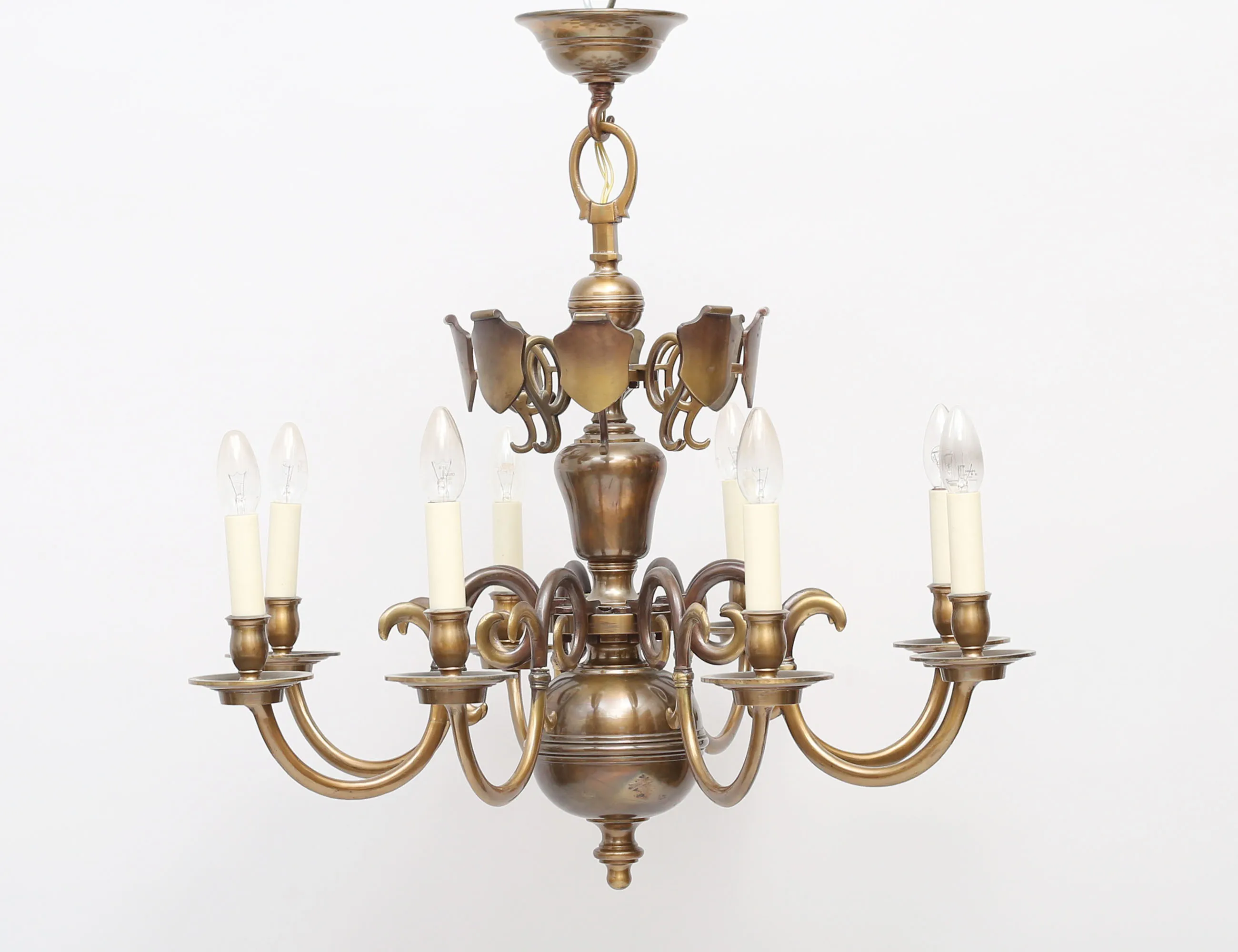 gelbgjuteriarbete i patinerad massiv malm, 8 ljusarmar, sköldformade reflektorer, senare elektrifierad, höjd 70, diameter 70