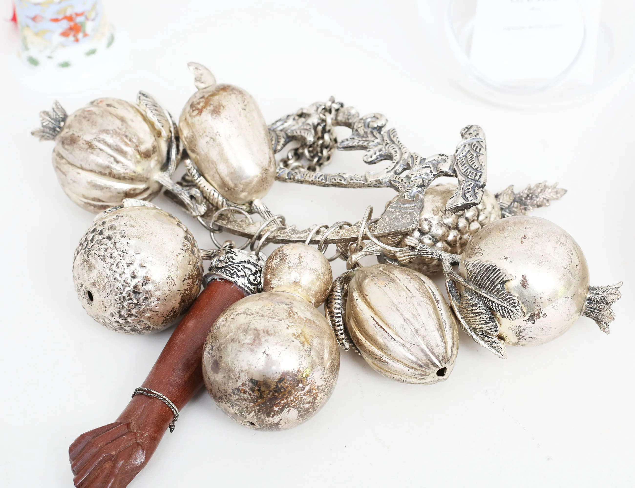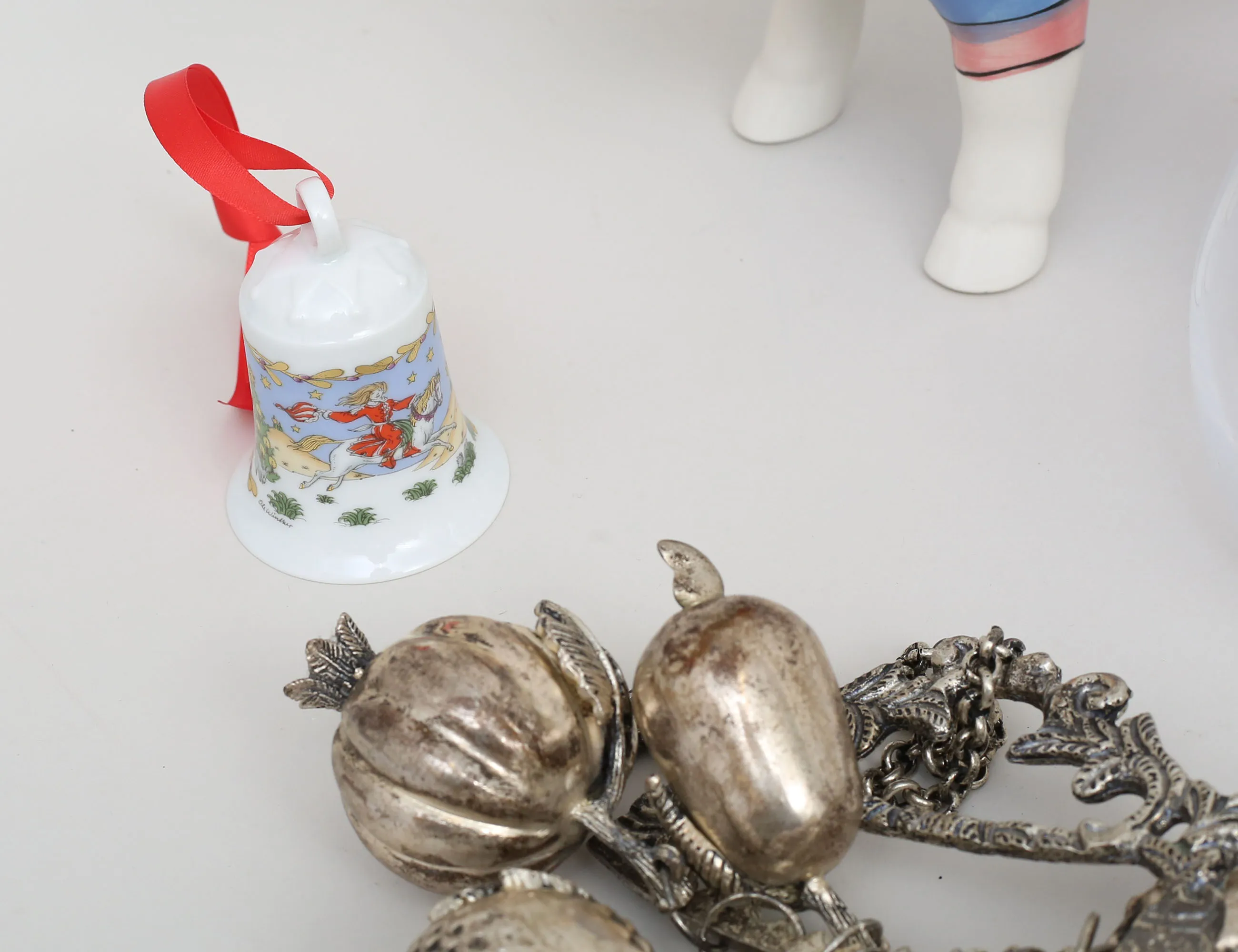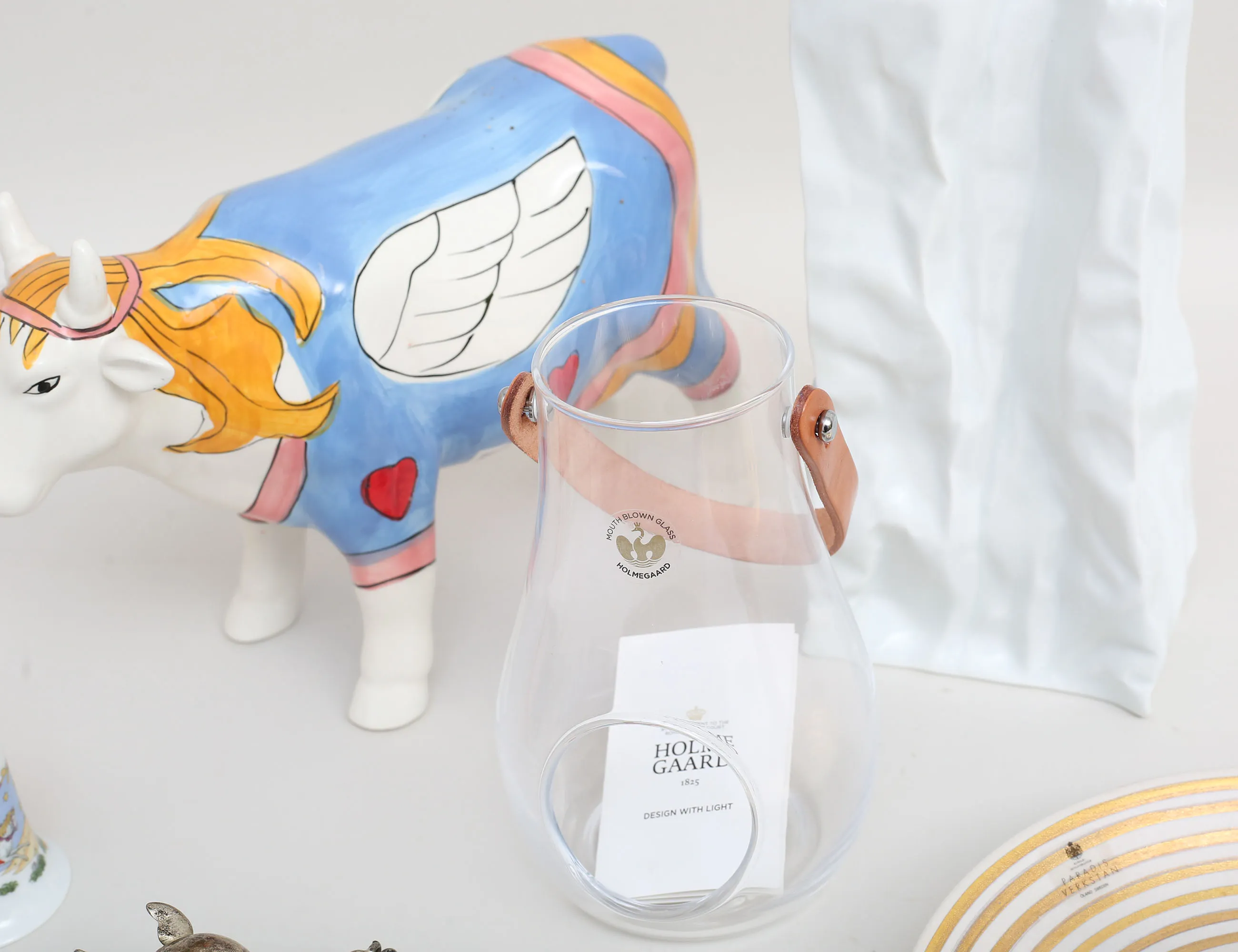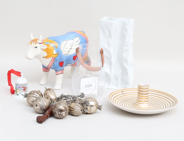 design With Light Danmark, glas med läderhandtag, höjd 16, dörrkläpp vitmetall, mellaneuropa, höjd 27, ljusstake Paradisverkstaden Öland, höjd 8, diameter 20, vas Rosenhtal Studio Line, höjd 22, bjällra Tyskland, porslin, höjd 7, figurin ko, höjd 18