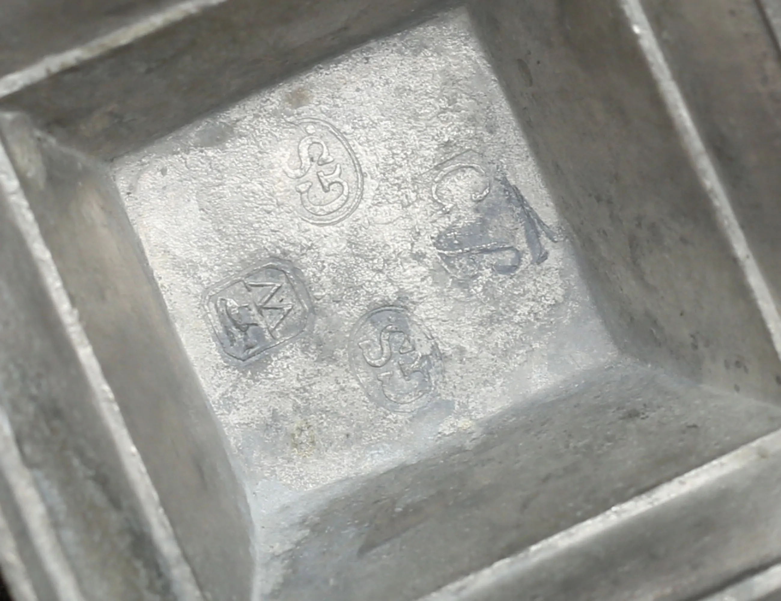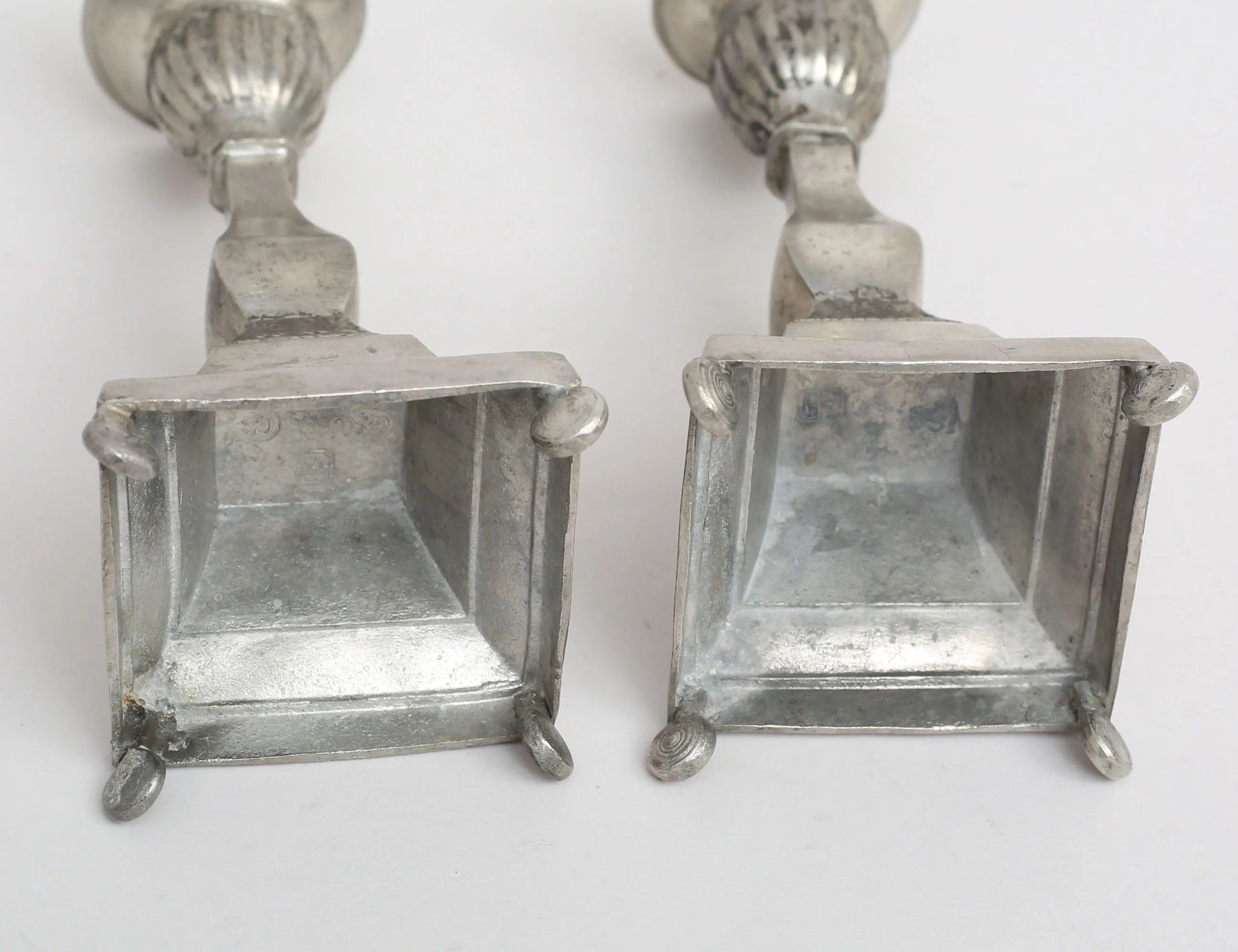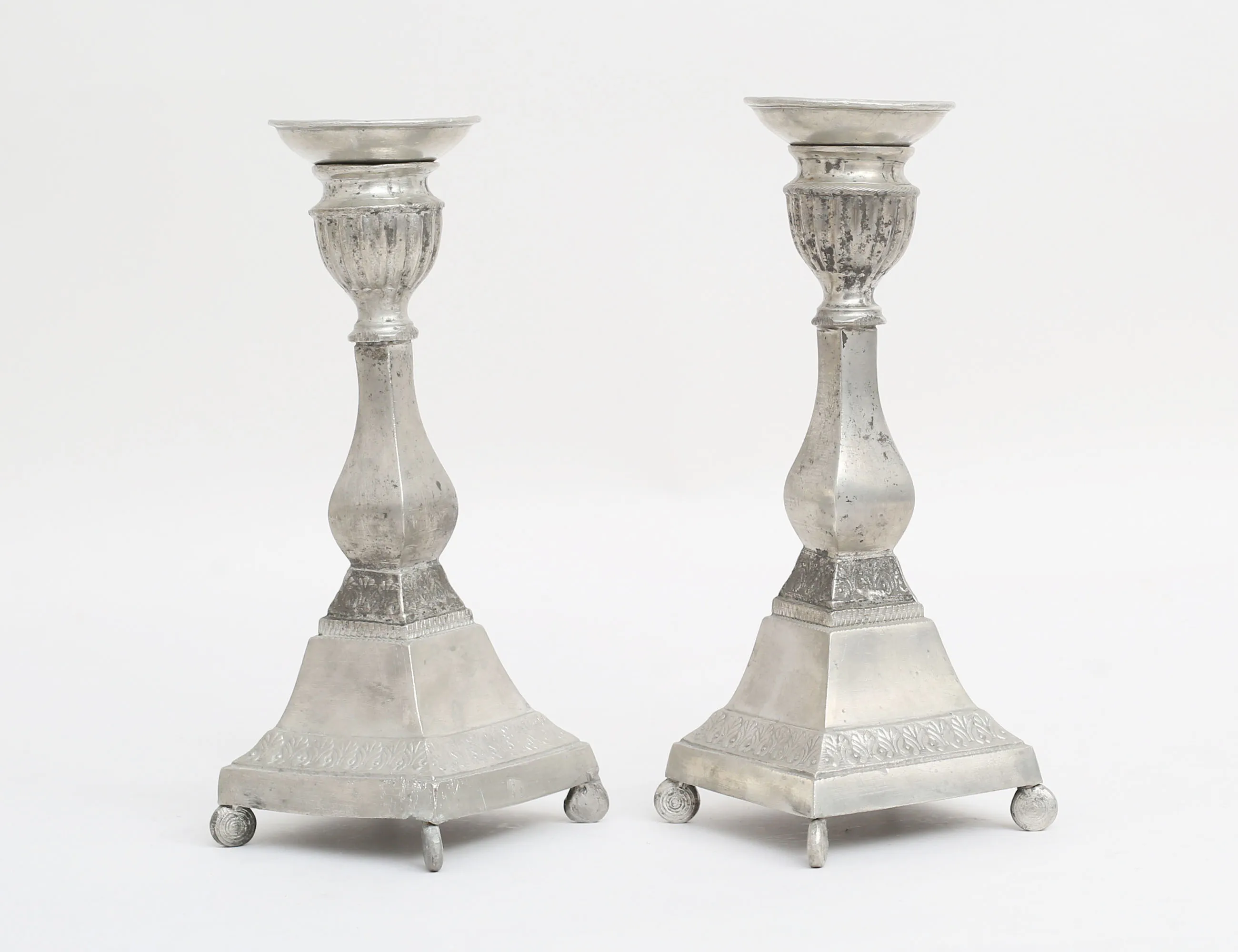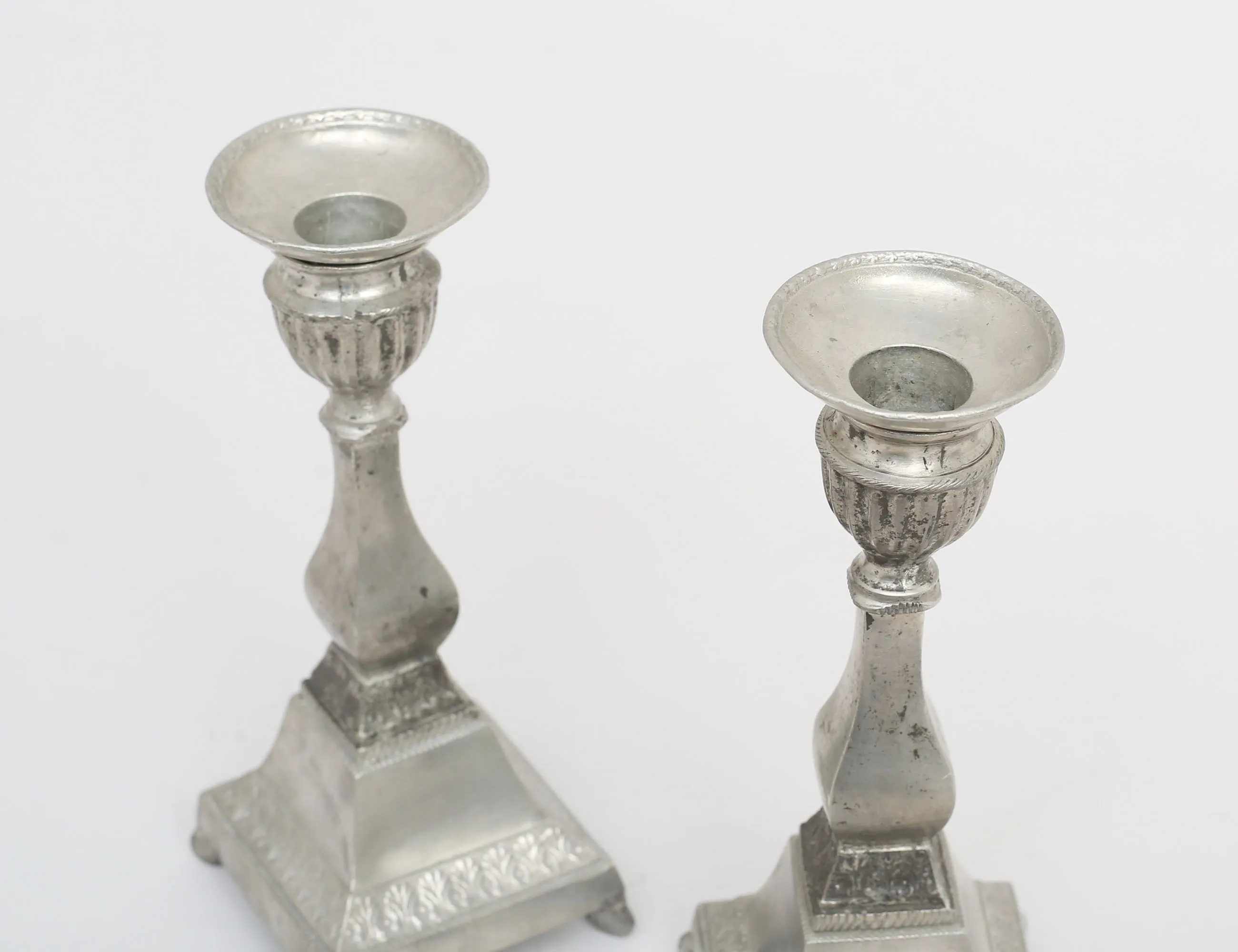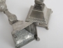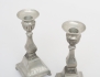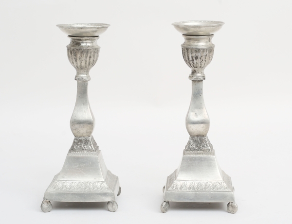 Gustav Silov Vimmerby 1873, tenn, kvadratisk fot på linsfötter, stansad dekor, urnformad ljushållare, lösa manschetter, höjd 18,5