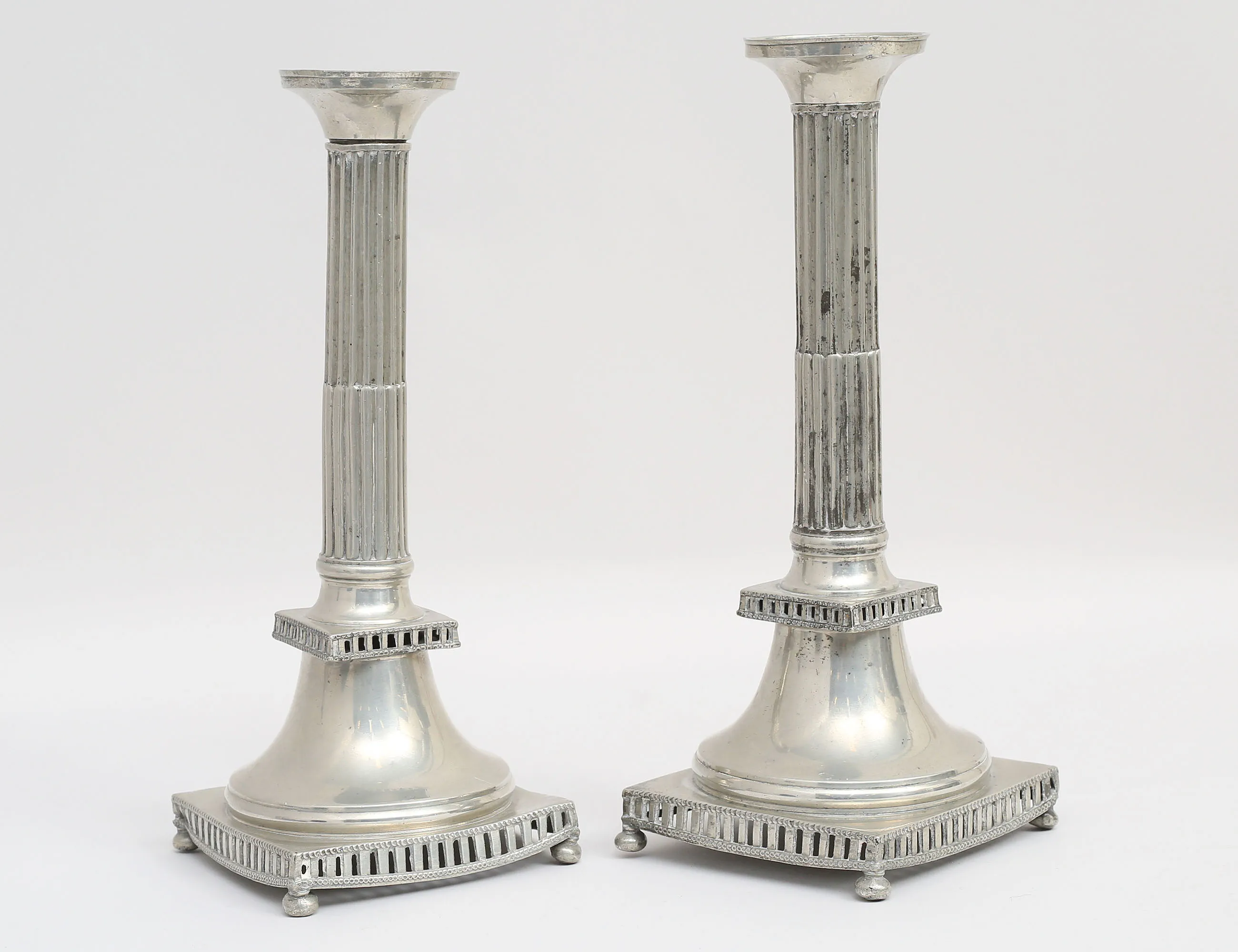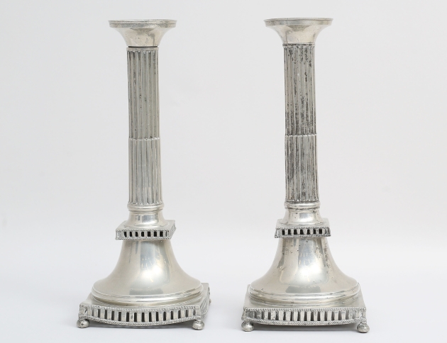 Nicolaus Justelius Eksjö varav en 1799 respektive 1800, tenn, kvadratisk fotplatta med galler på kulfötter, räfflad stam, lösa ljusmanschetter, höjd 29 (en ljusstake sned, en kulfot sned)