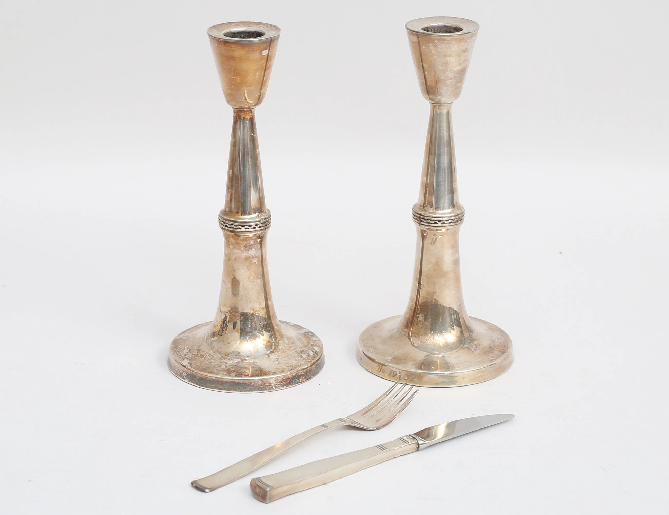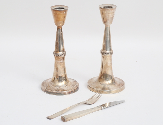 Swedish Modern, Ceson Göteborg 1954, liv med vågbandsdekor, fyllda bottnar, höjd 19,5, smörgåsbestick 1 par silver, Rosenholm