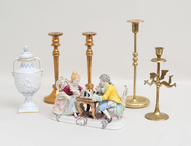 1 par samt 1+1 1900-talets andra hälft, höjd 25, 30, 23, lockurna Porzellanfabrik Sandizell Höffner & Co Tyskland, höjd 23, figurin schackspelare, höjd 16, bredd 25x10 (en hand saknas)