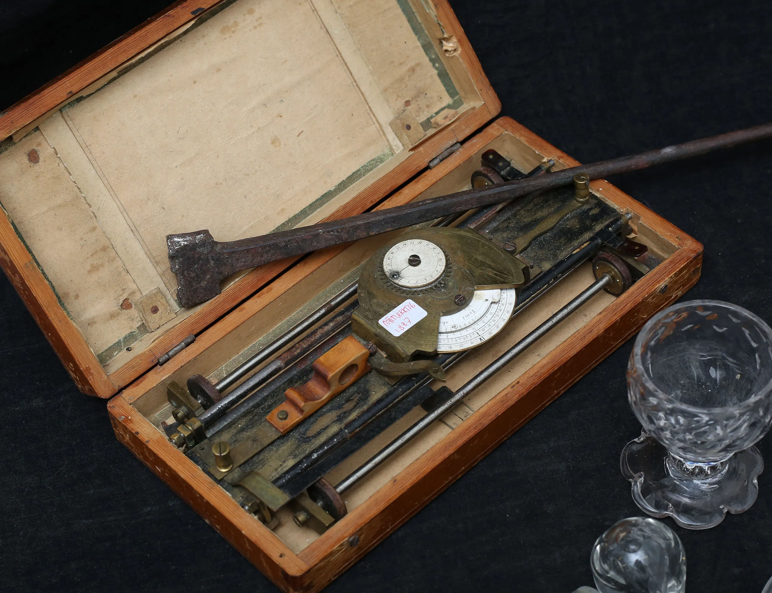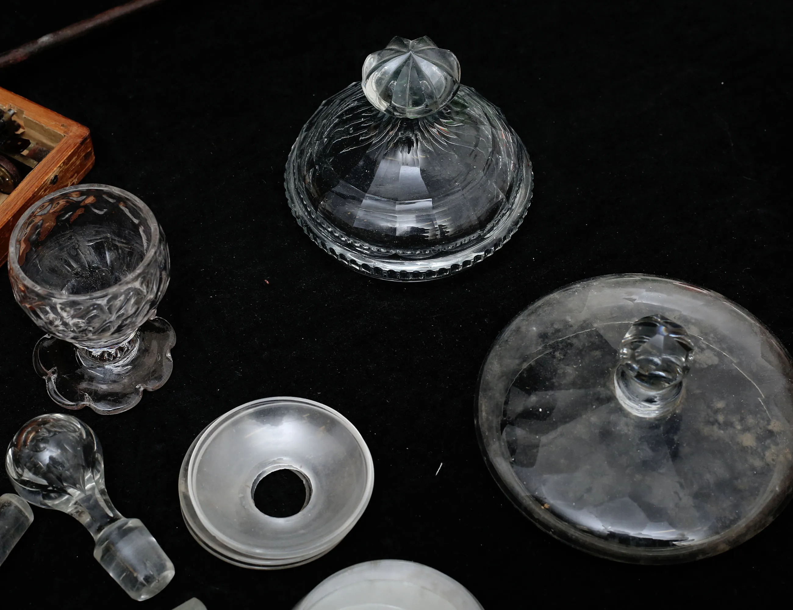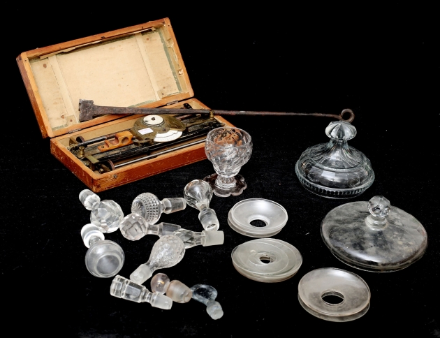 i schatull, brännjärn för bomärke 17/1800-tal gjutjärn, längd 40, proppar, ljusmanschetter, skål på fot höjd 7, lock till pokaler antika, proveniens: Neumans Antikhandel Stockholm