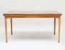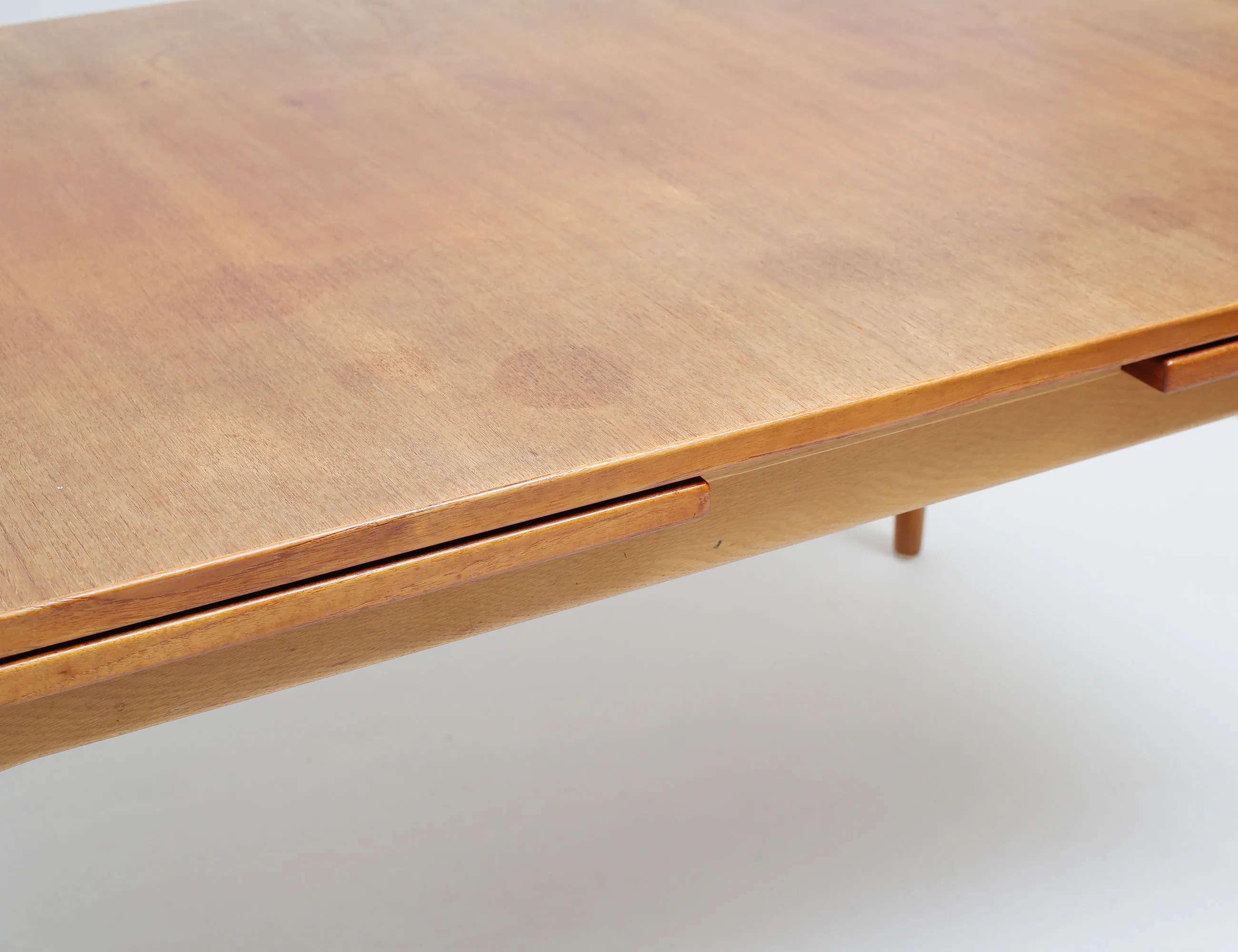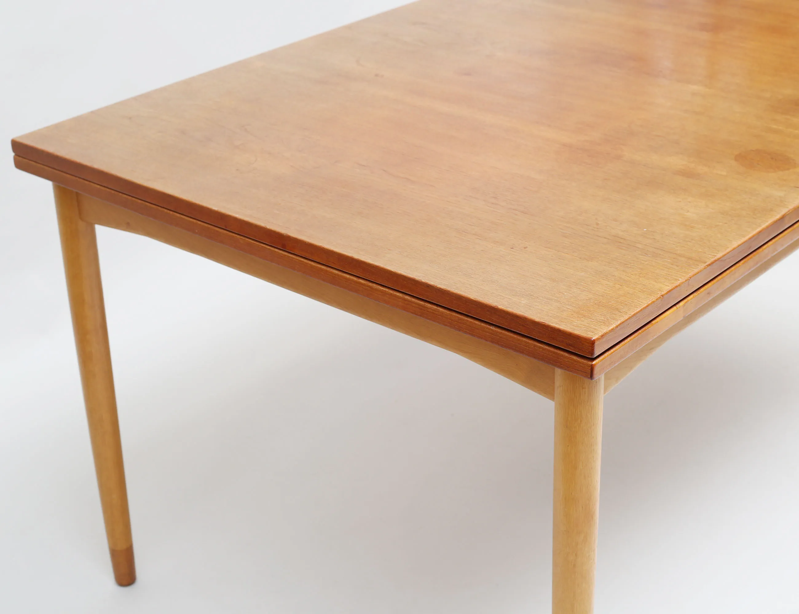 teak och ek, två integrerade utdragbara skivor, höjd 73, bredd 93, längd 140-250 (skivan med smärre fläckar)
